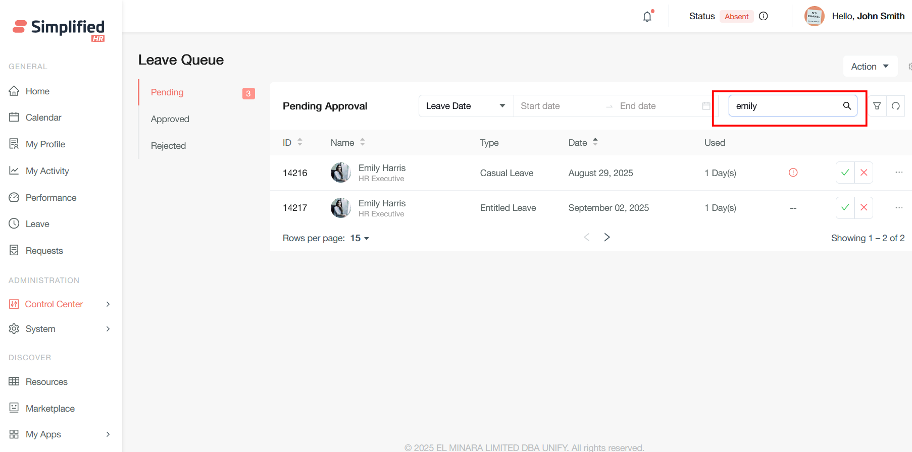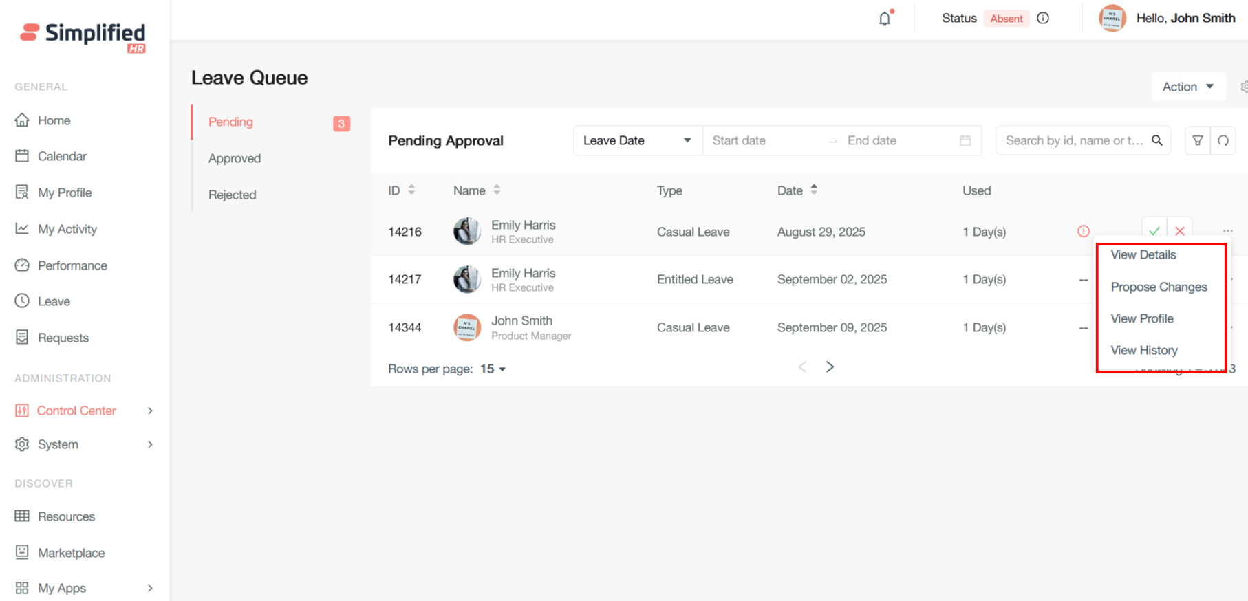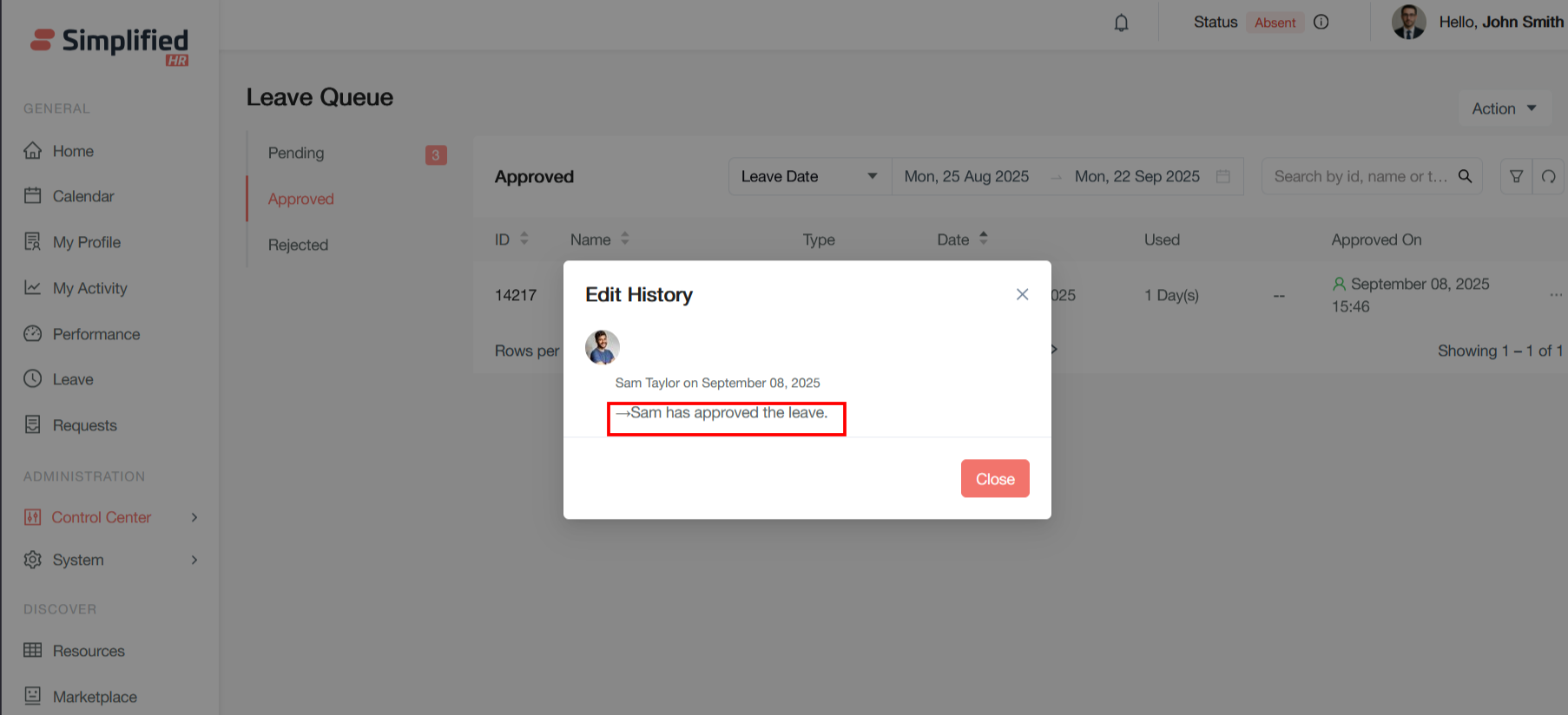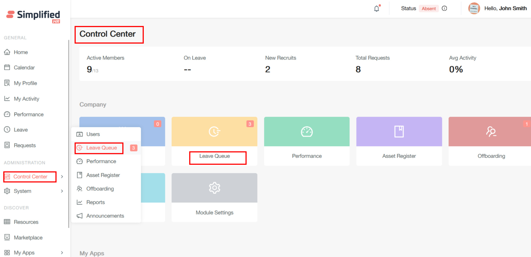 When you receive a leave request, it will show up as a notification in your control center. From the Simplified HR Home Page, navigate to the Control Center then Leave Queue. Alternatively, click the Leave Queue tile from the Control Center screen.