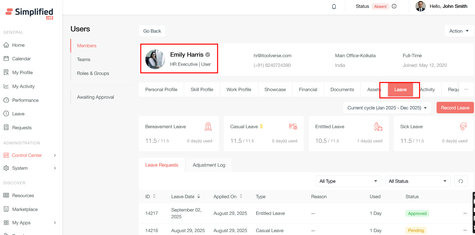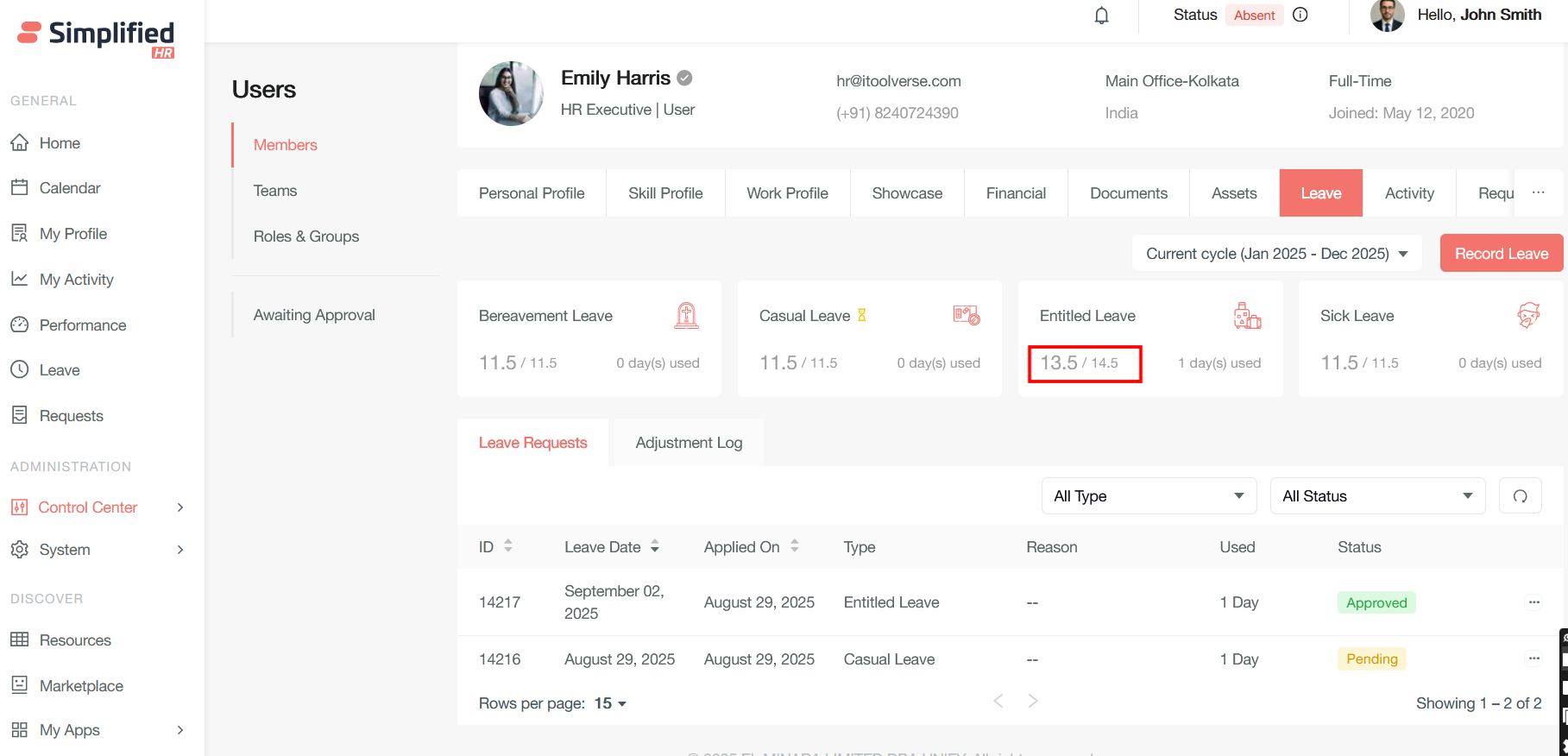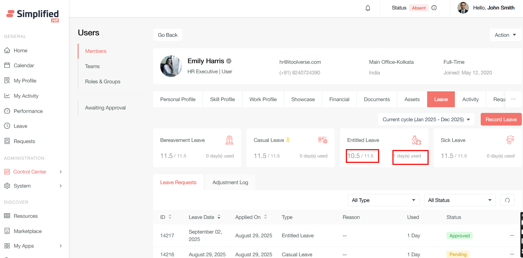 Admin can apply leave on behalf of the user and also check the leave balance and adjust the same.
