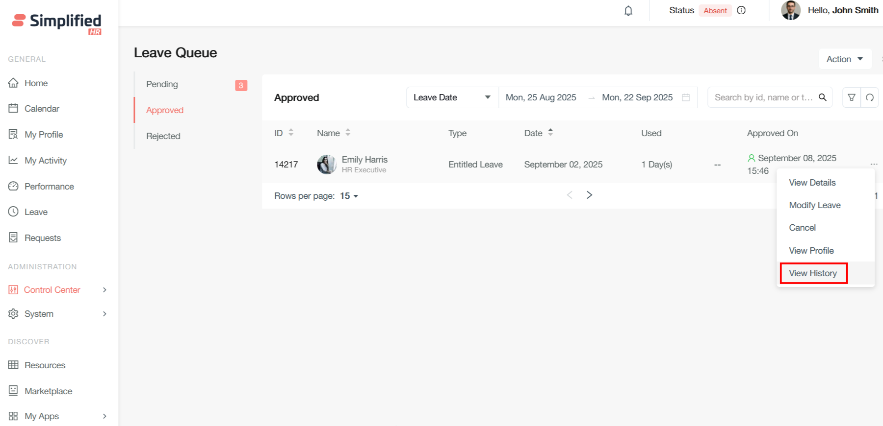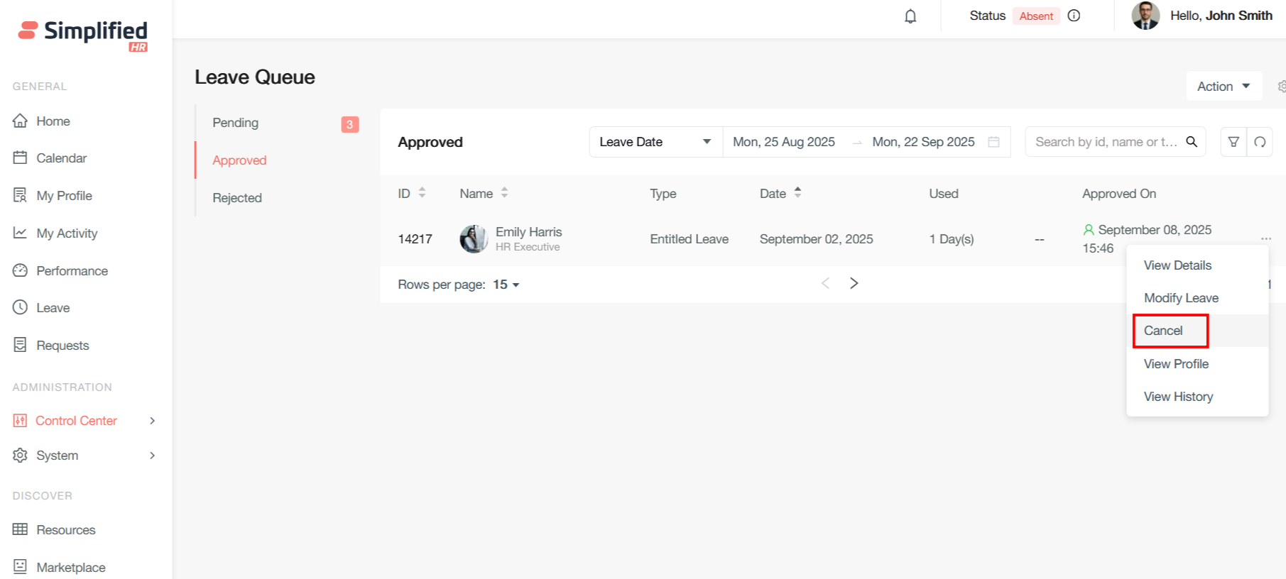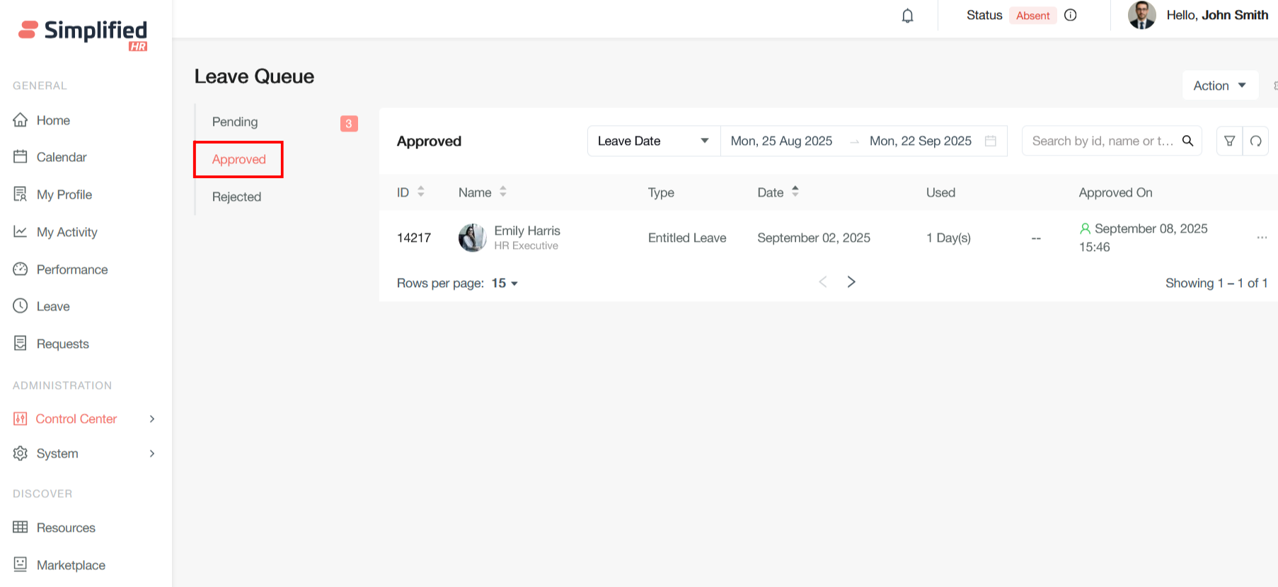 Once the leave is approved, the corresponding leave will be shown is Approved leave queue