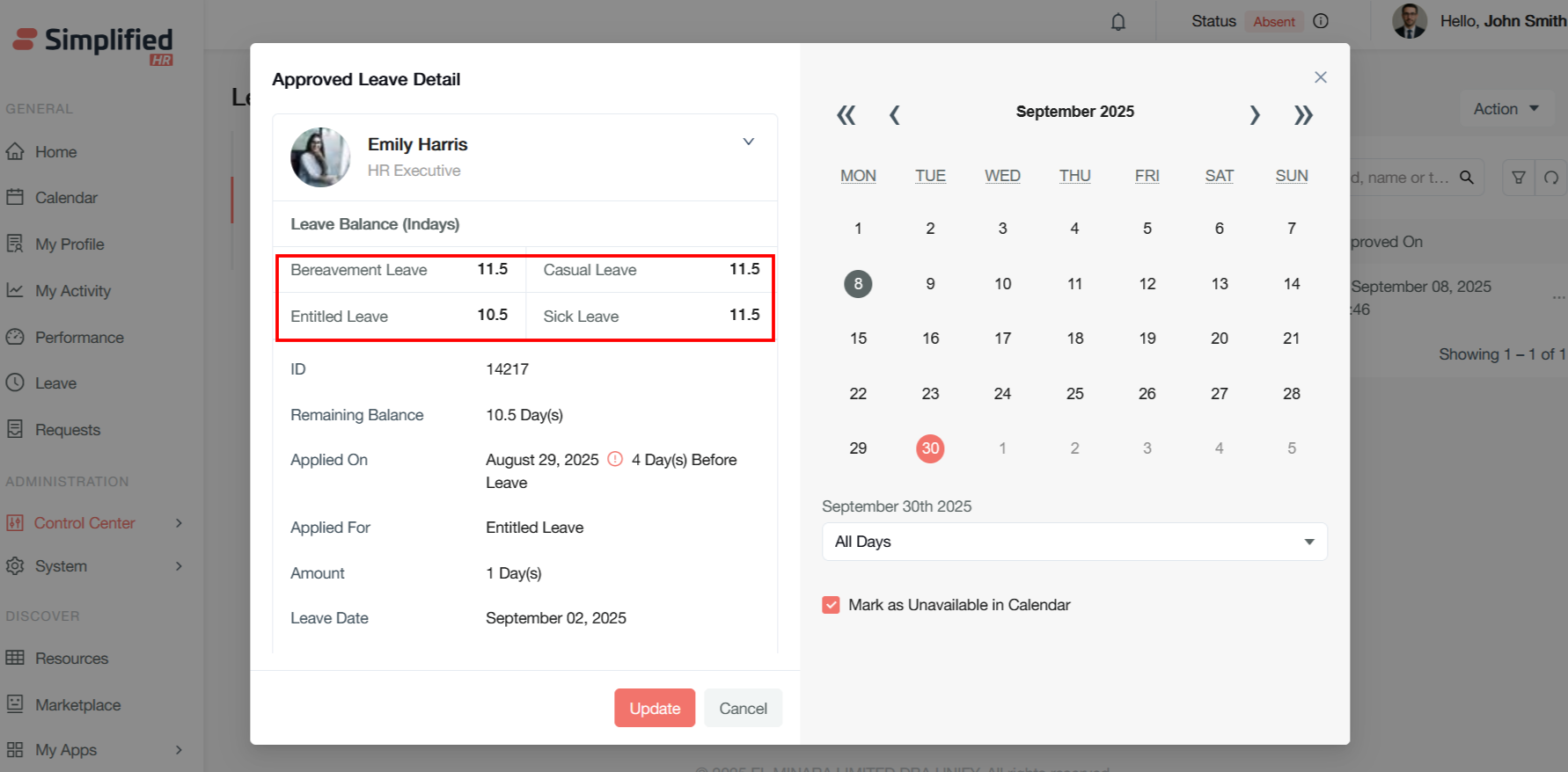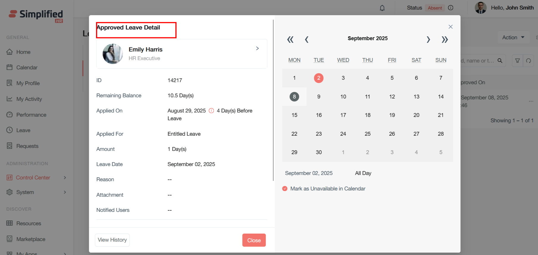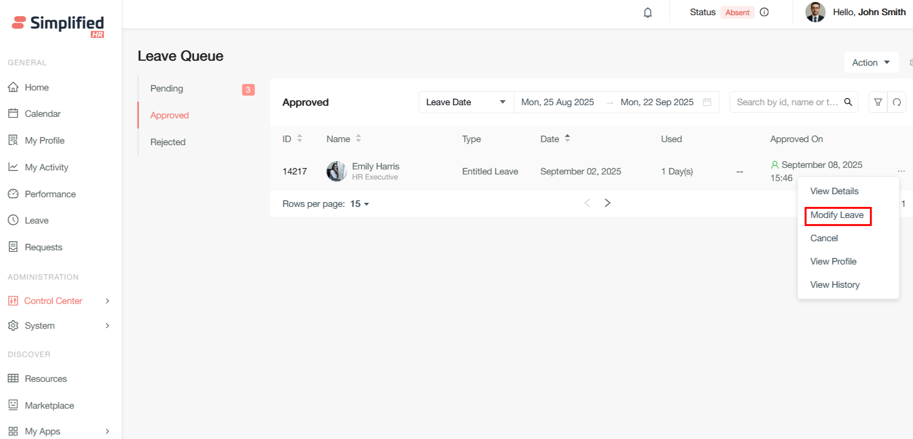 From here, the approved leave can be modified by clicking on the modified leave
