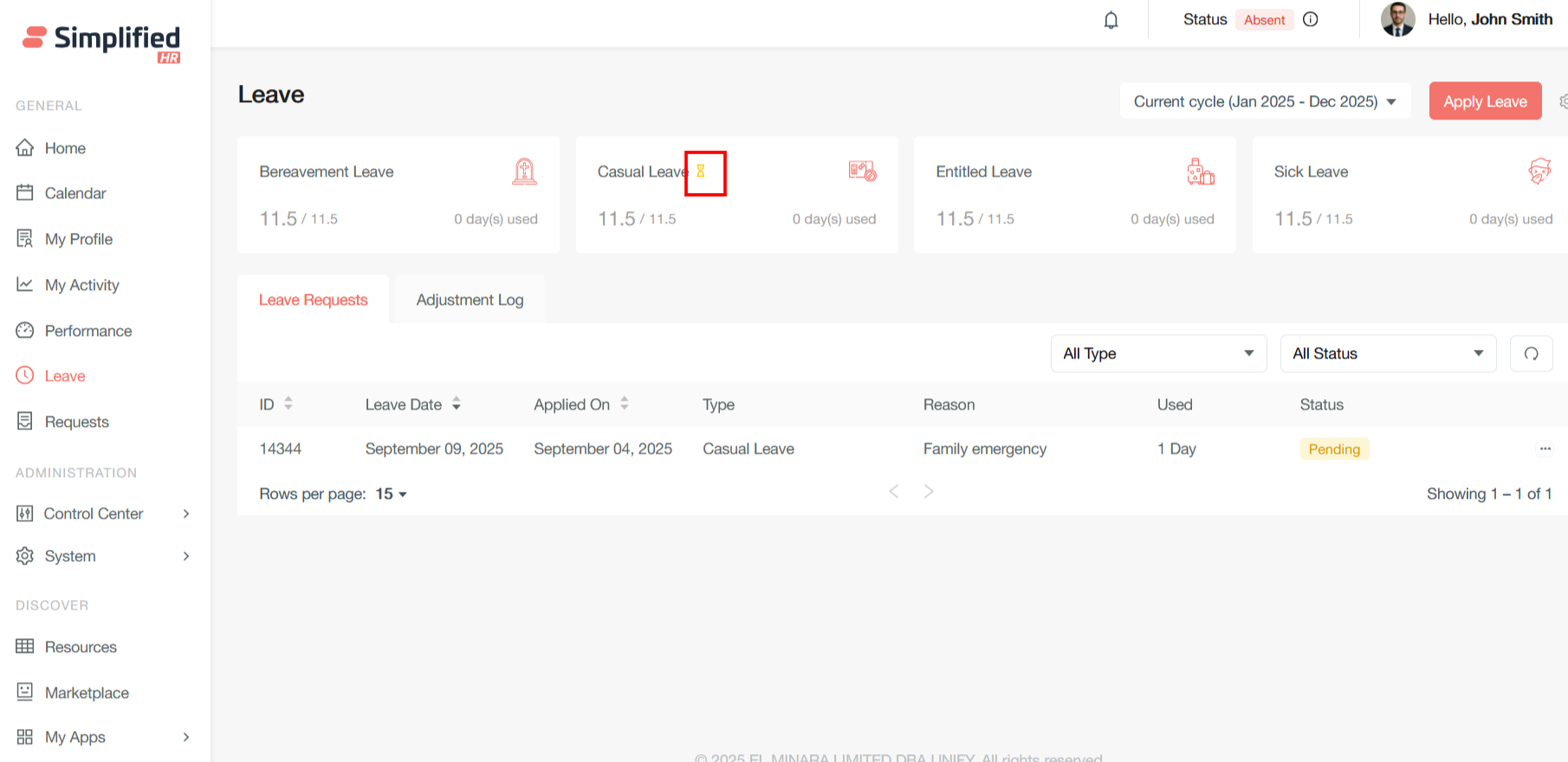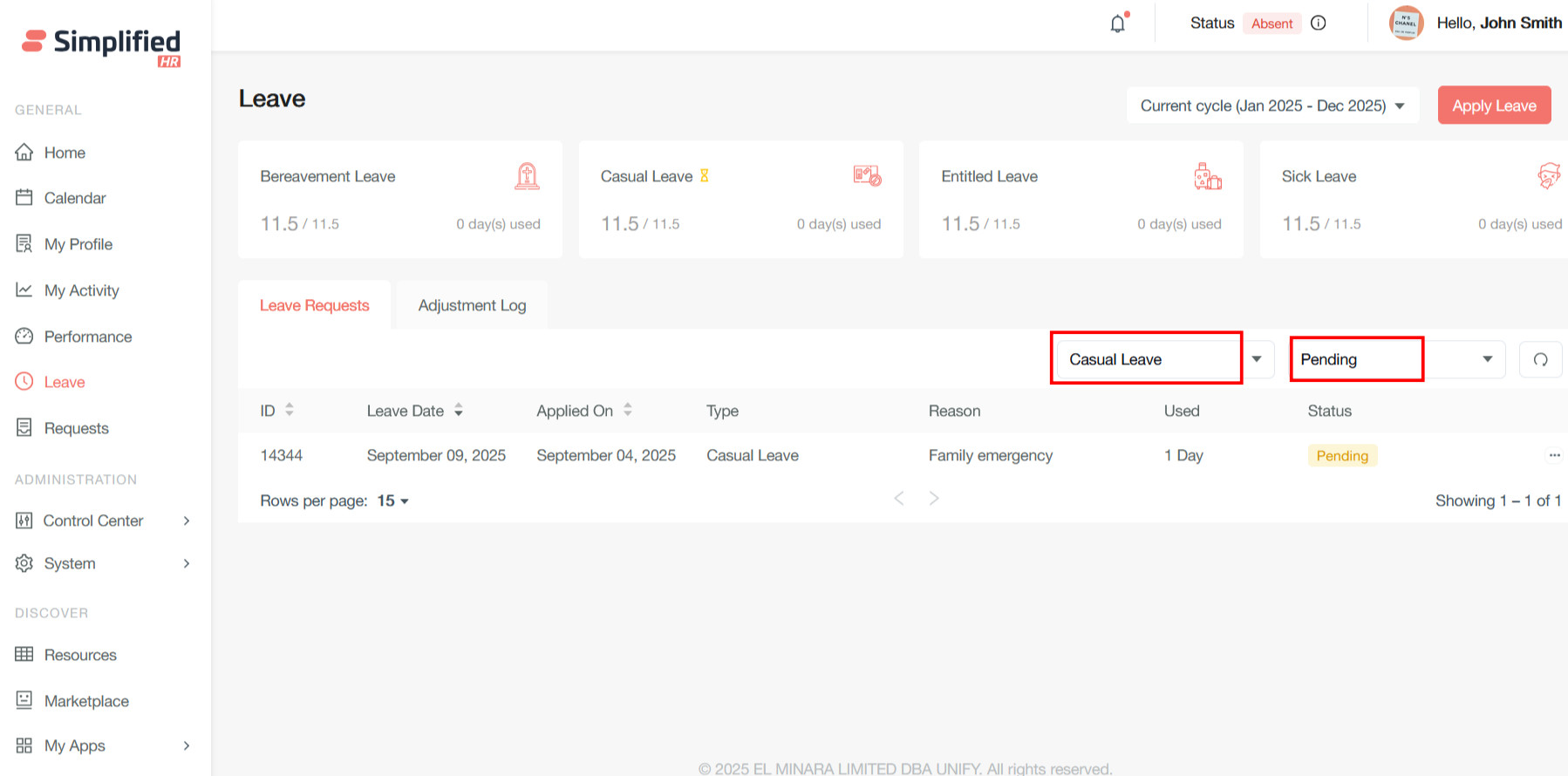 After you apply for the leave, the leave request will be displayed in the user leave dashboard where you can filter with the leave type and status.