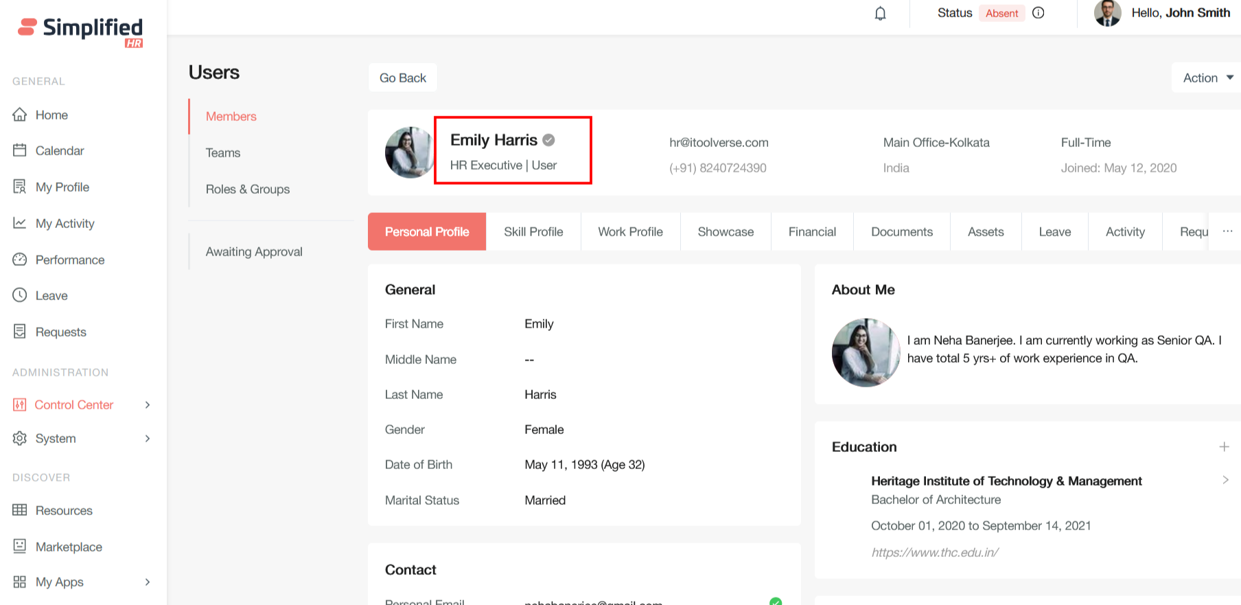 Navigate to the Control center User section and view the user profile