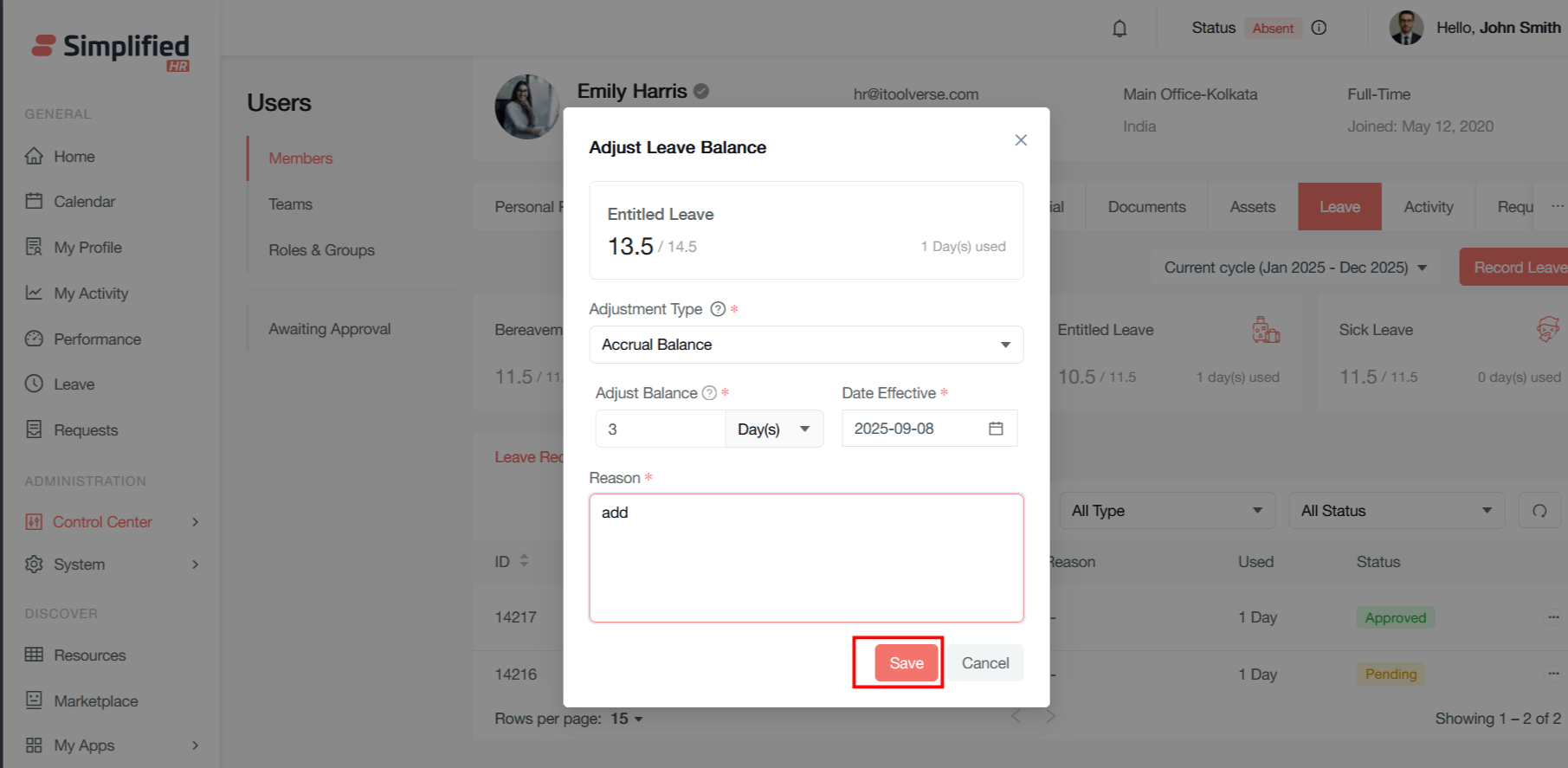 Now click on the the save button to adjust the leave balance