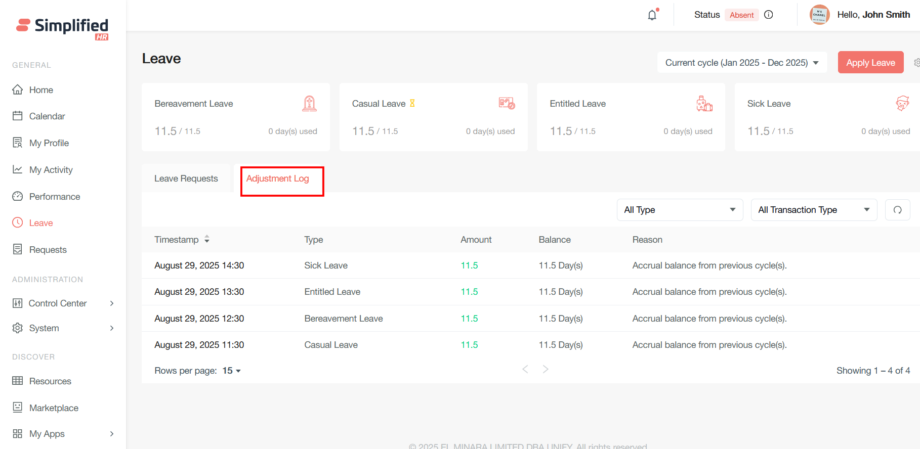 The adjustment log tab serves as a comprehensive transaction ledger that records and displays all leave balance modifications for employees across different leave types. This tab provides complete visibility into how leave balances are calculated through credits and debits as follows: