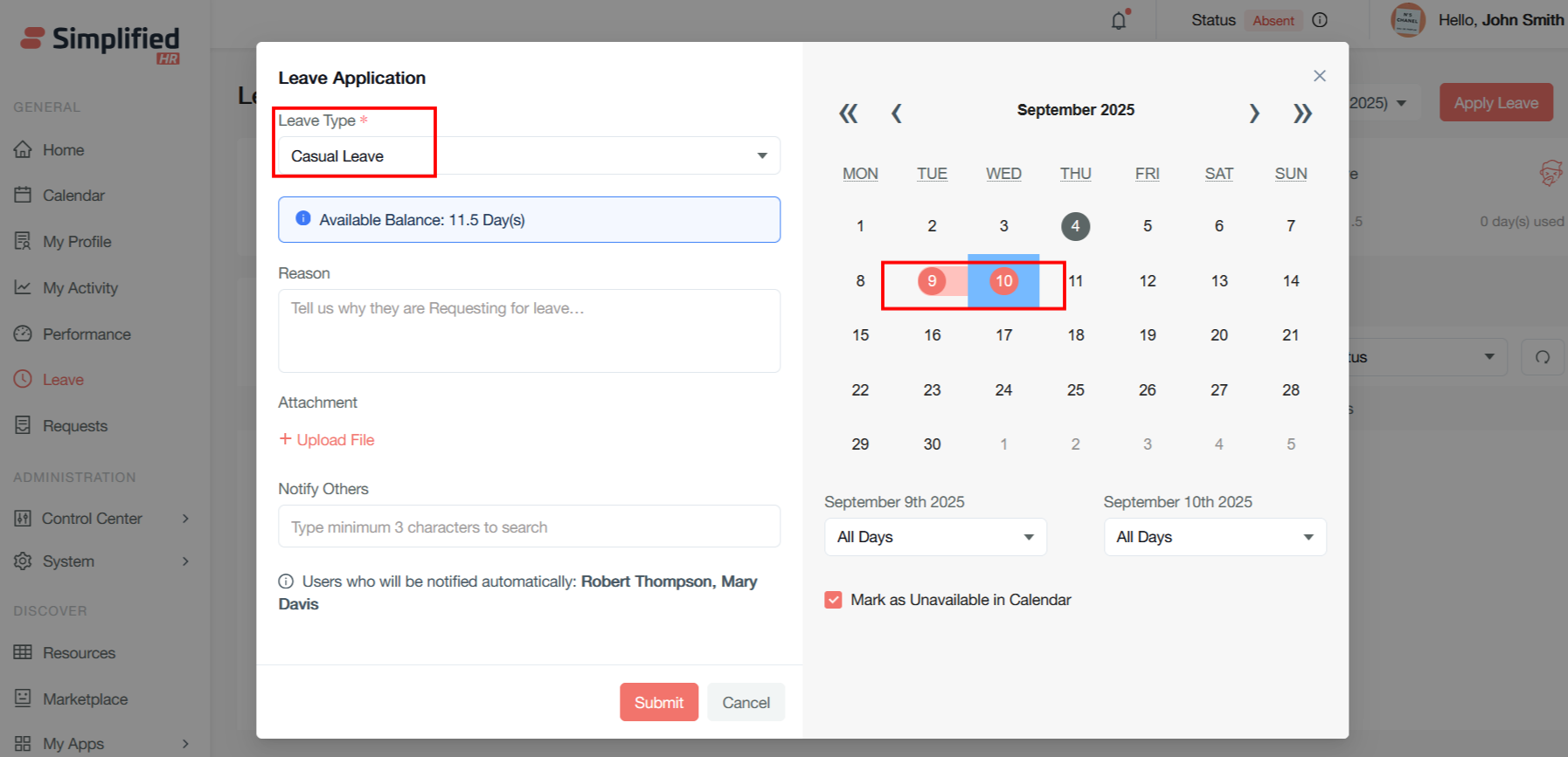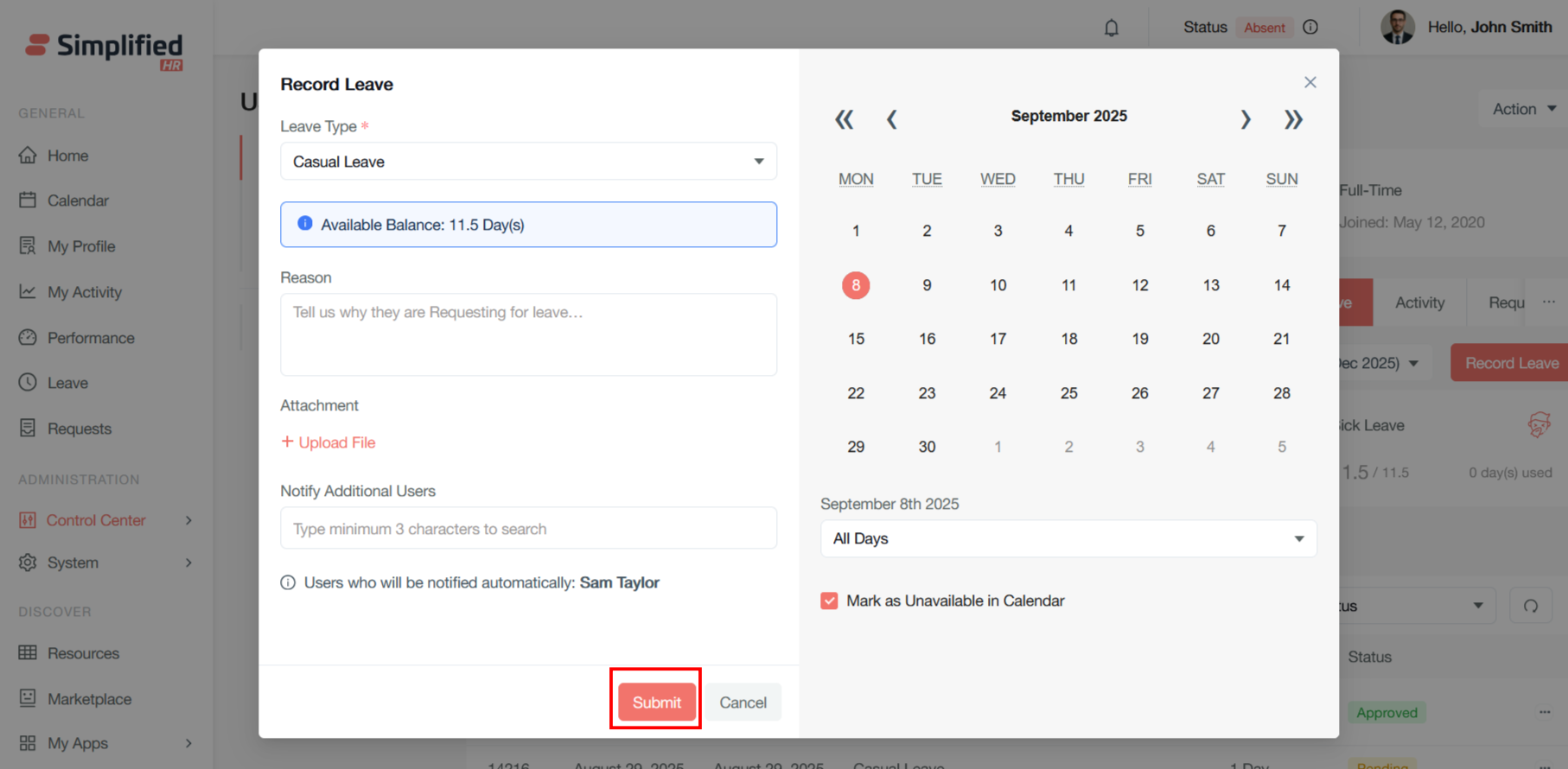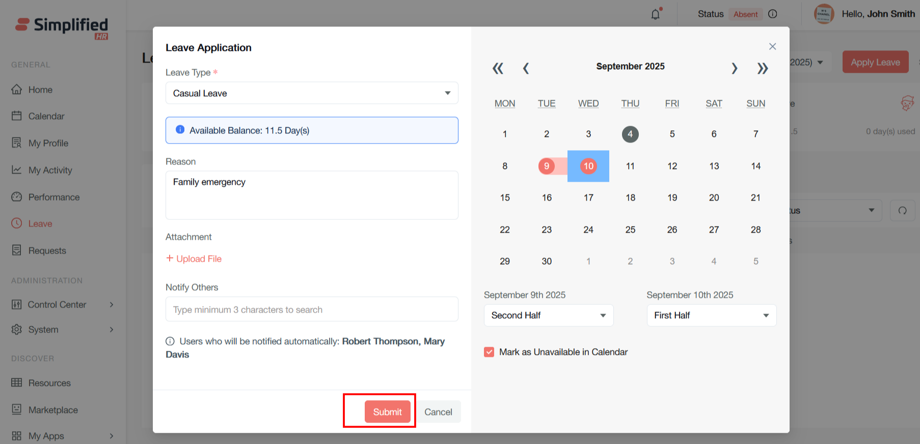 It will open the same modal for leave apply as in the user dashboard. Follow the same process to apply the leave by clicking on the Submit button.