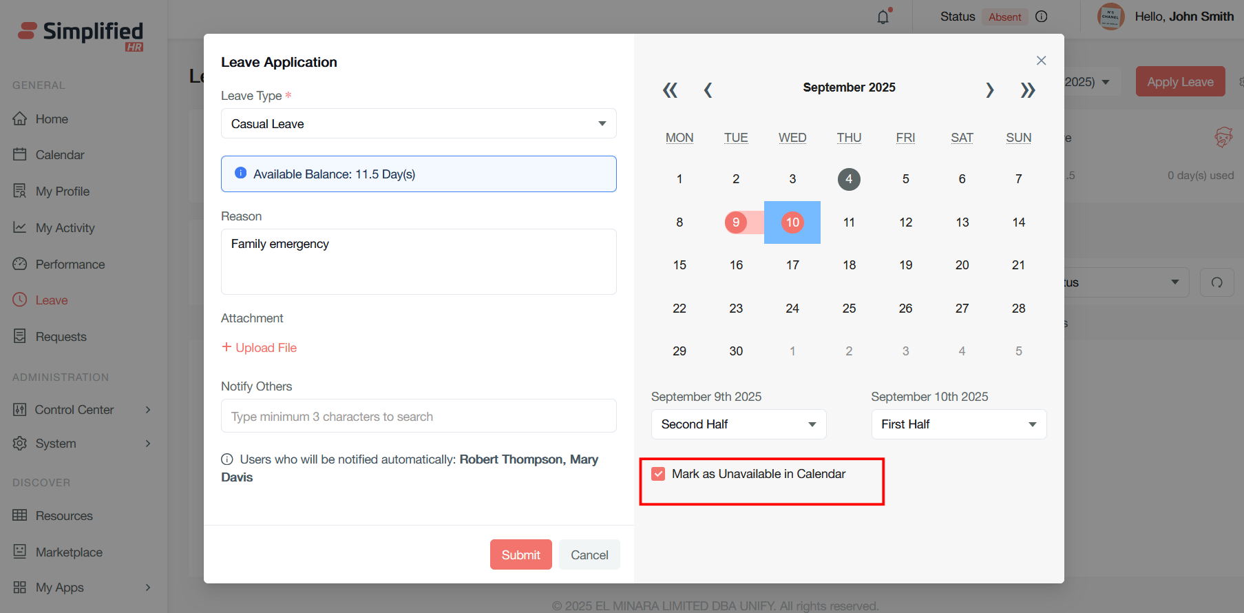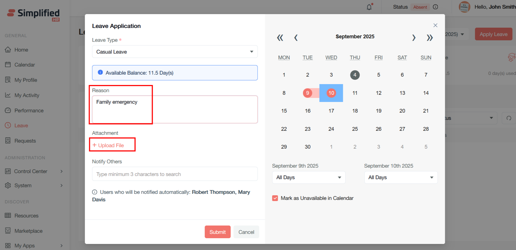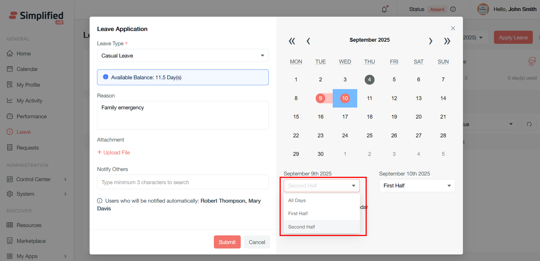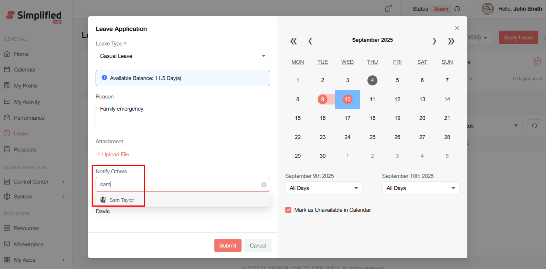 It will open the same modal for leave apply as in the user dashboard. Follow the same process to apply the leave by clicking on the Submit button.