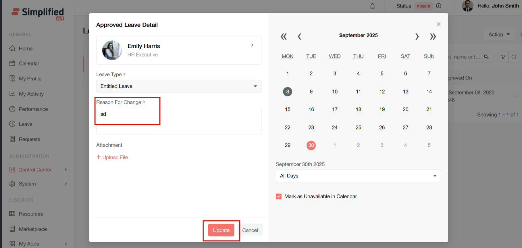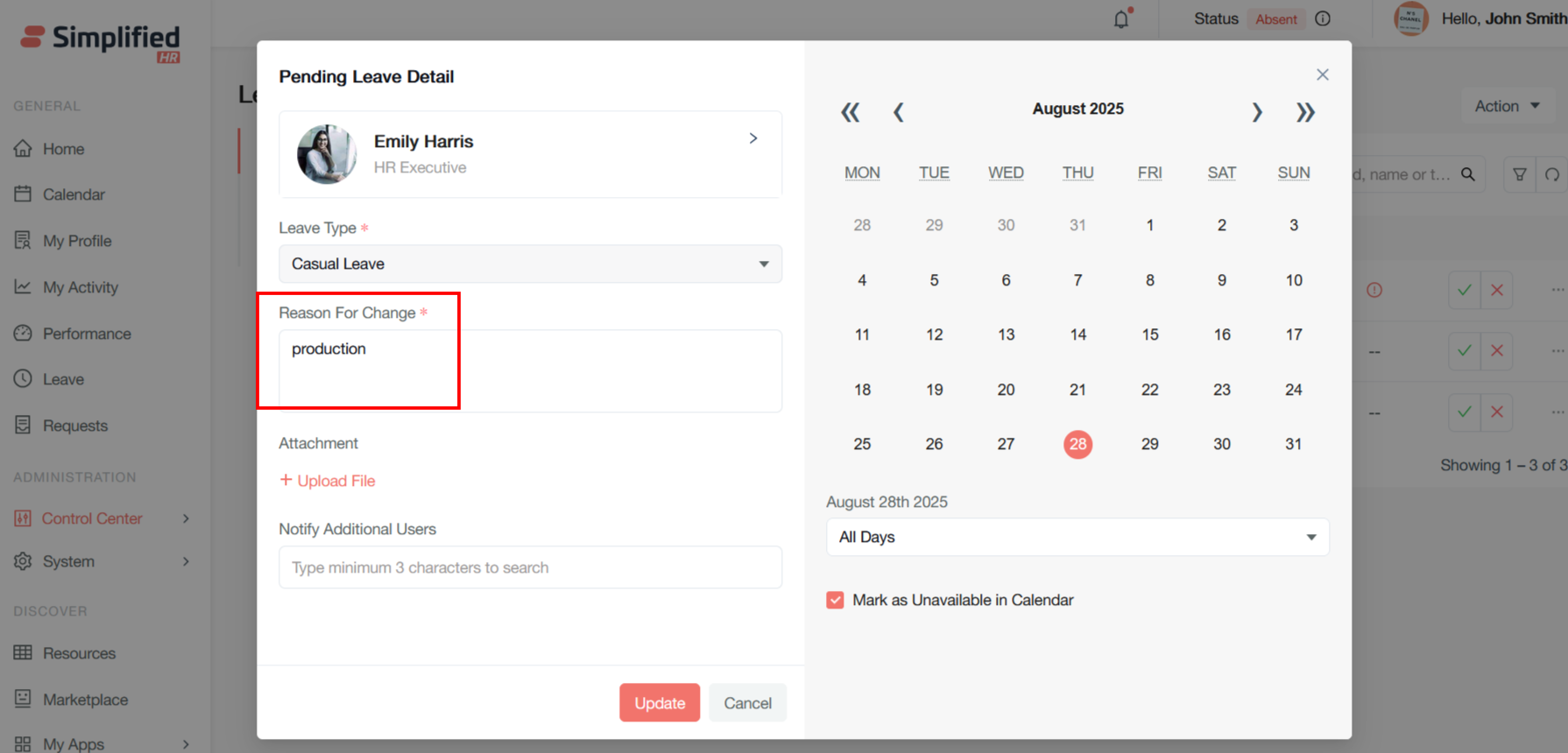 Provide the reason to change and update the leave date and click on Update button to modify the leave