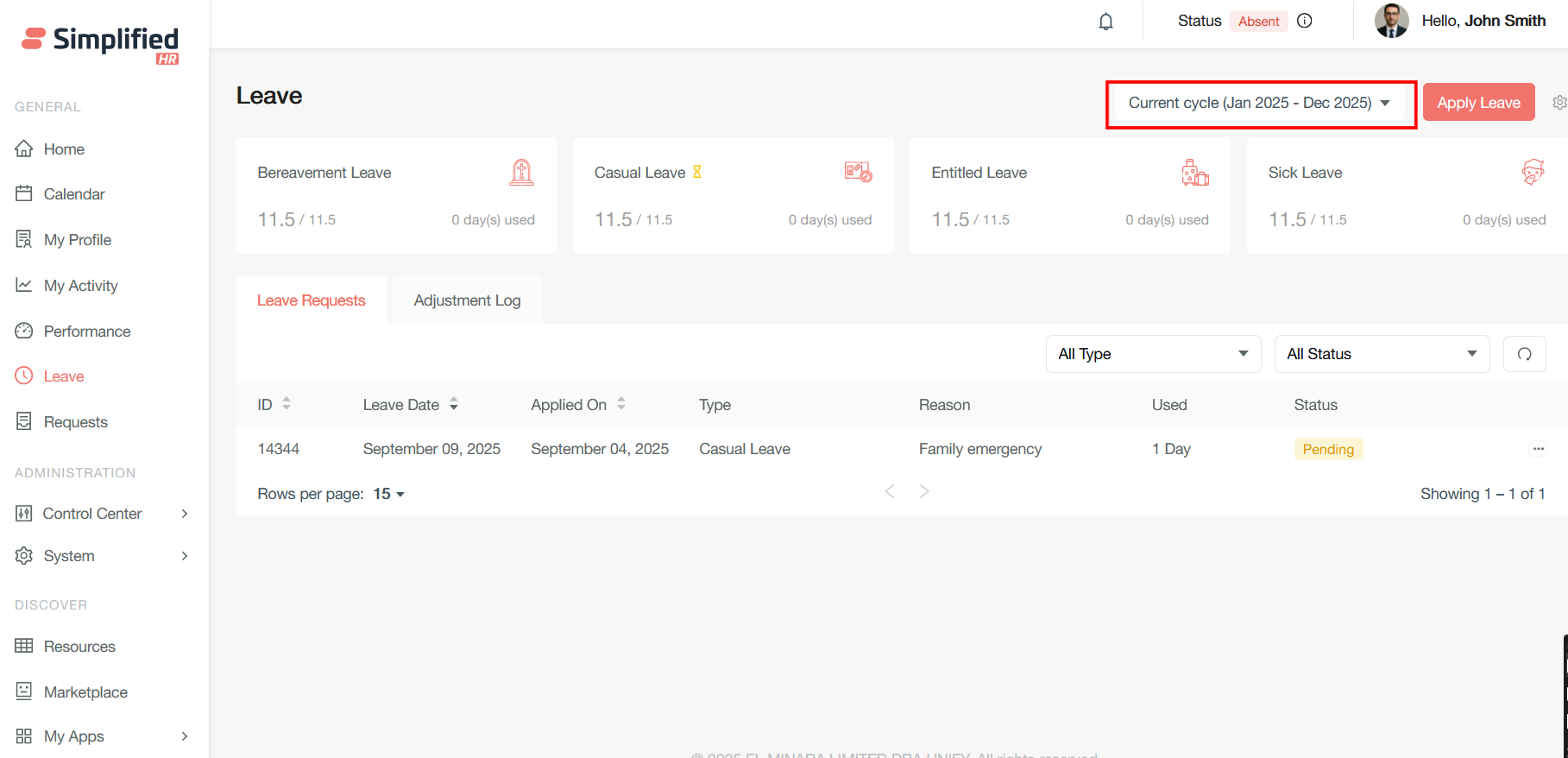 The cycle year dropdown shows the leaves from the current/previous cycle and also the upcoming cycle when the cycle year is about to end in the next two months.