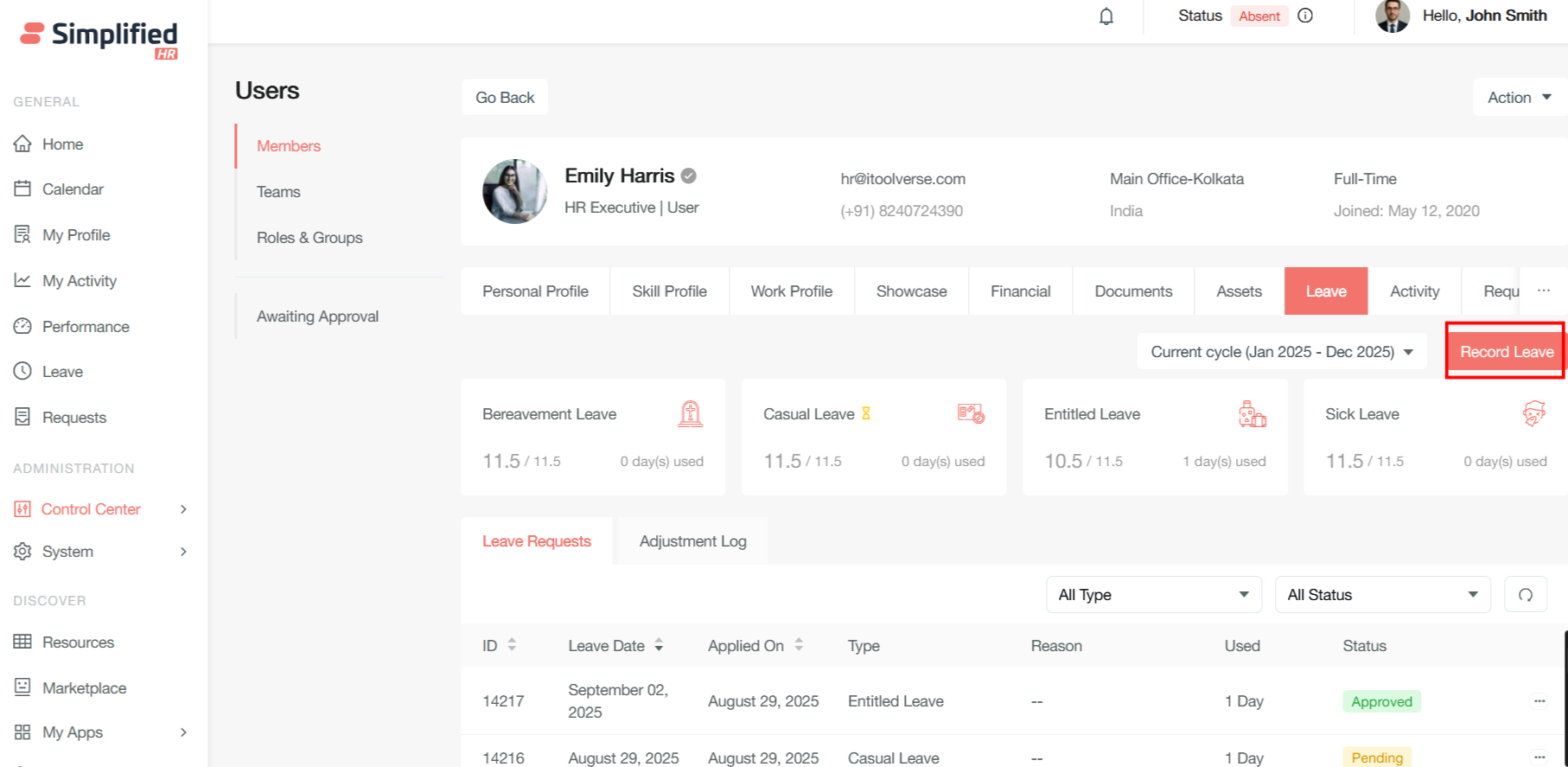Click on the record leave button to apply the leave on behalf of the user
