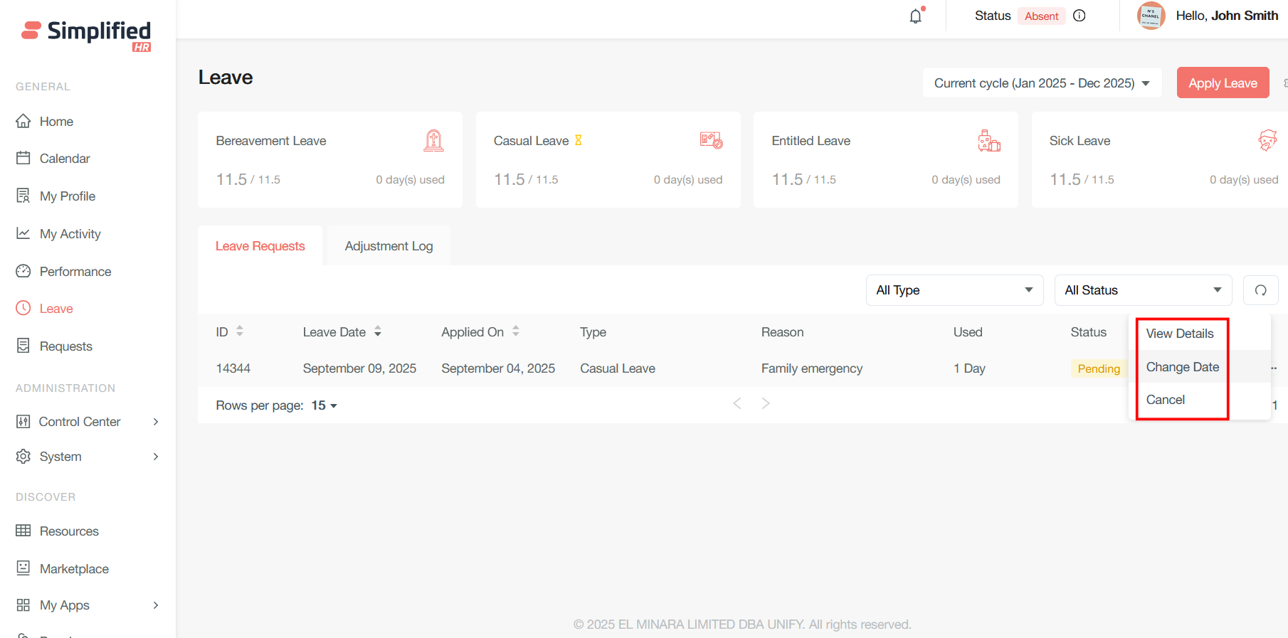Users can view the leave applications, edit the leave date and cancel the leave application by clicking on the three dots of each row.