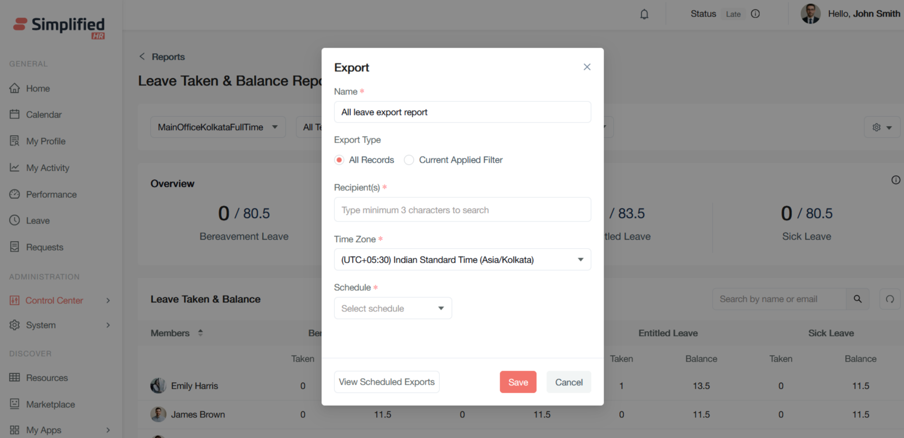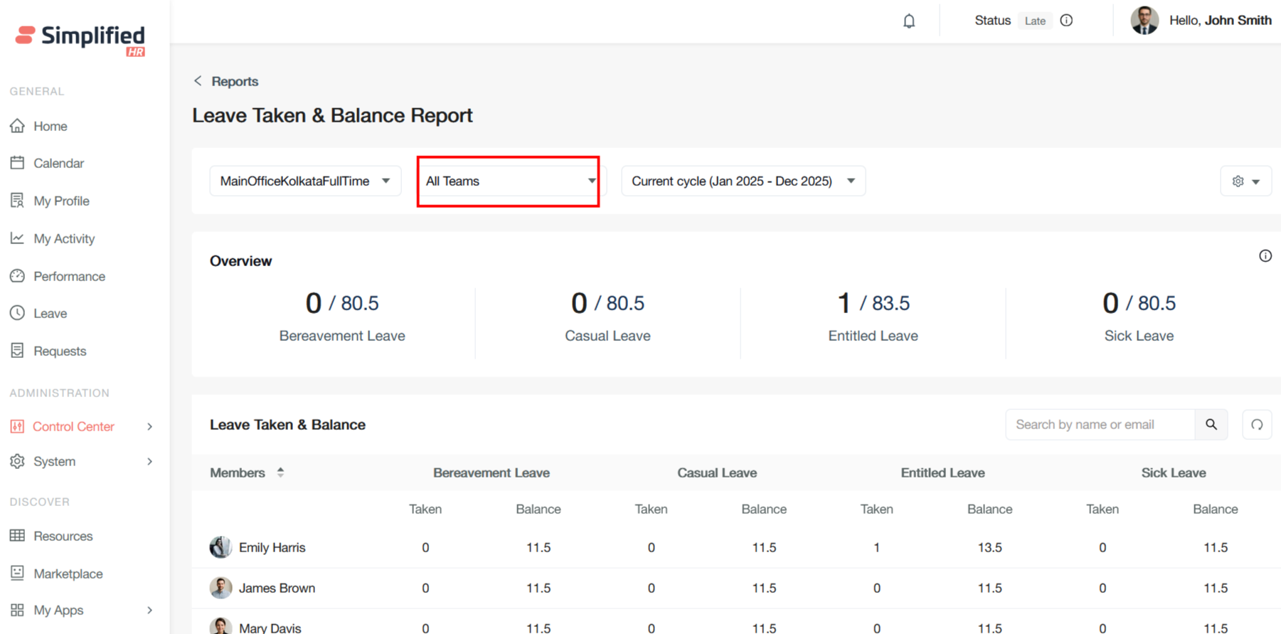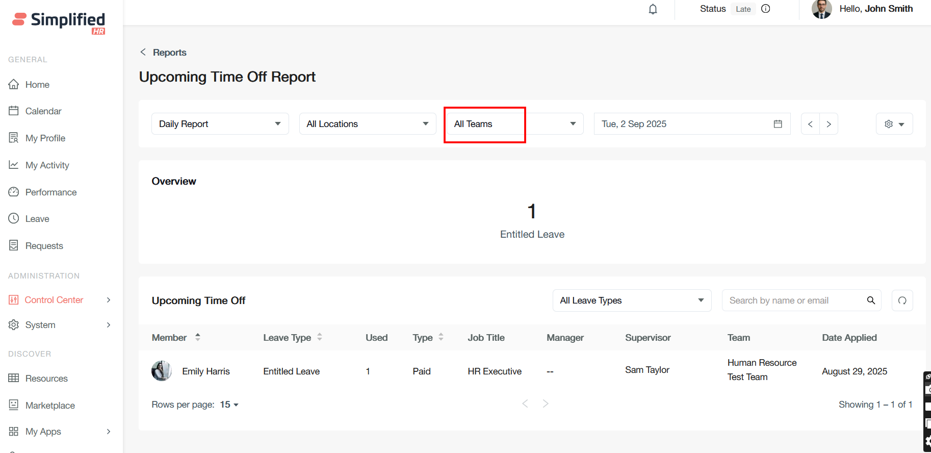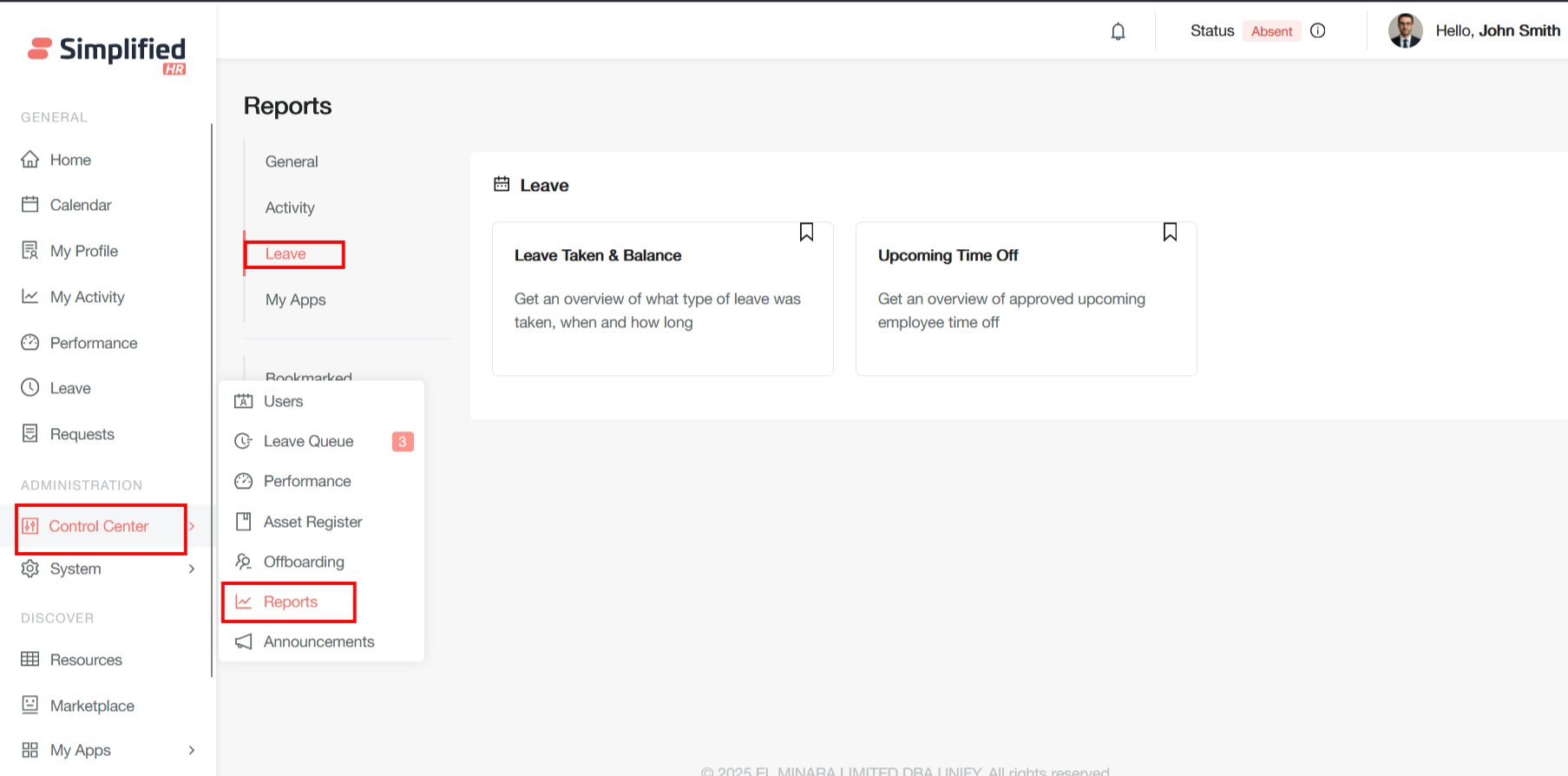 To access the leave reports, navigate to Control center > Reports and then select Leave from the left side menu