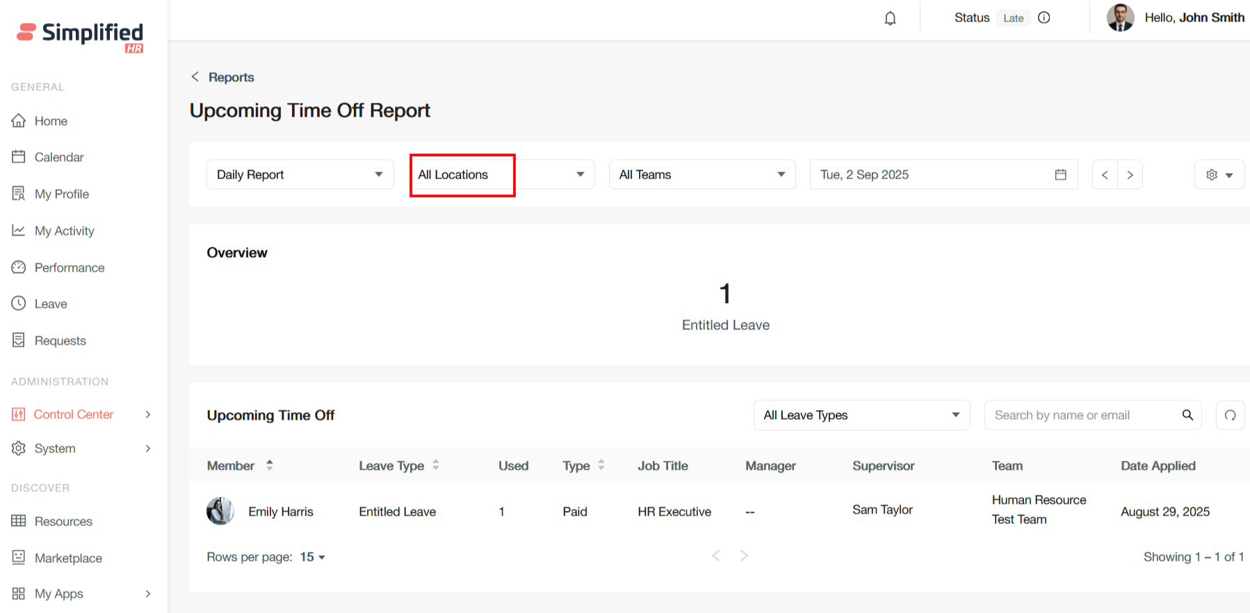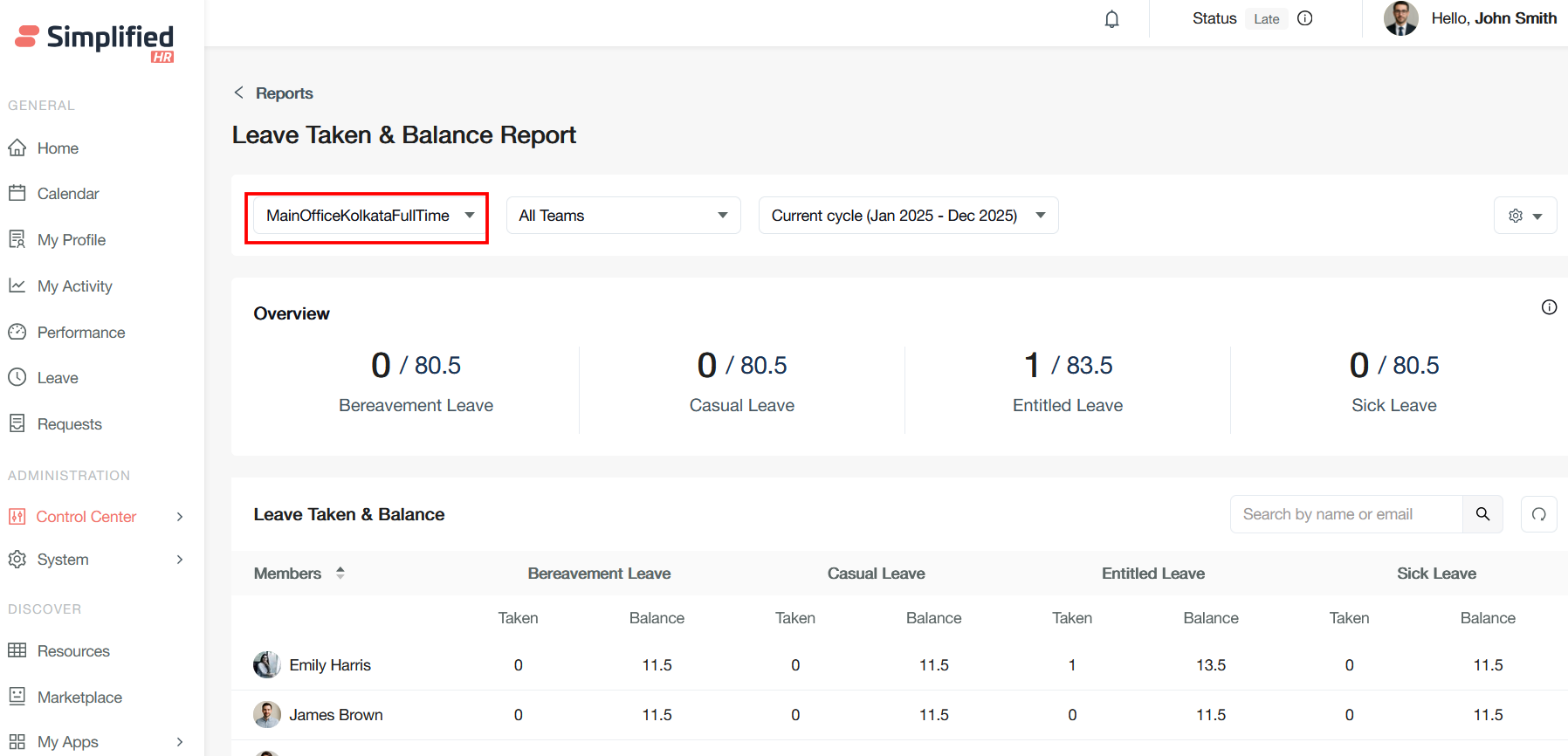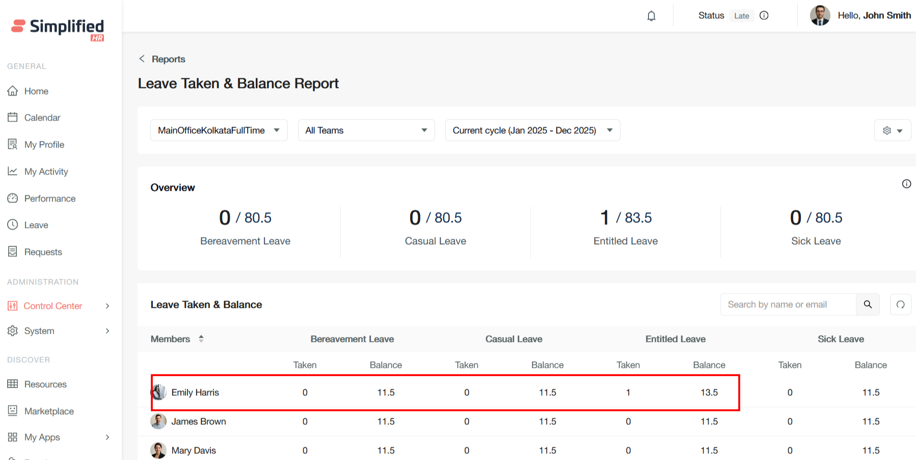 To access the leave reports, navigate to Control center > Reports and then select Leave from the left side menu