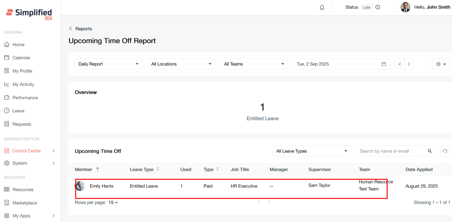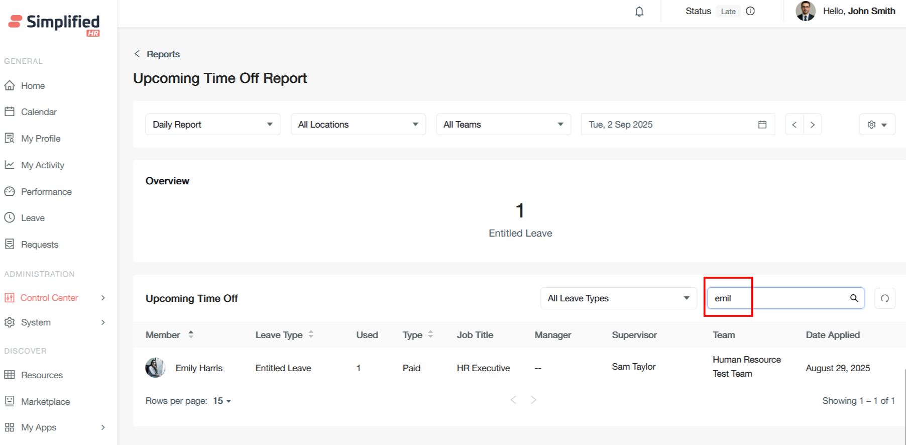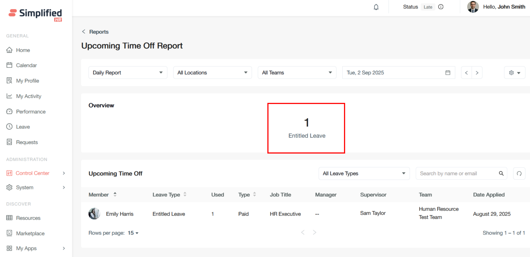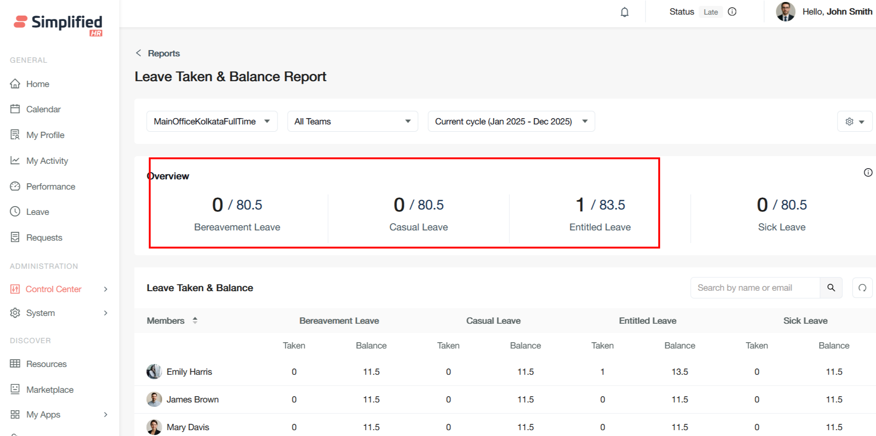 To access the leave reports, navigate to Control center > Reports and then select Leave from the left side menu