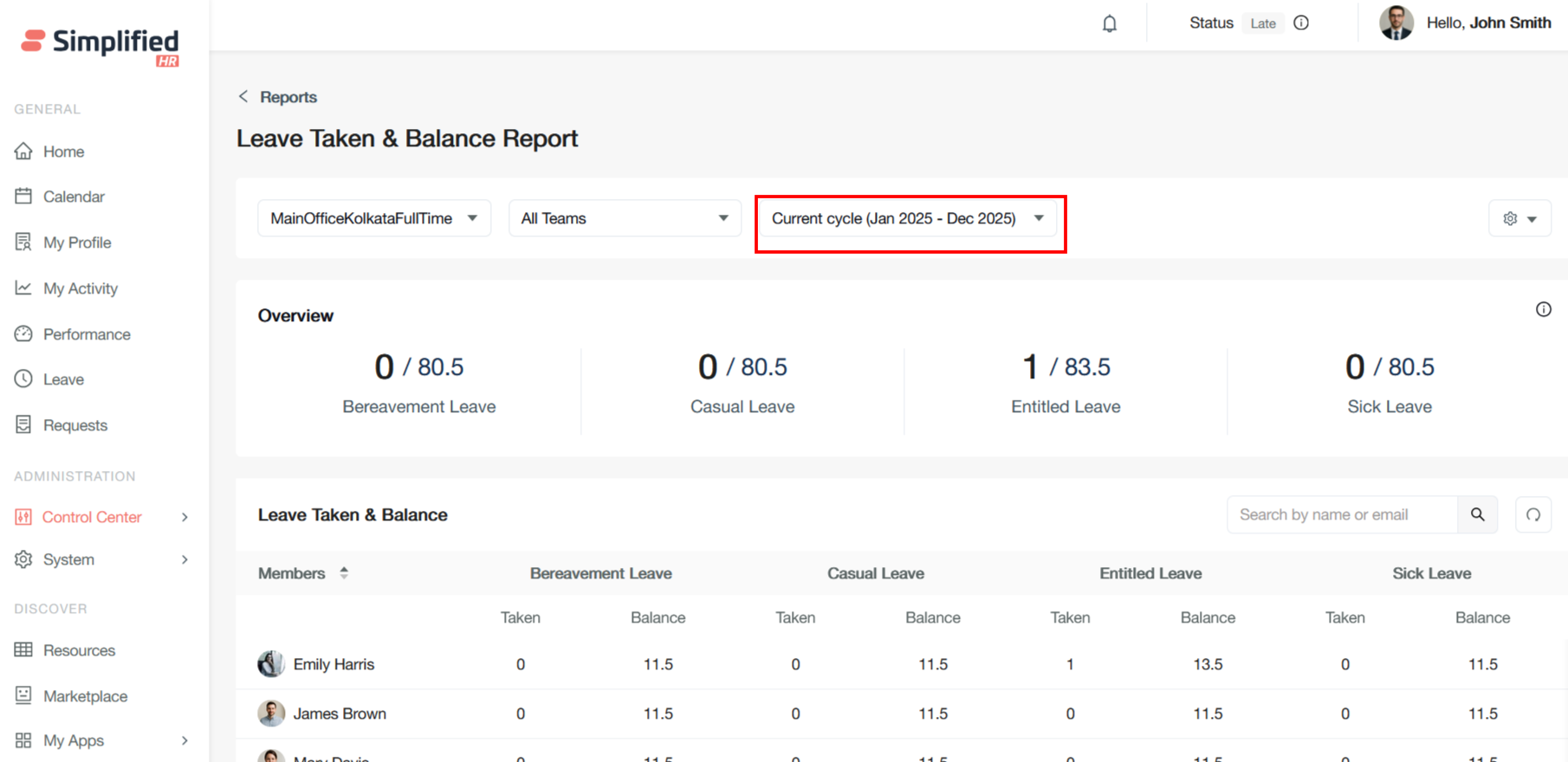 The cycle year dropdown shows the leaves from the current/previous cycle and also the upcoming cycle when the cycle year is about to end in the next two months.