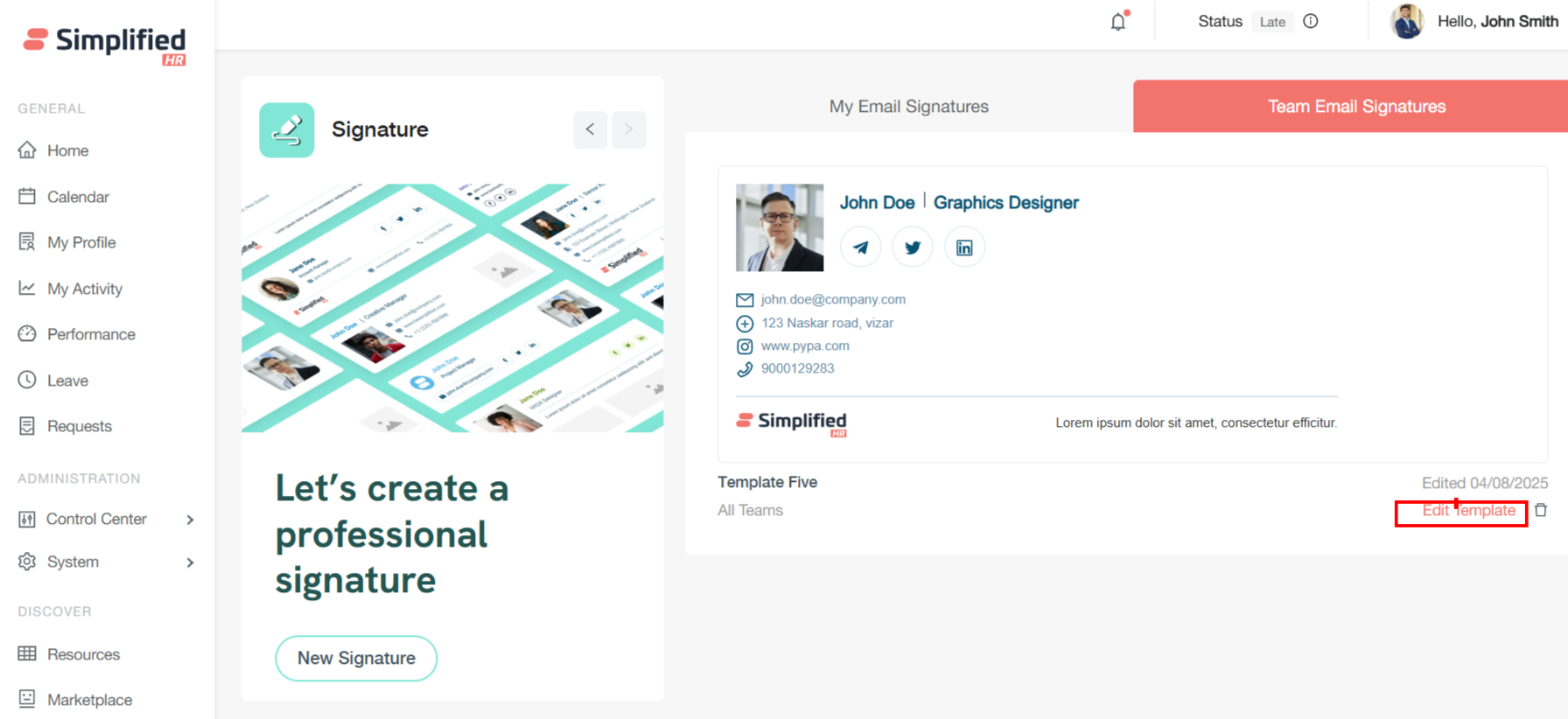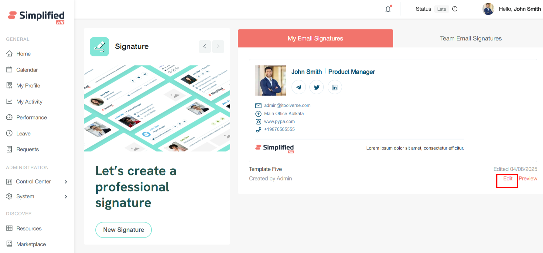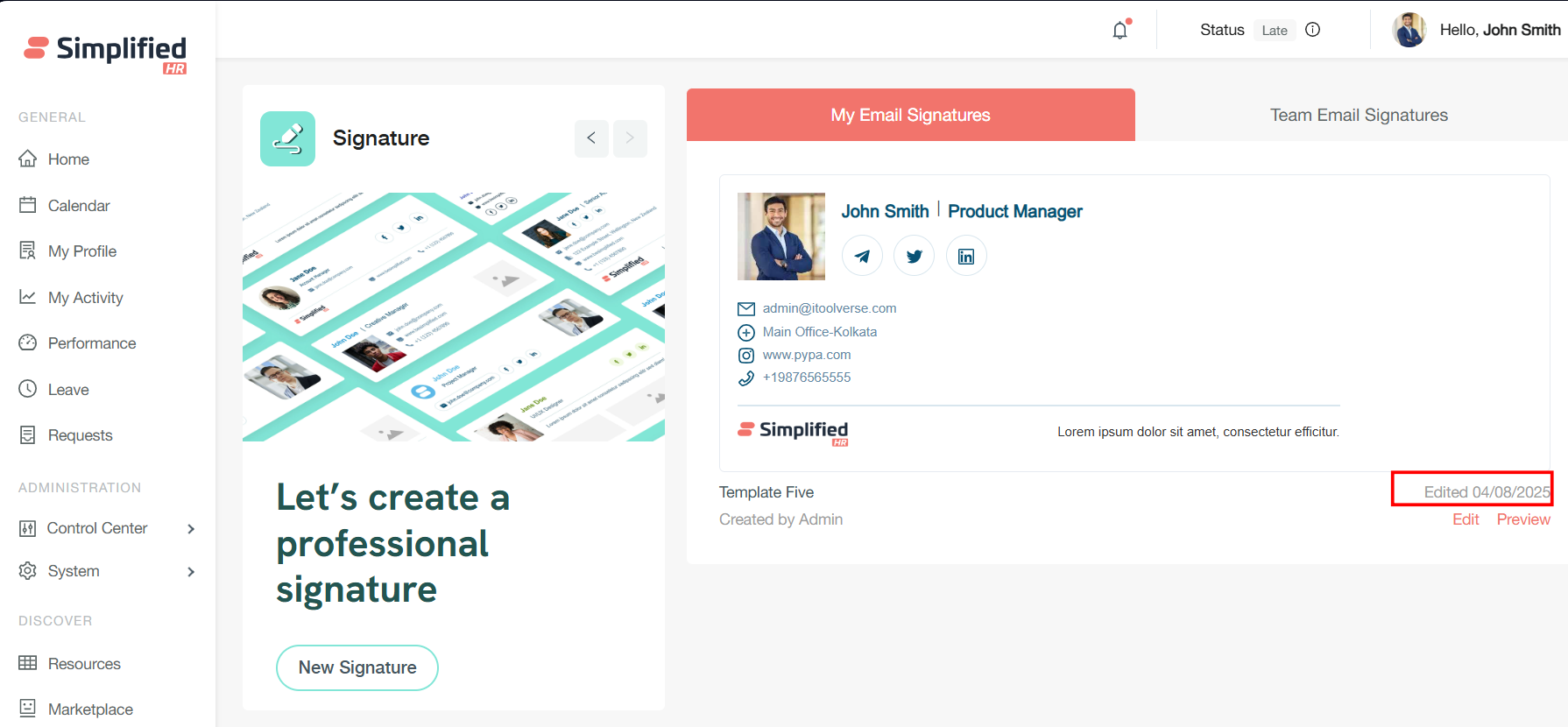 Last Modified Tracking: The system displays the last edited date for each template, providing visibility into when signatures were most recently updated.