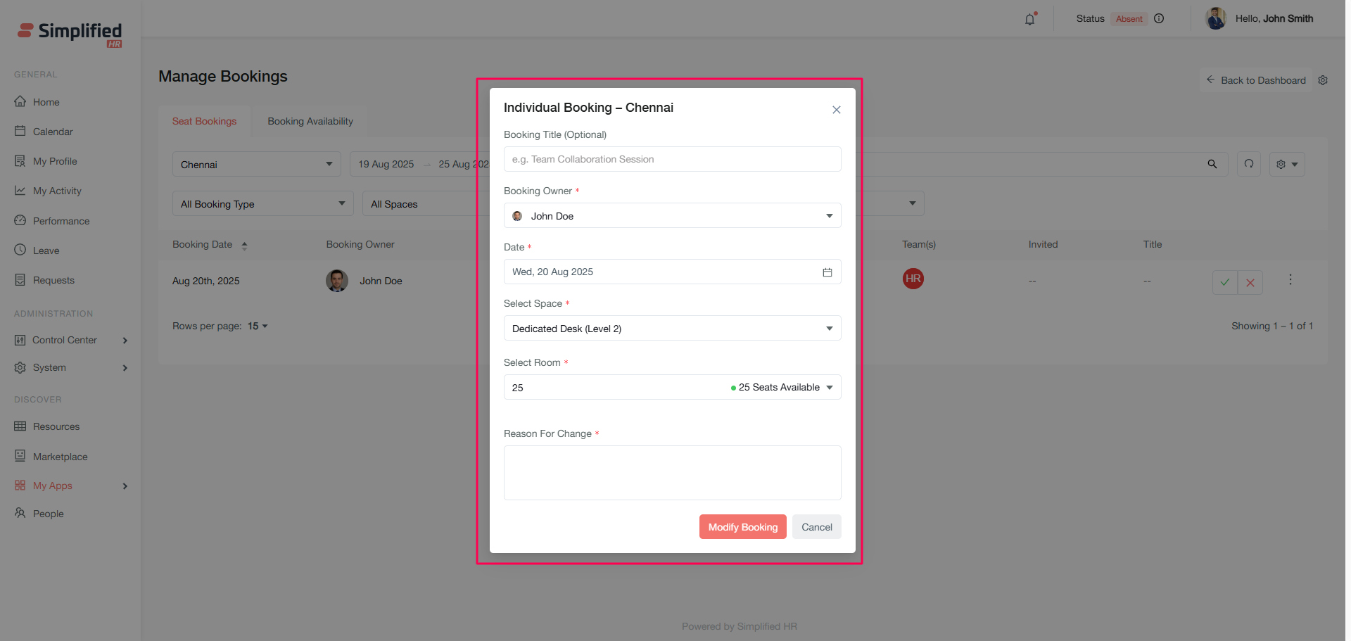 Modified approved bookings require re-approval if booking date, space, or room changes.