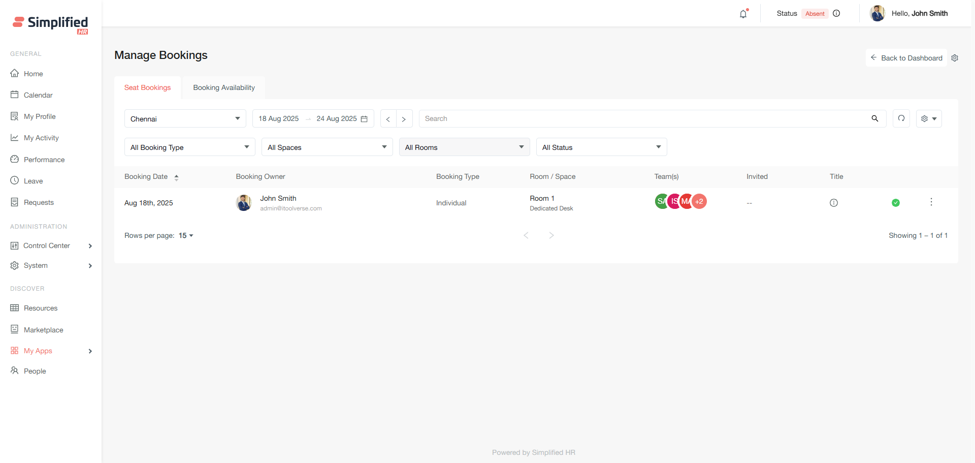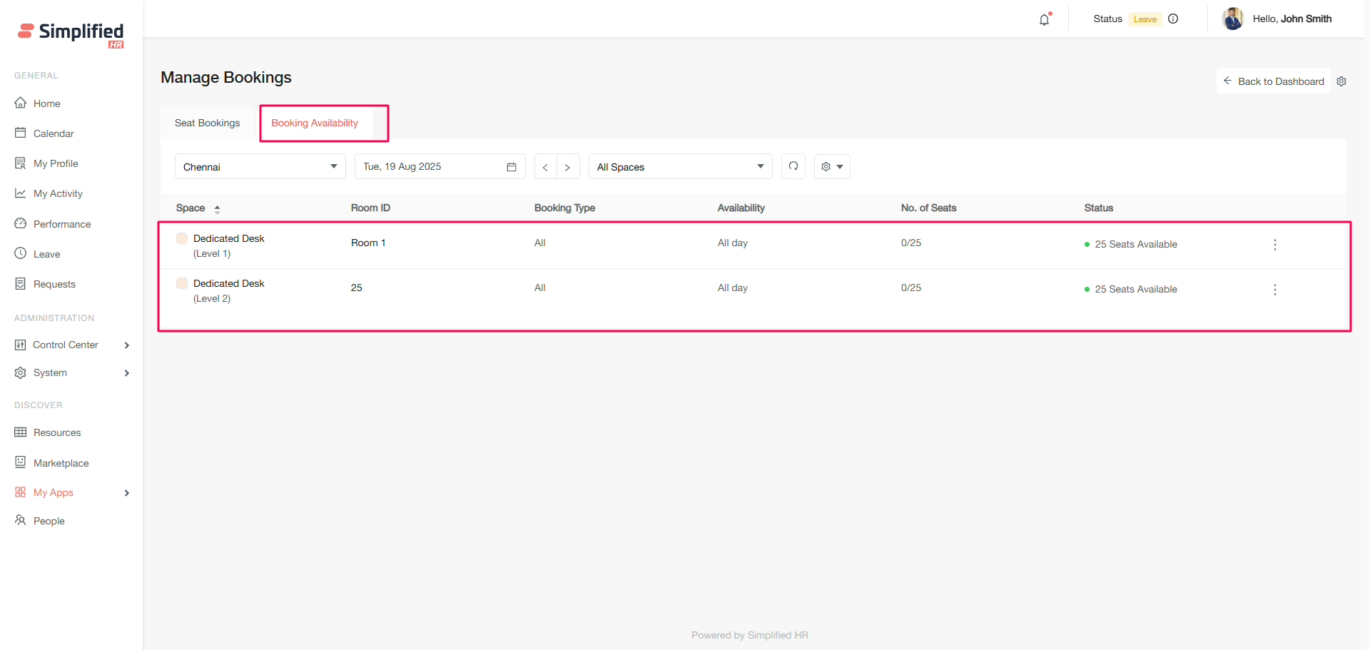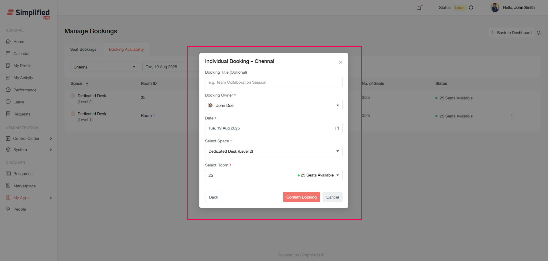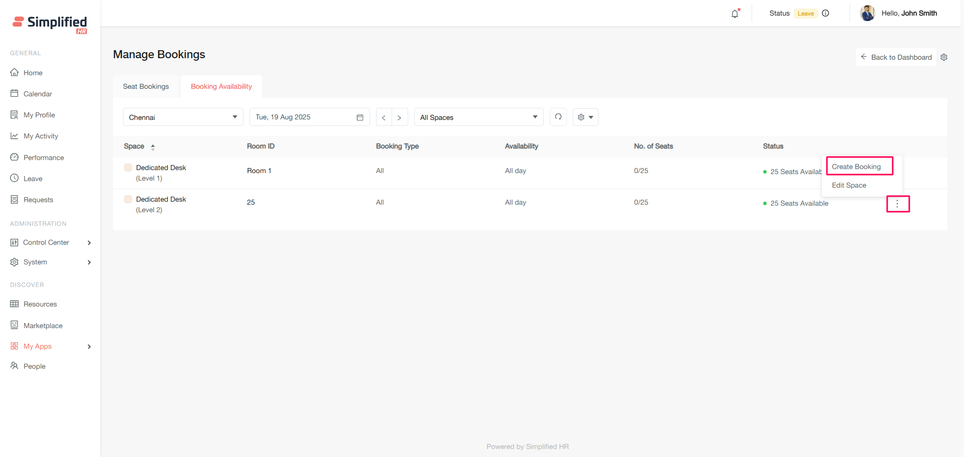 The Booking Availability section allows you to create new bookings for organizational members and view real-time space availability.
