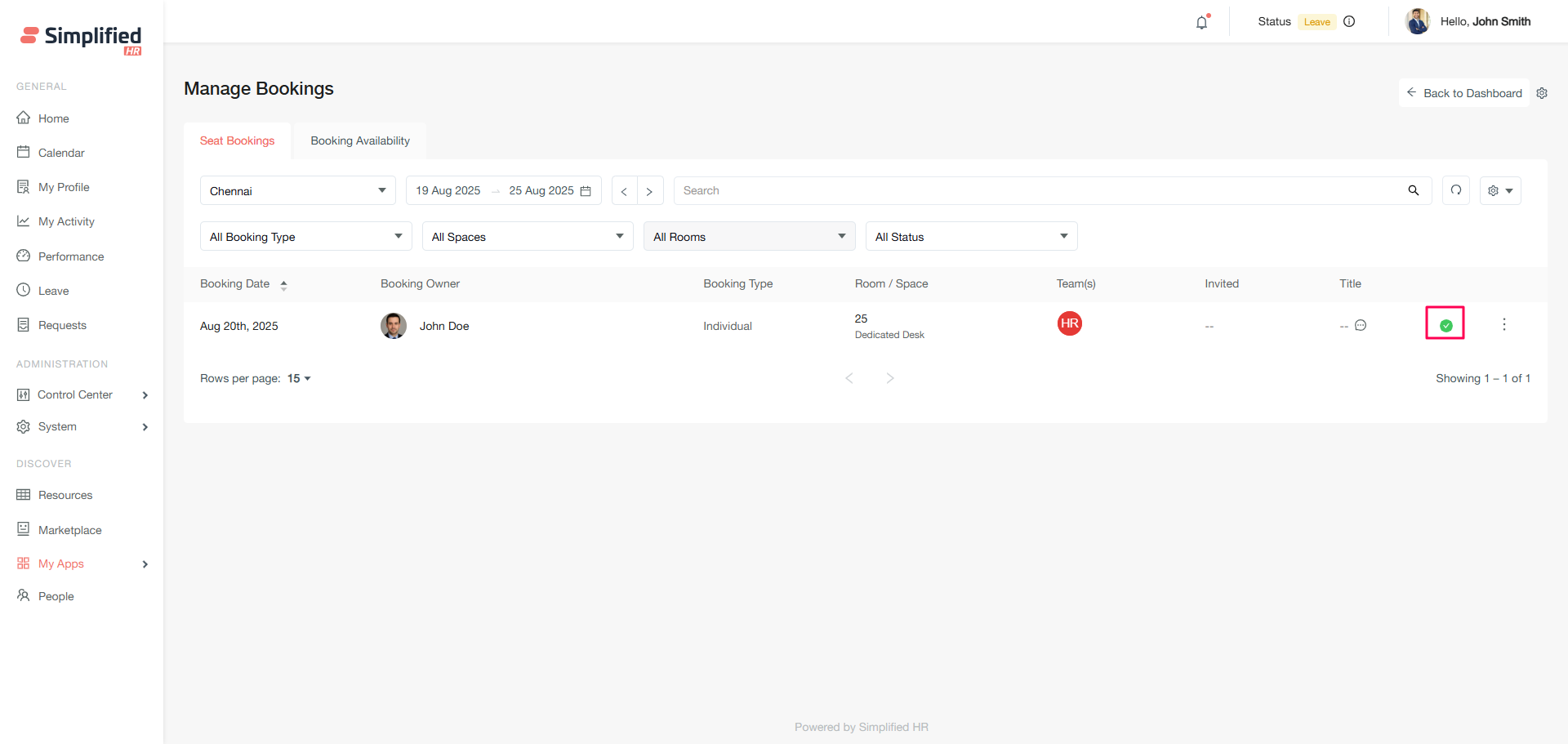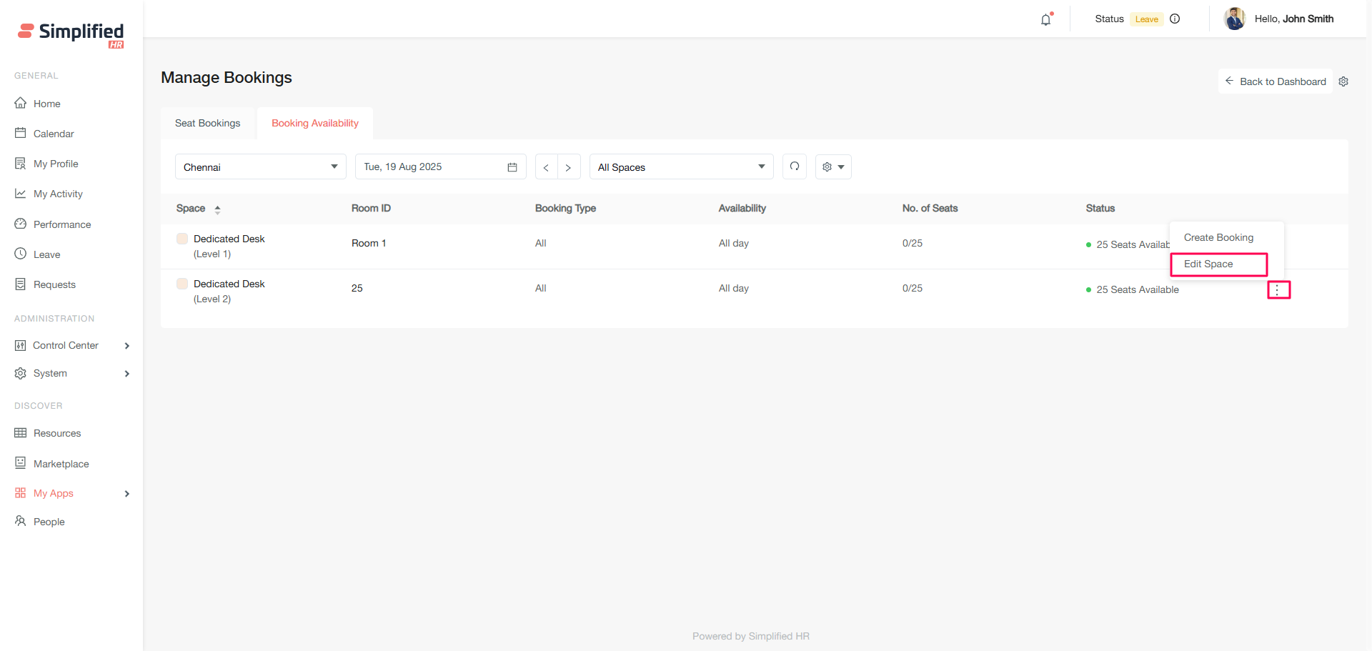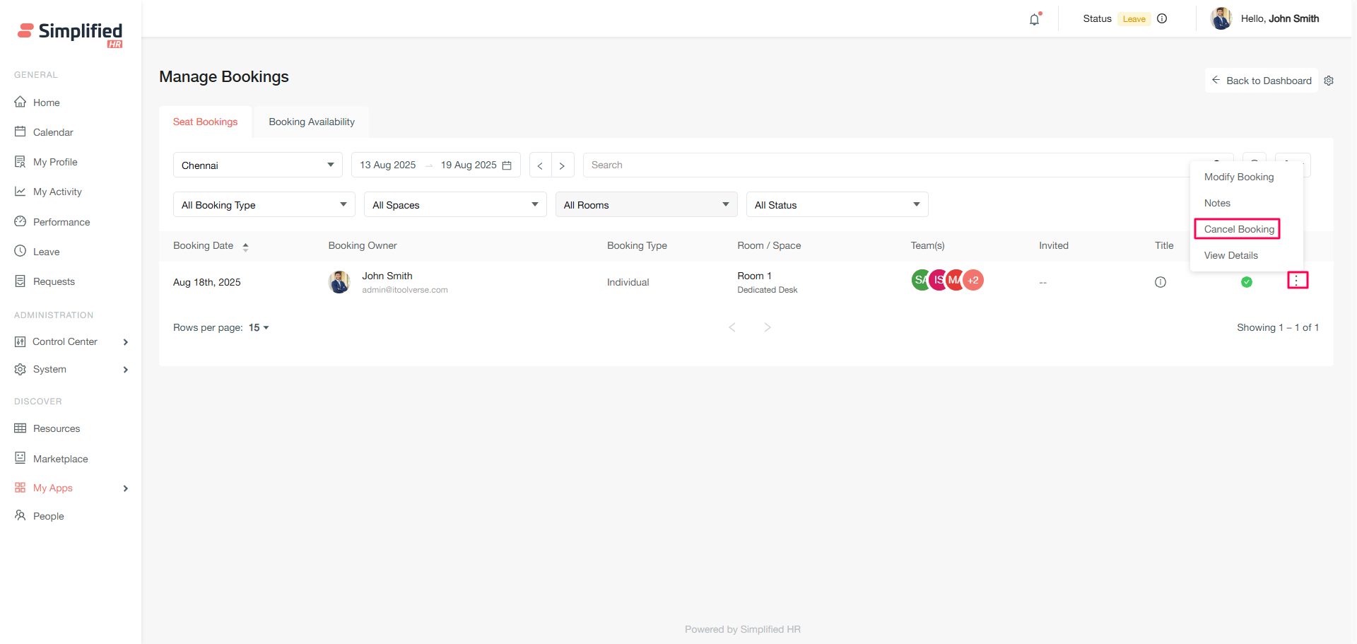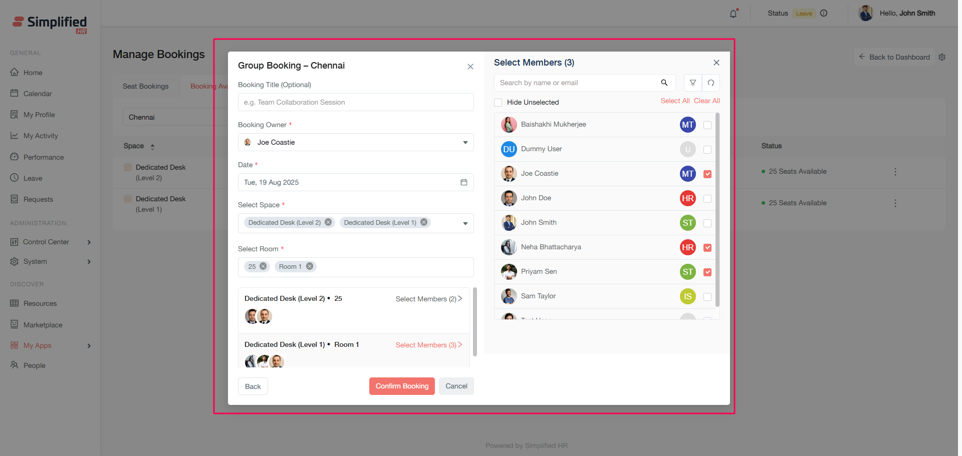 The Booking Availability section allows you to create new bookings for organizational members and view real-time space availability.