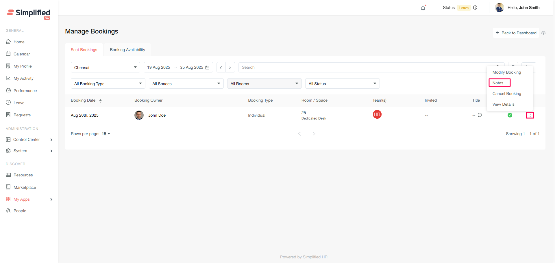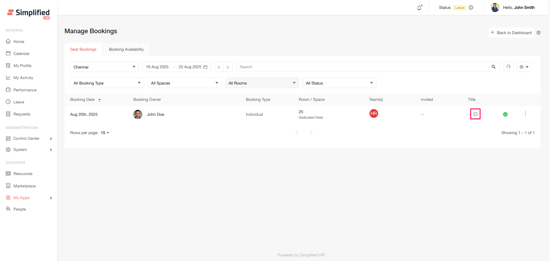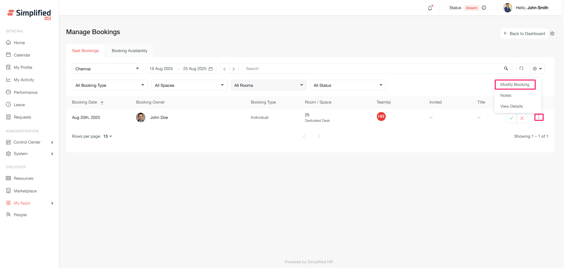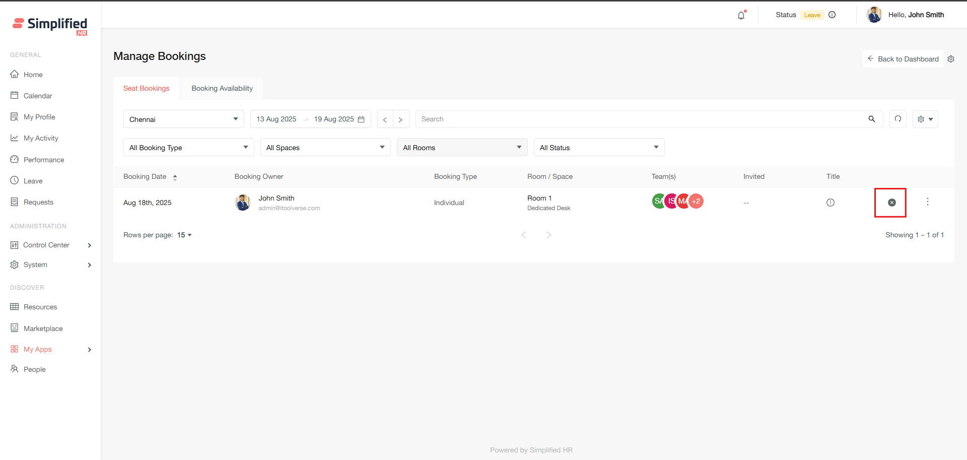 The Booking Availability section allows you to create new bookings for organizational members and view real-time space availability.