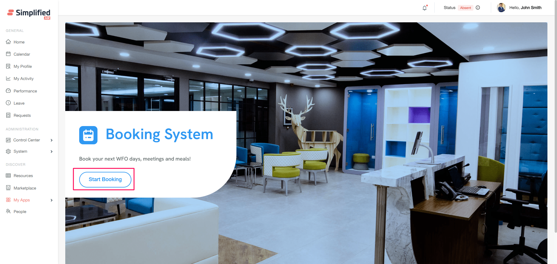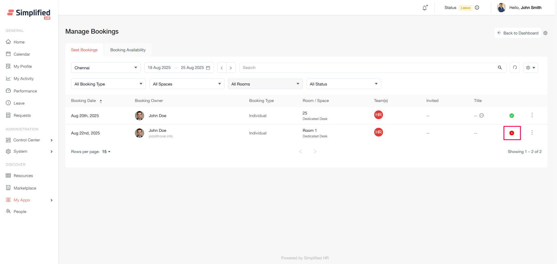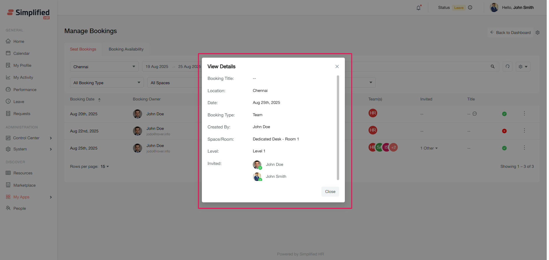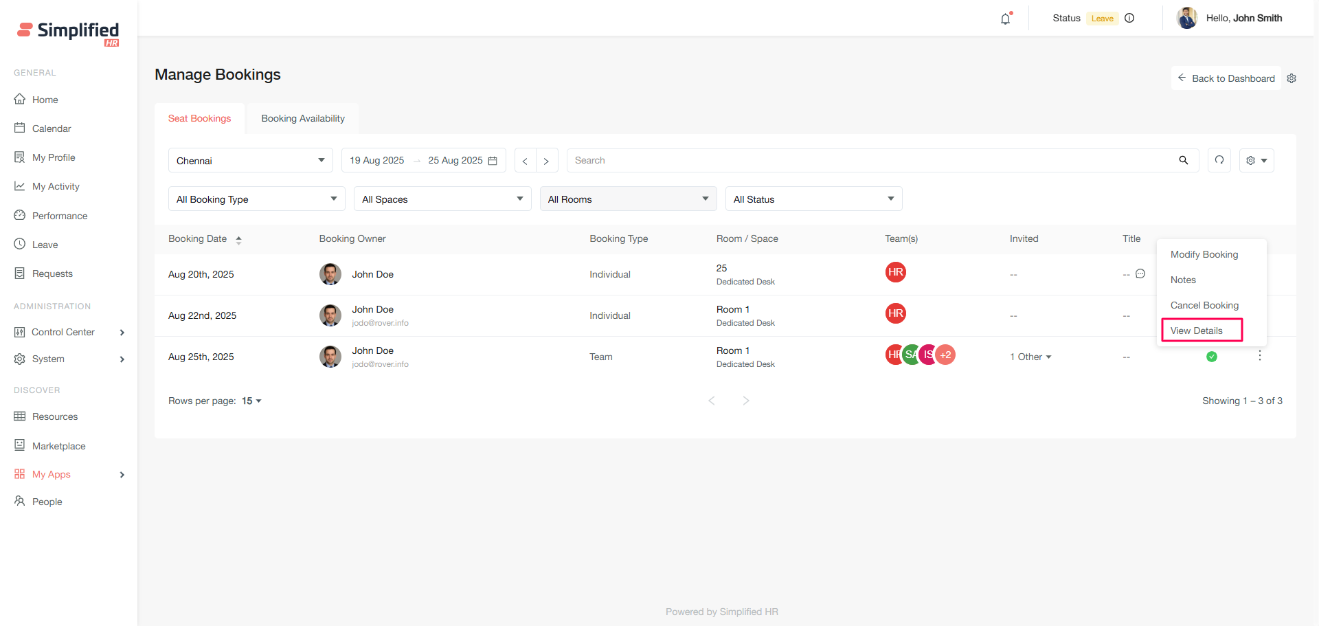 The Booking Availability section allows you to create new bookings for organizational members and view real-time space availability.