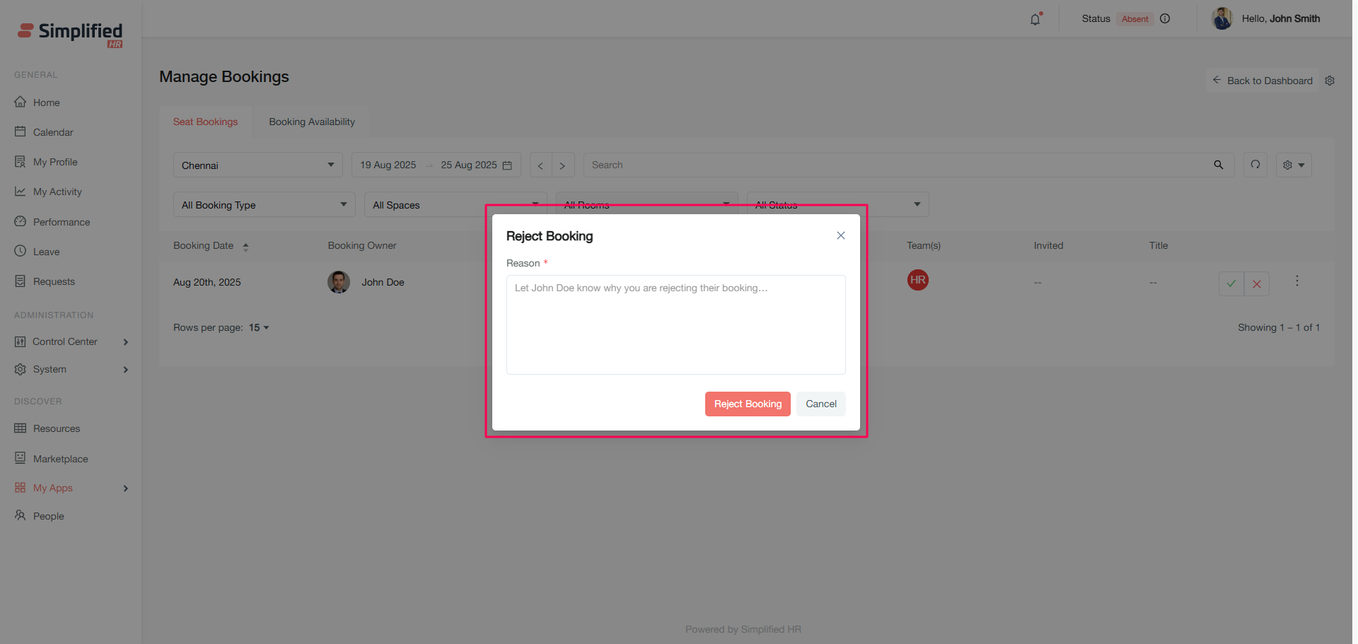 Enter the rejection reason in the modal dialog.