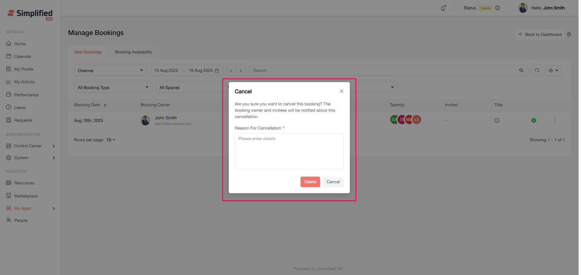 The Seat Booking section displays all organizational bookings in a comprehensive table format, allowing you to manage existing reservations.