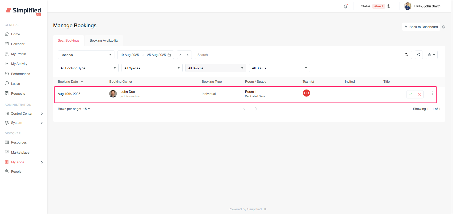 - Click the green tick button next to the booking requiring approval.