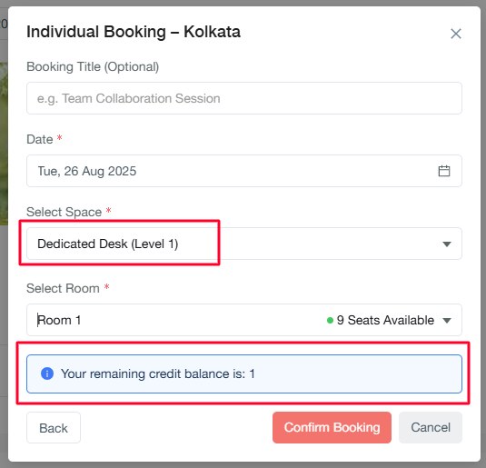When selecting credit-enabled spaces, the system displays your available credit balance. Credits reset based on your administrator's configuration (daily or monthly).