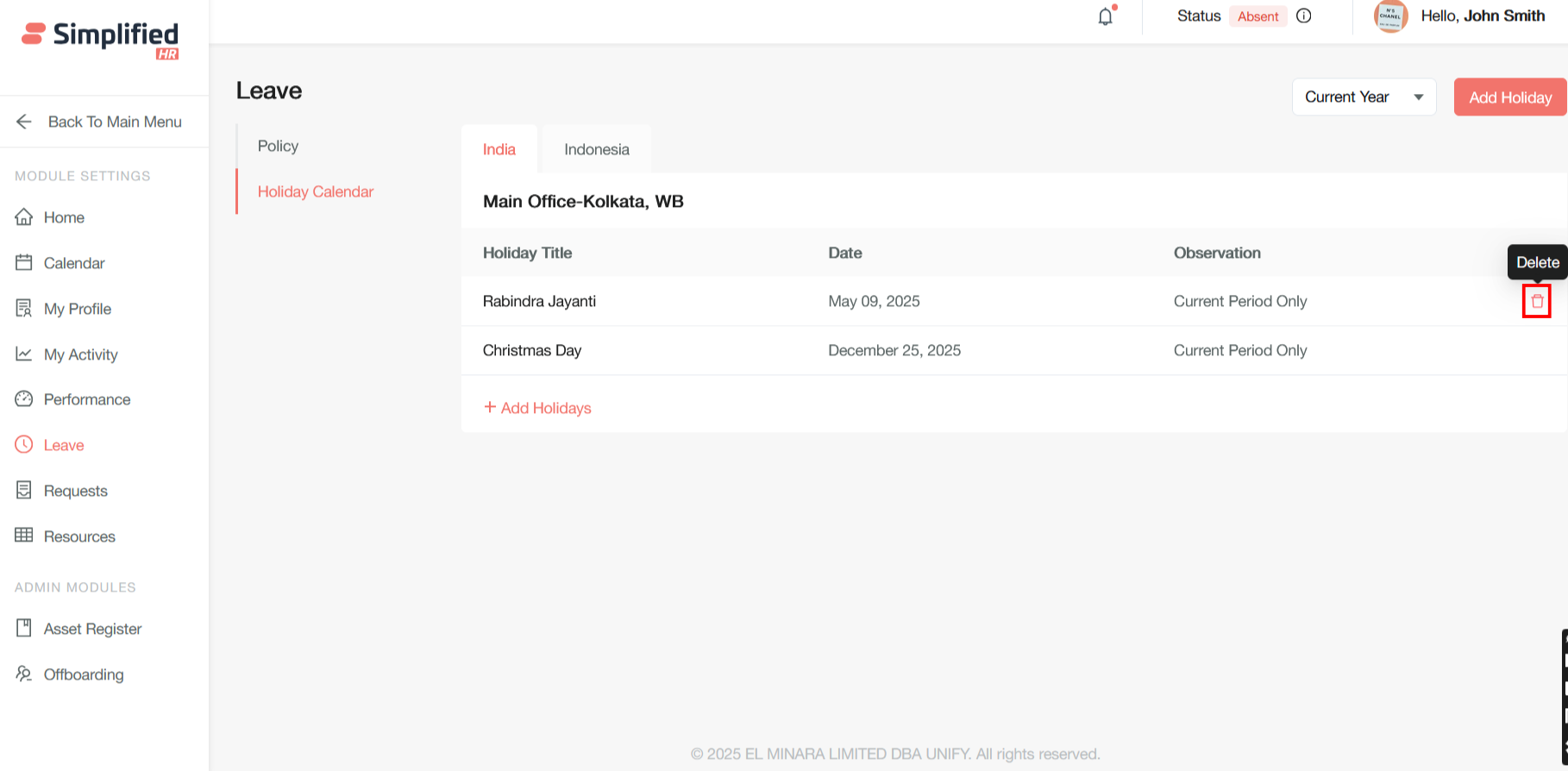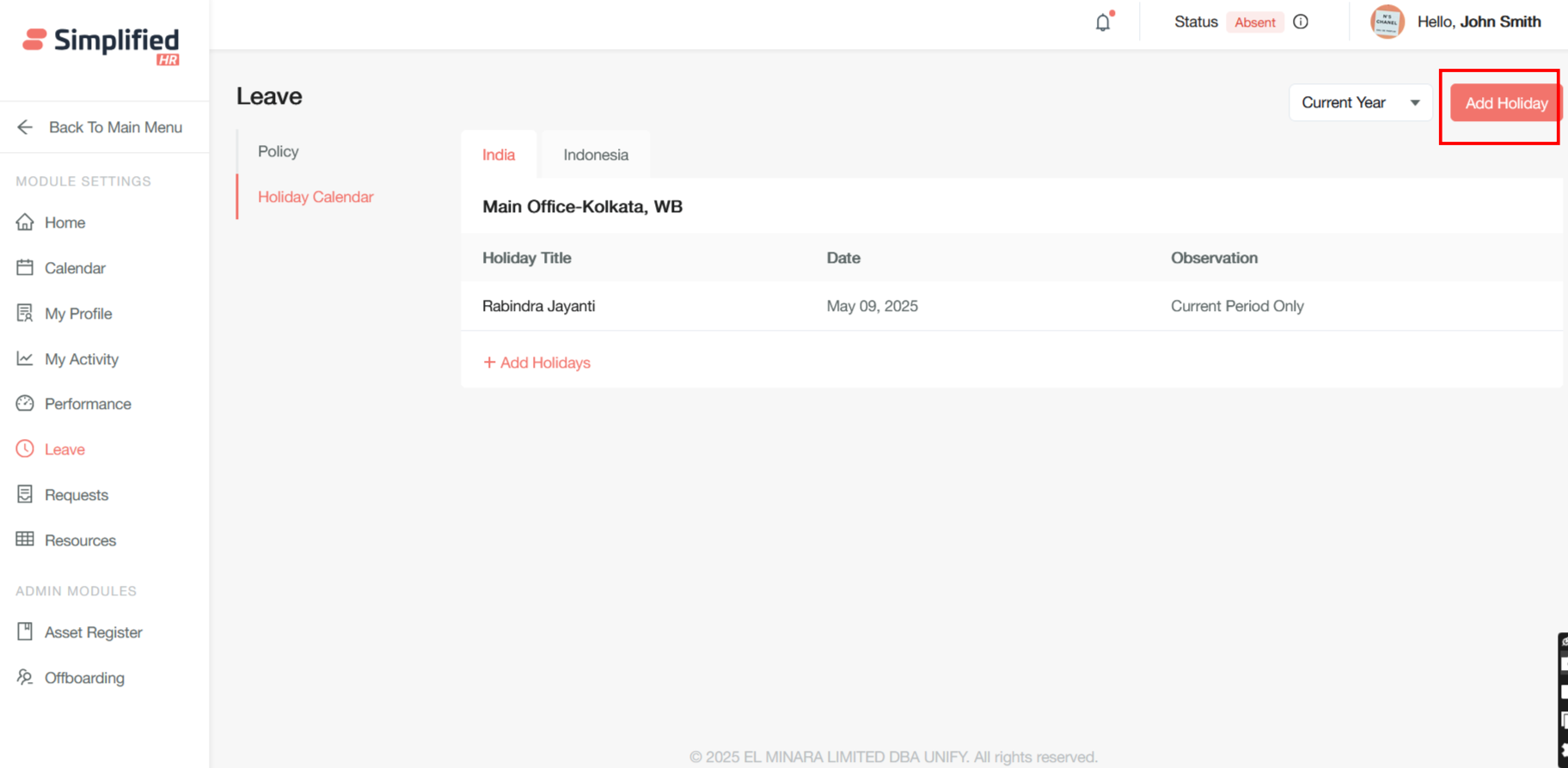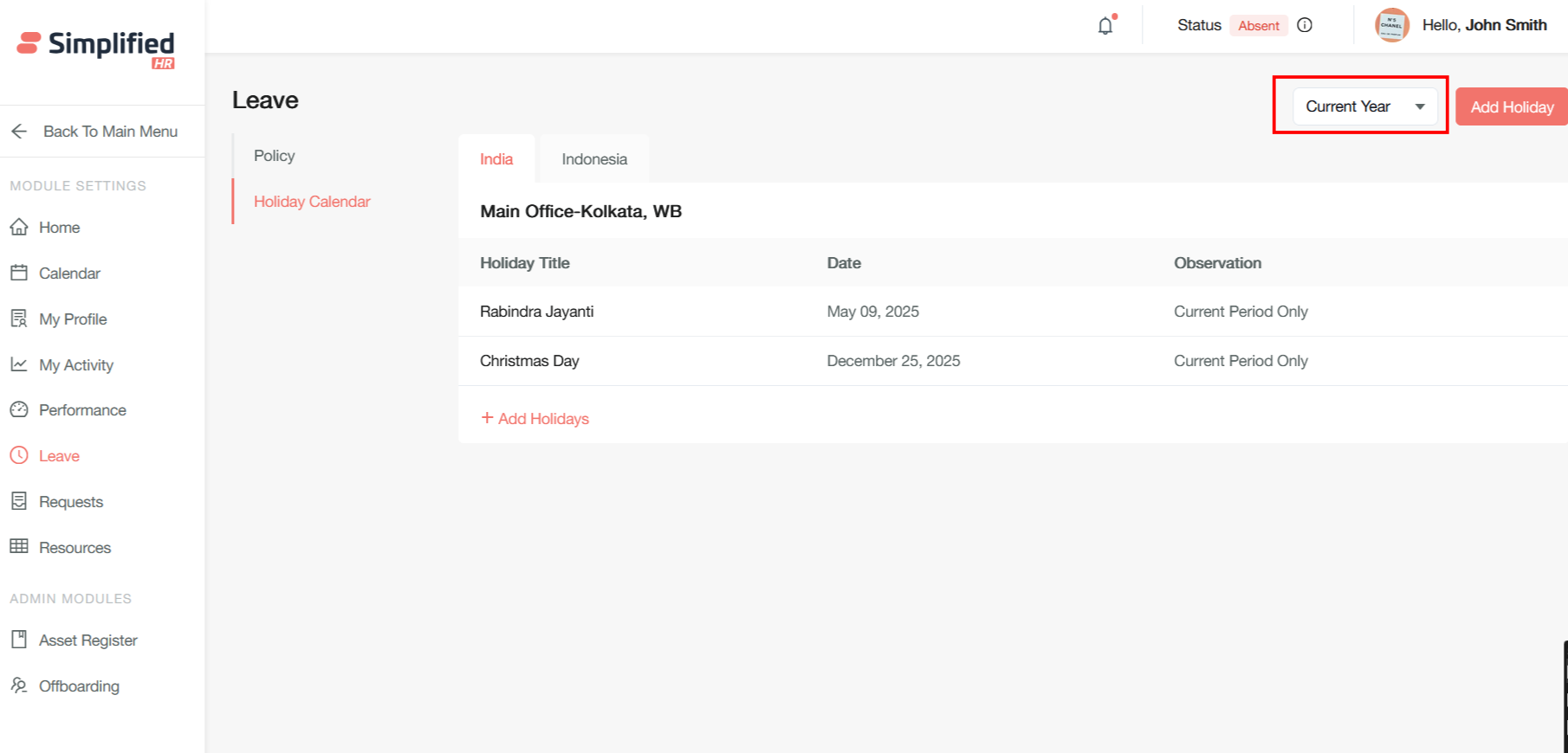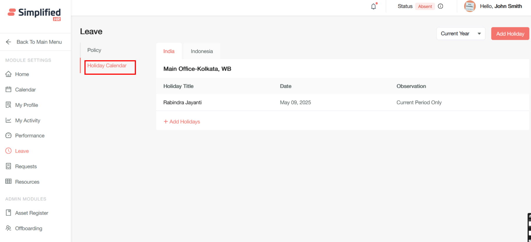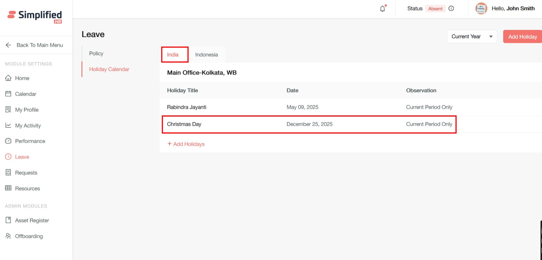 Location and Shift-Based Holidays: Different holidays can be set for various office locations or shift patterns, ensuring employees only see holidays applicable to their work arrangements