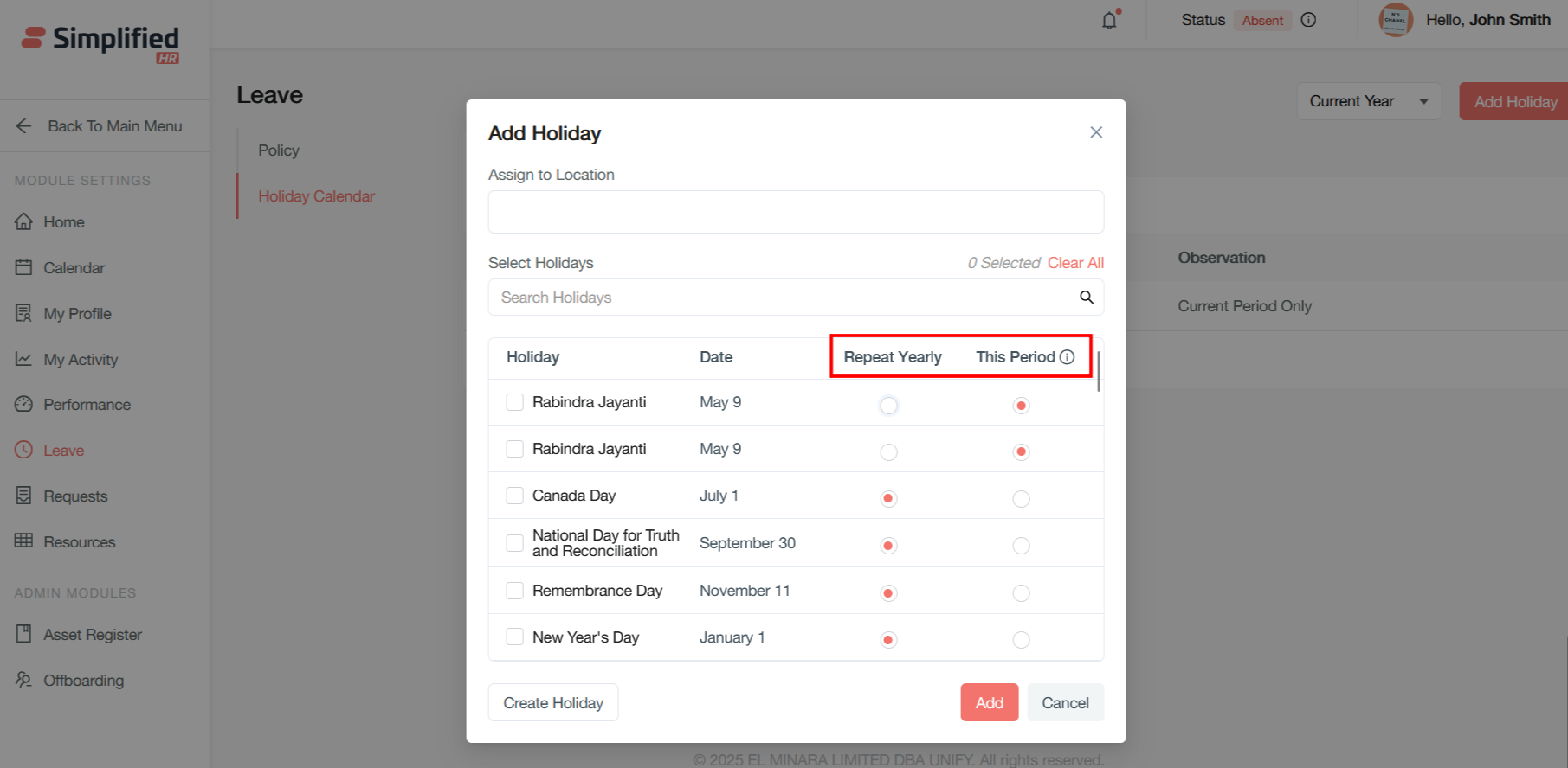 Repeat Yearly: This option creates fixed holidays that occur on the same date every year, such as Christmas Day (December 25th) or New Year's Day (January 1st). When selected, the system automatically generates holiday entries for multiple years within the defined period.