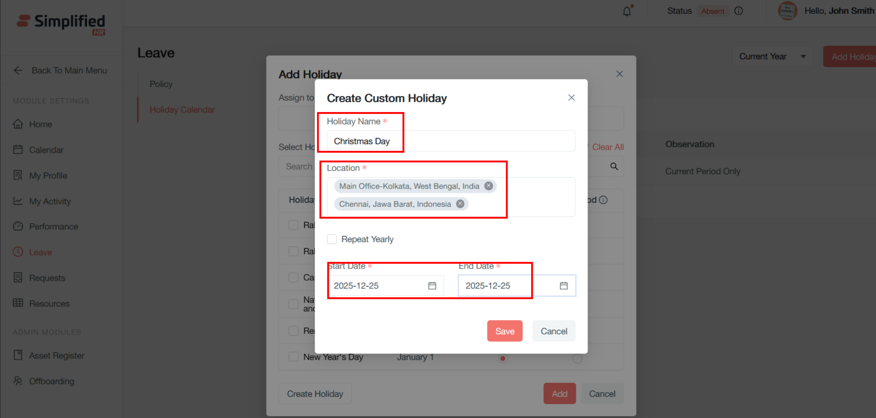 Provide the Holiday name, assign the location and enter the date of the holiday and click on Save to add a custom holiday