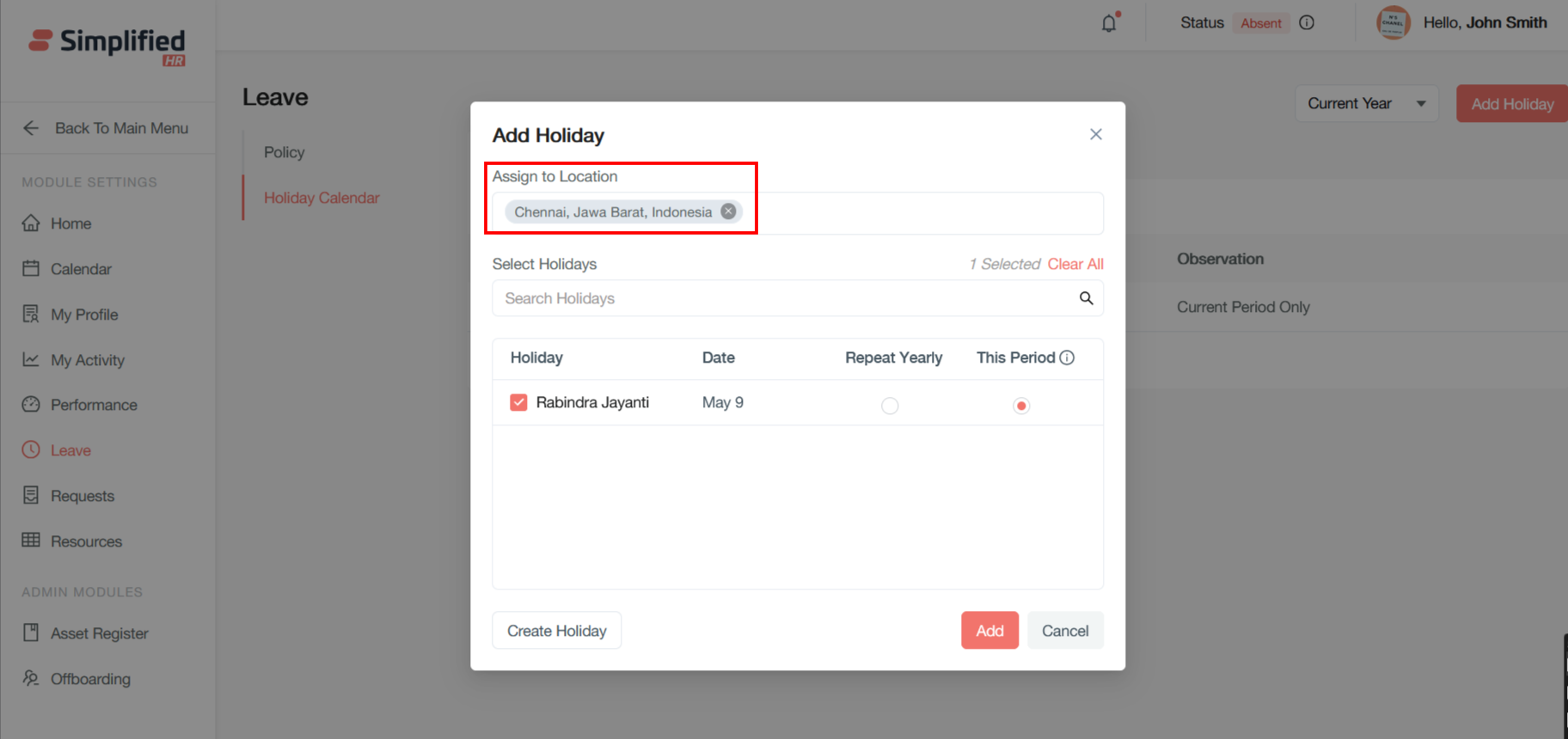 Assign the location searching by the location name and check the holiday you want to create and add the holiday