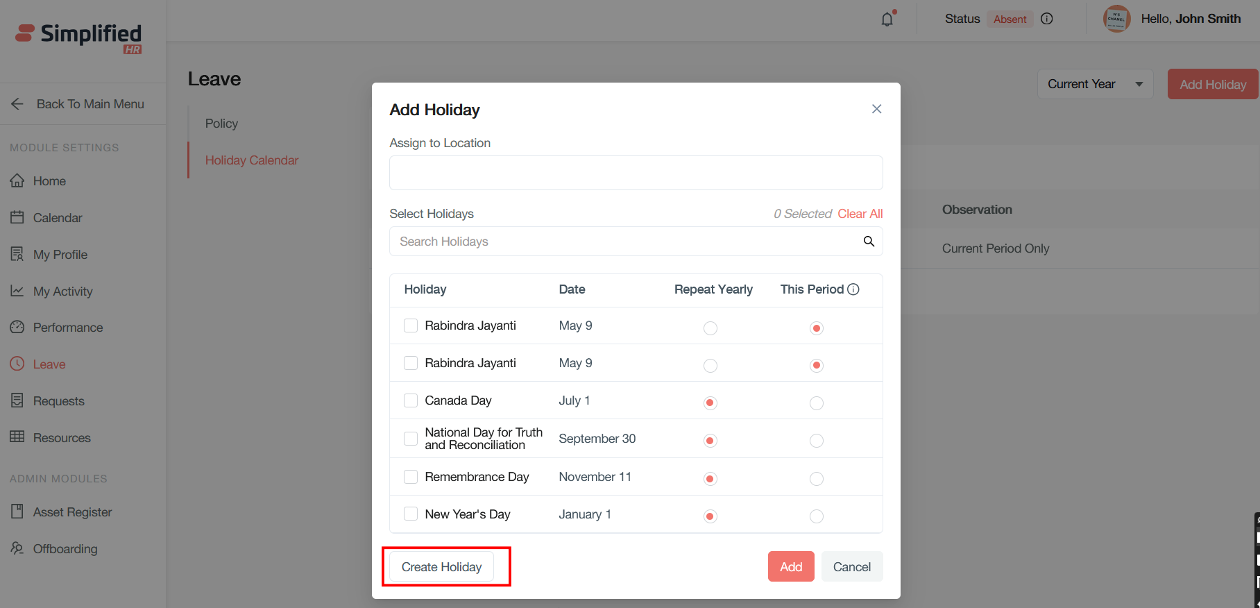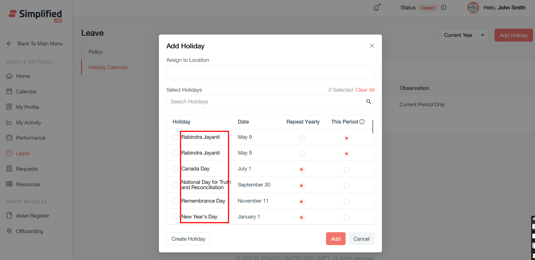 The Add Holiday modal will display a list of default holiday libraries which is a comprehensive list of standard holidays including national holidays, religious observances, and common corporate holidays. This eliminates the need for manual data entry and ensures consistency across the organization.