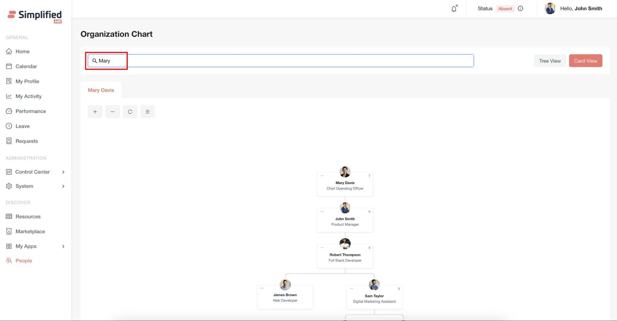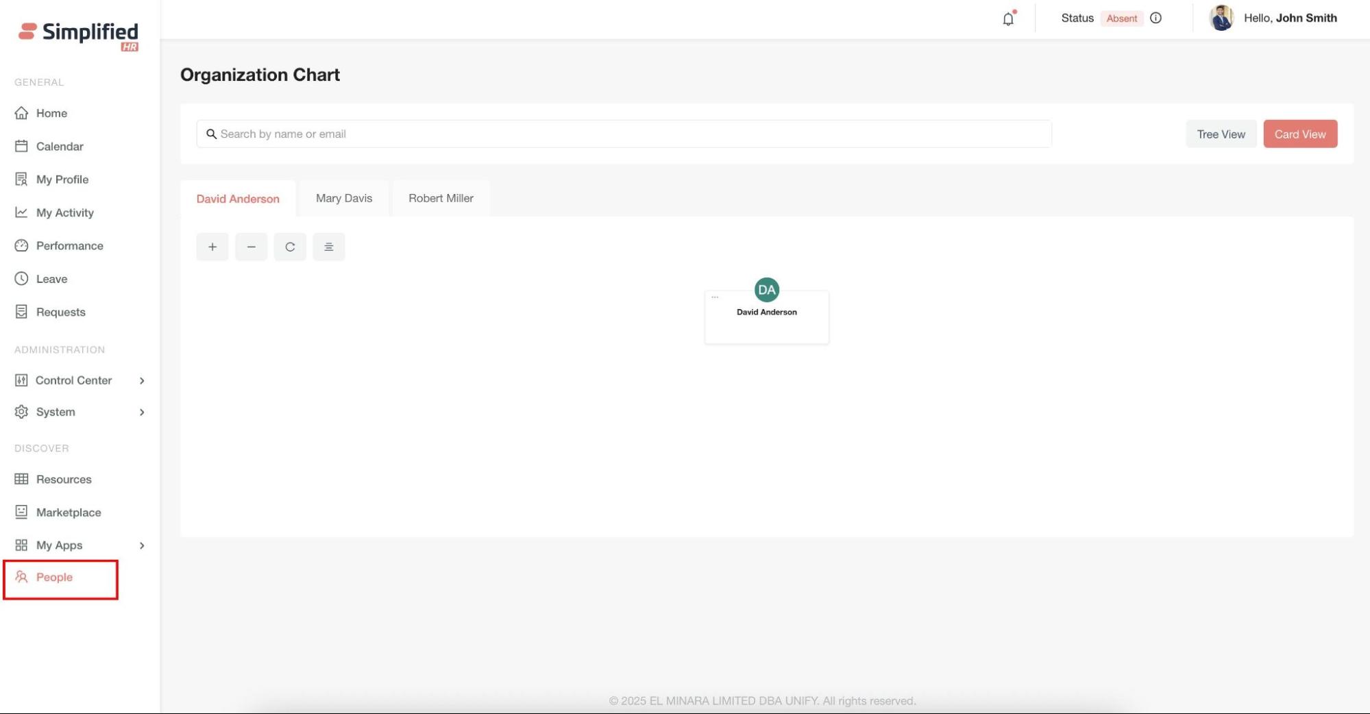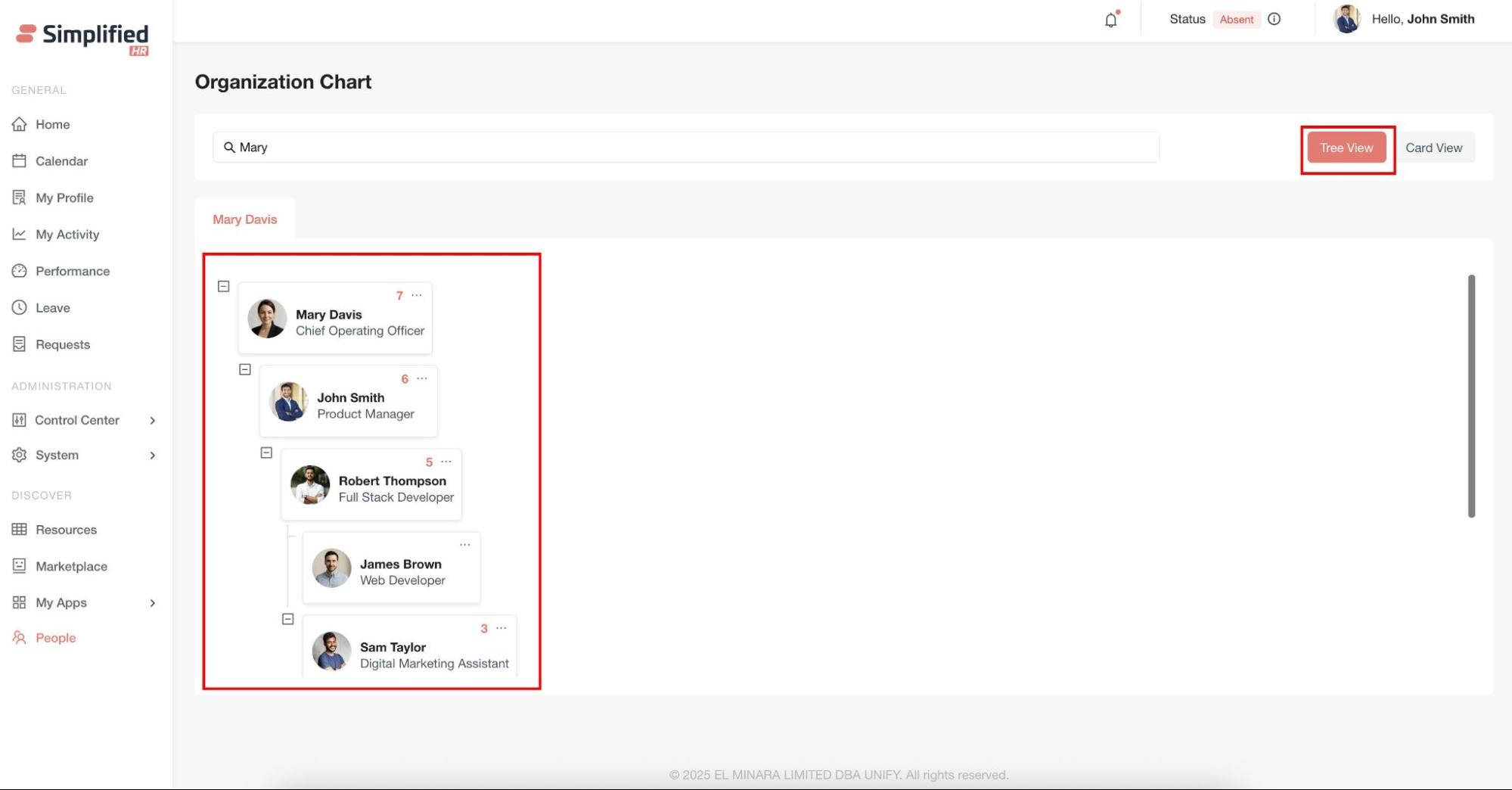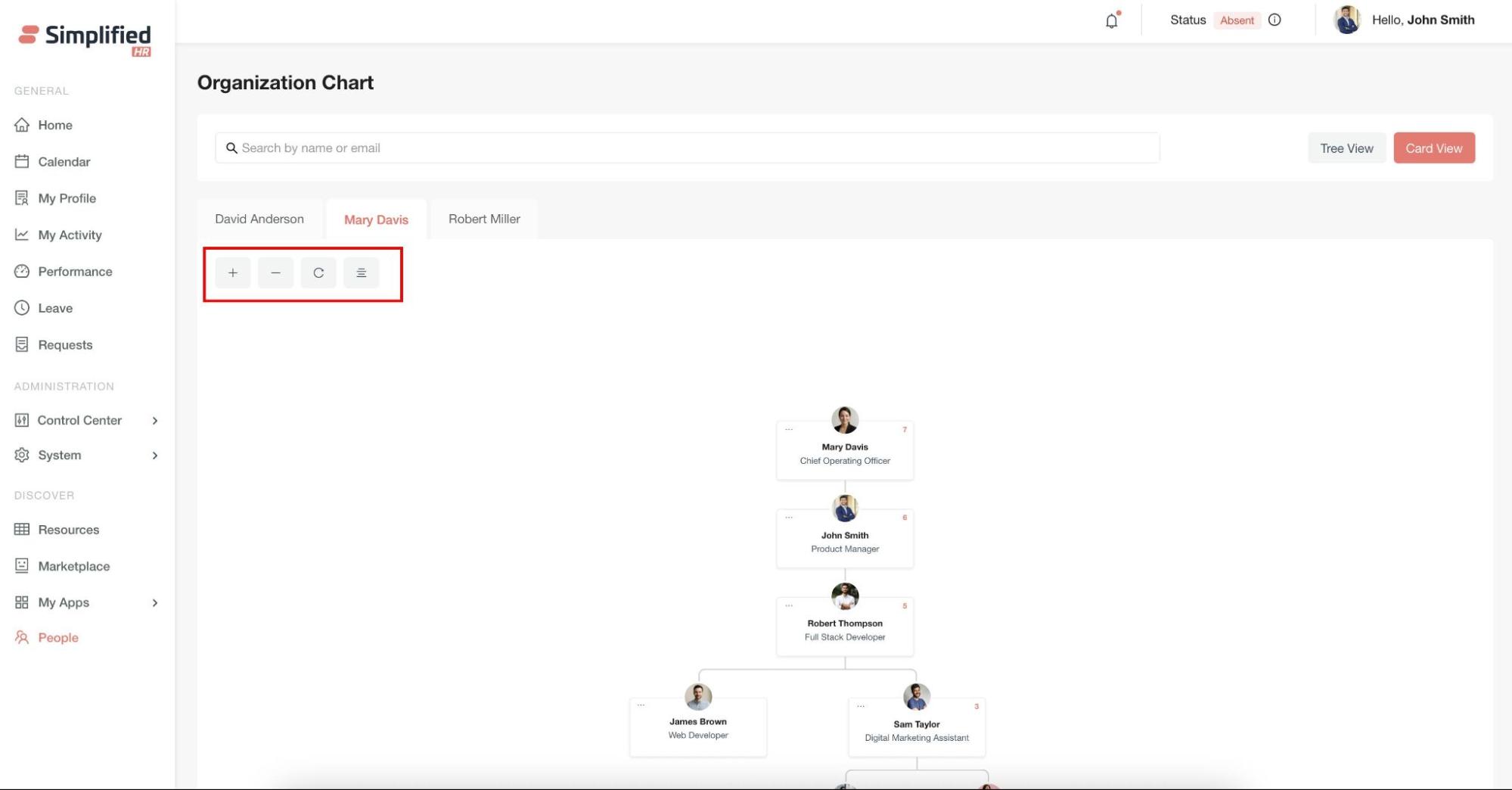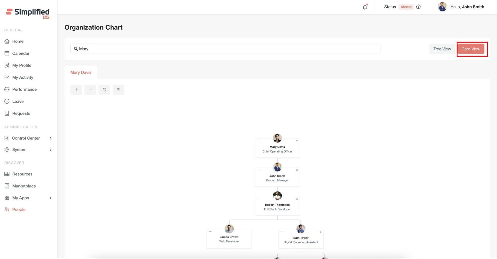 The Organization Chart offers two distinct viewing modes to suit your preferences: