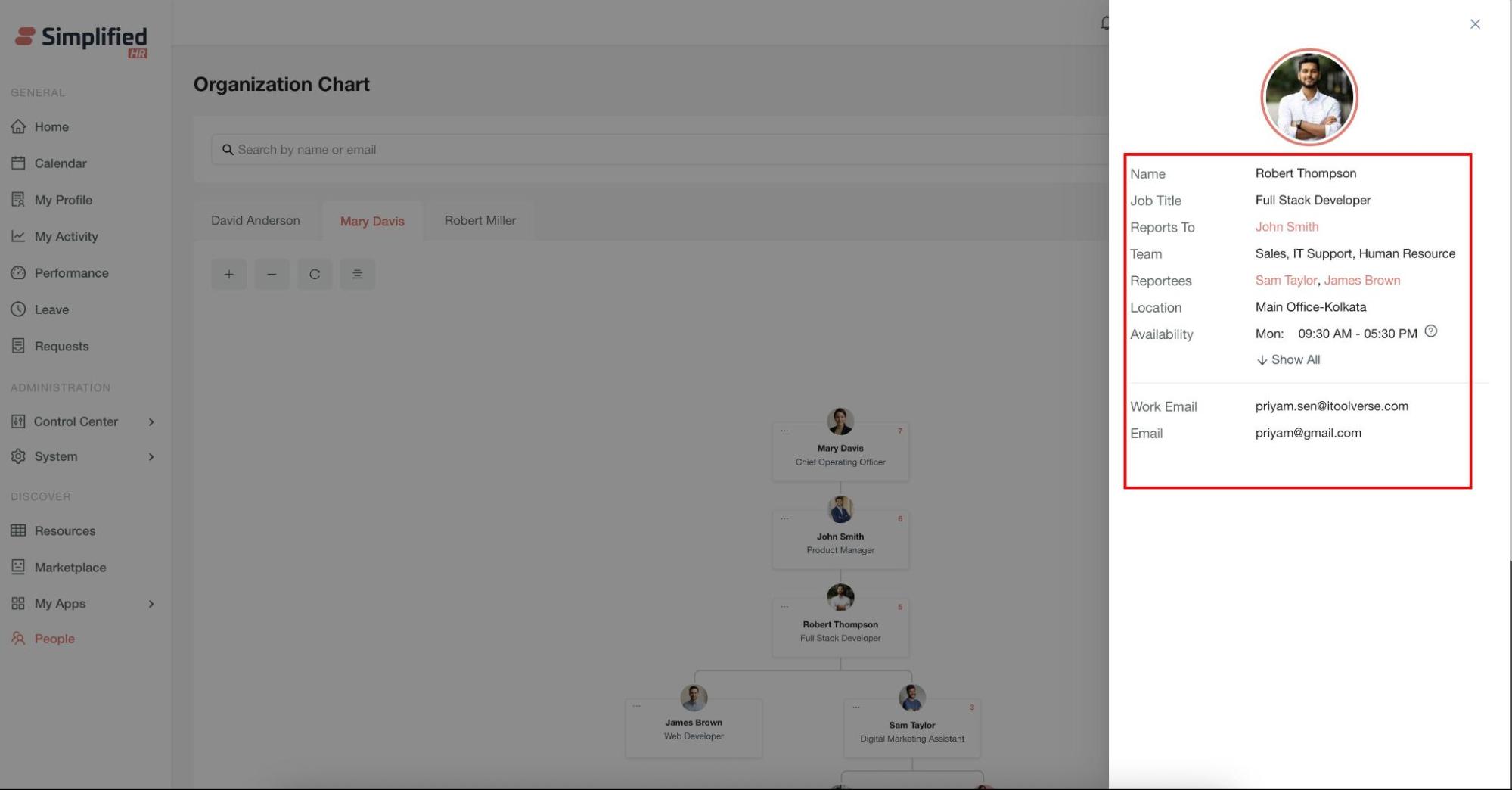 The Organization Chart provides an always up-to-date view of your company structure, making it easier to understand relationships and plan organizational changes effectively.