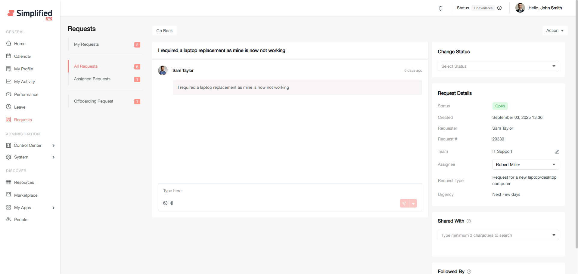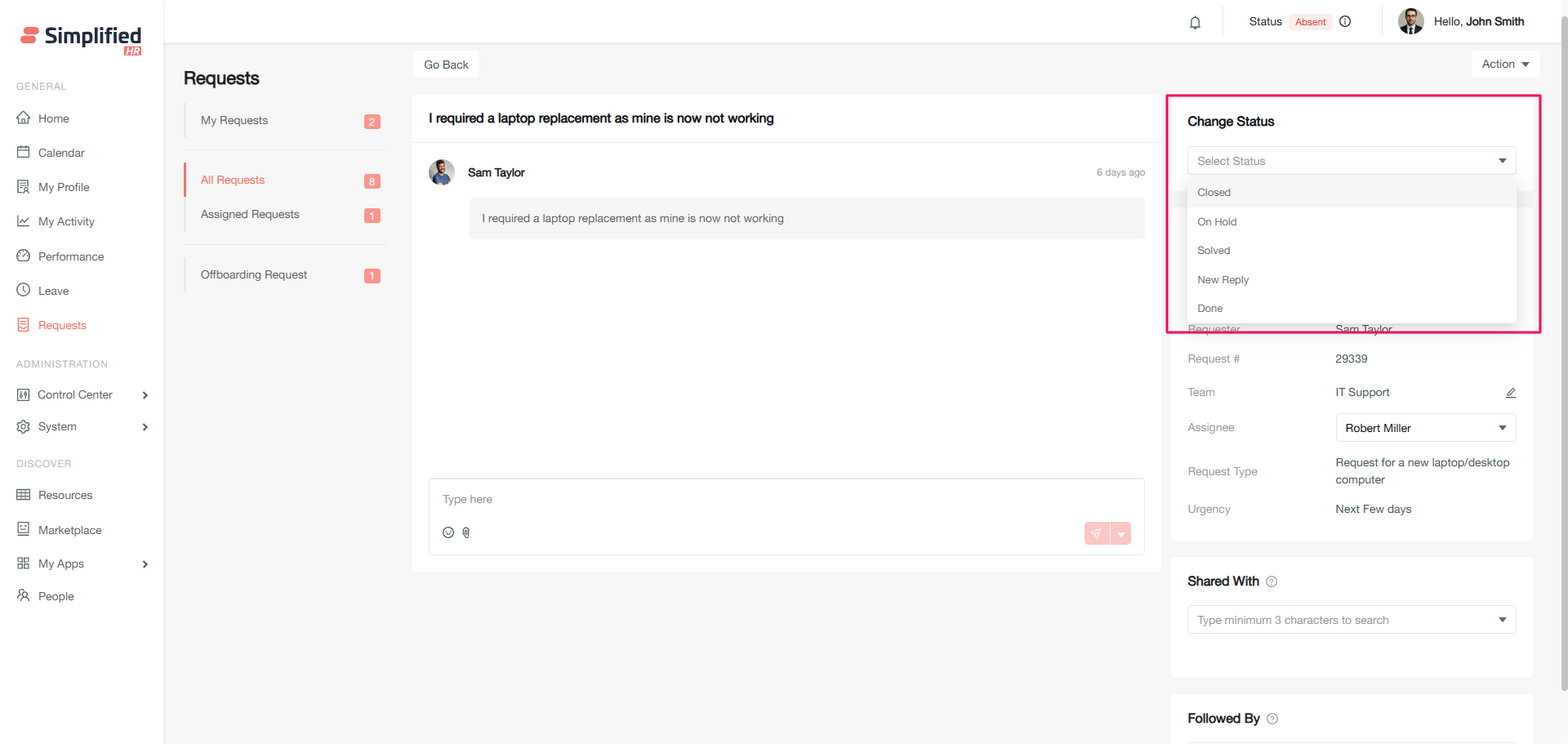 To update or modify a request, one has to click on View Request or directly click on the required Request. All updates and actions of the request can be made from this UI.