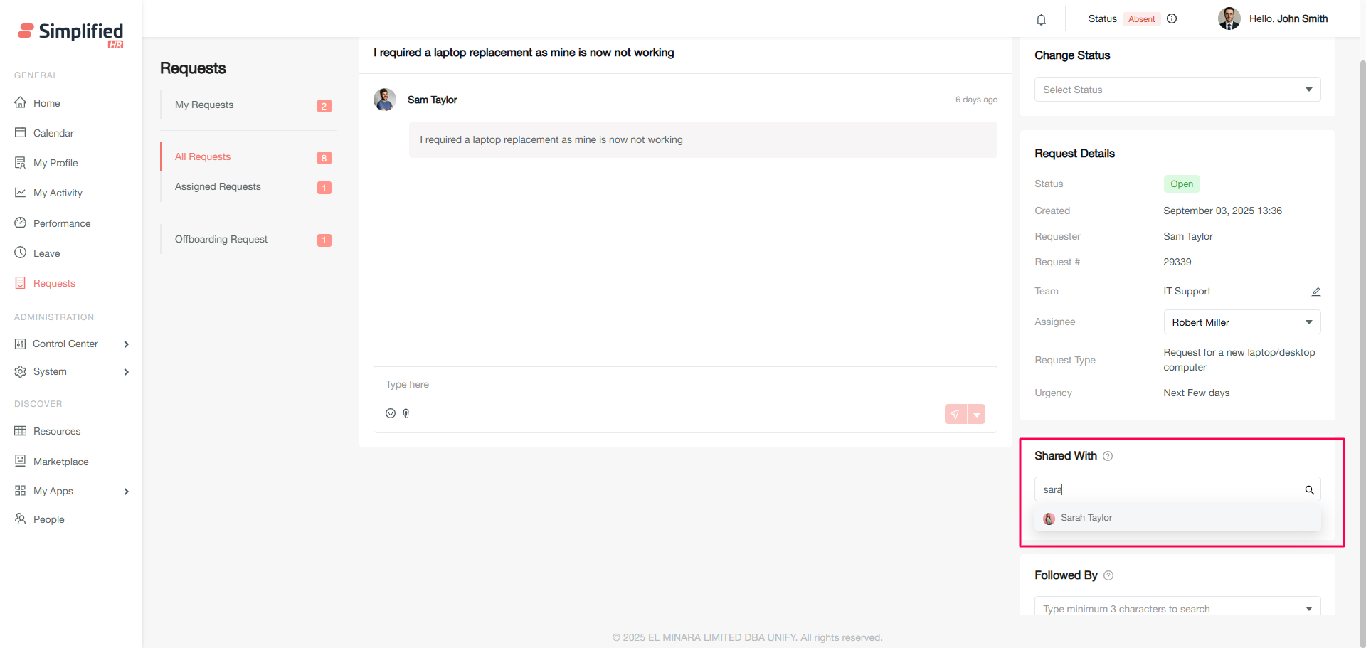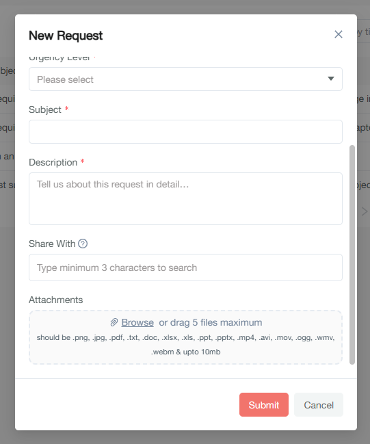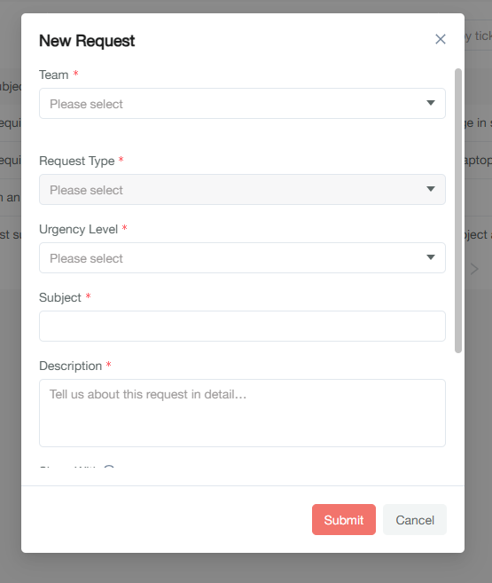 A share with field will allow you to select any relevant member to the request if needed. It's an optional field. Note: Members showing in Share with, are the members active in the organization but not the members of the current selected request team.