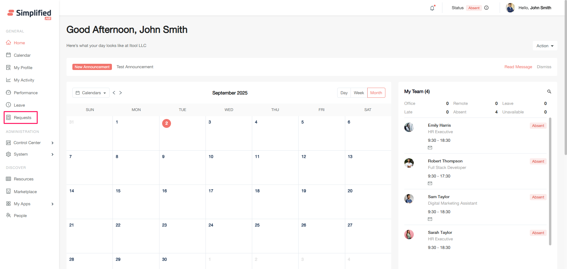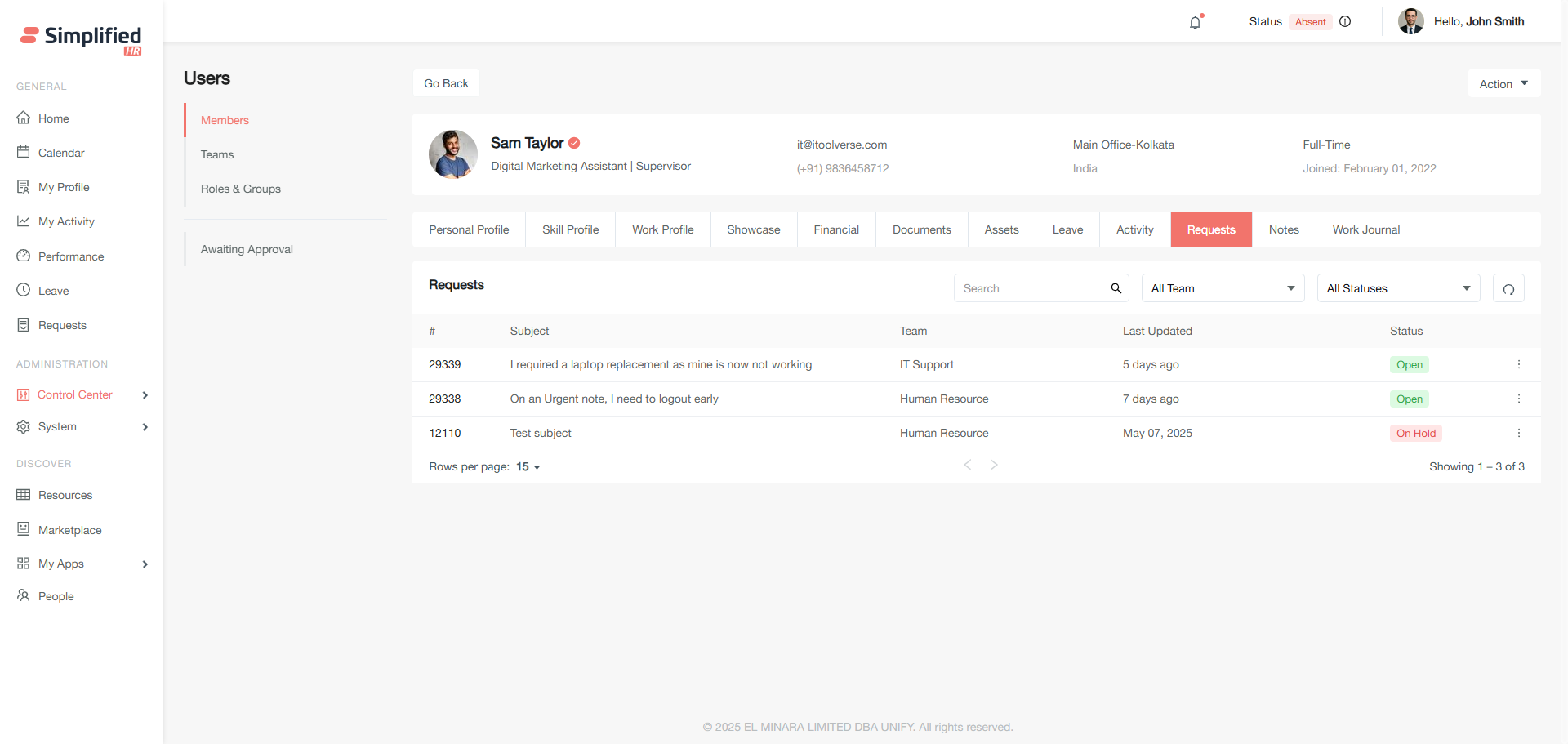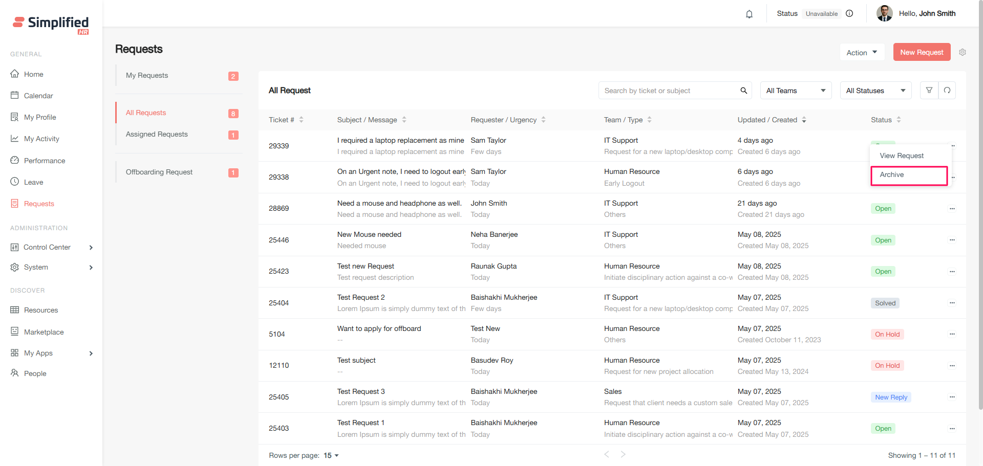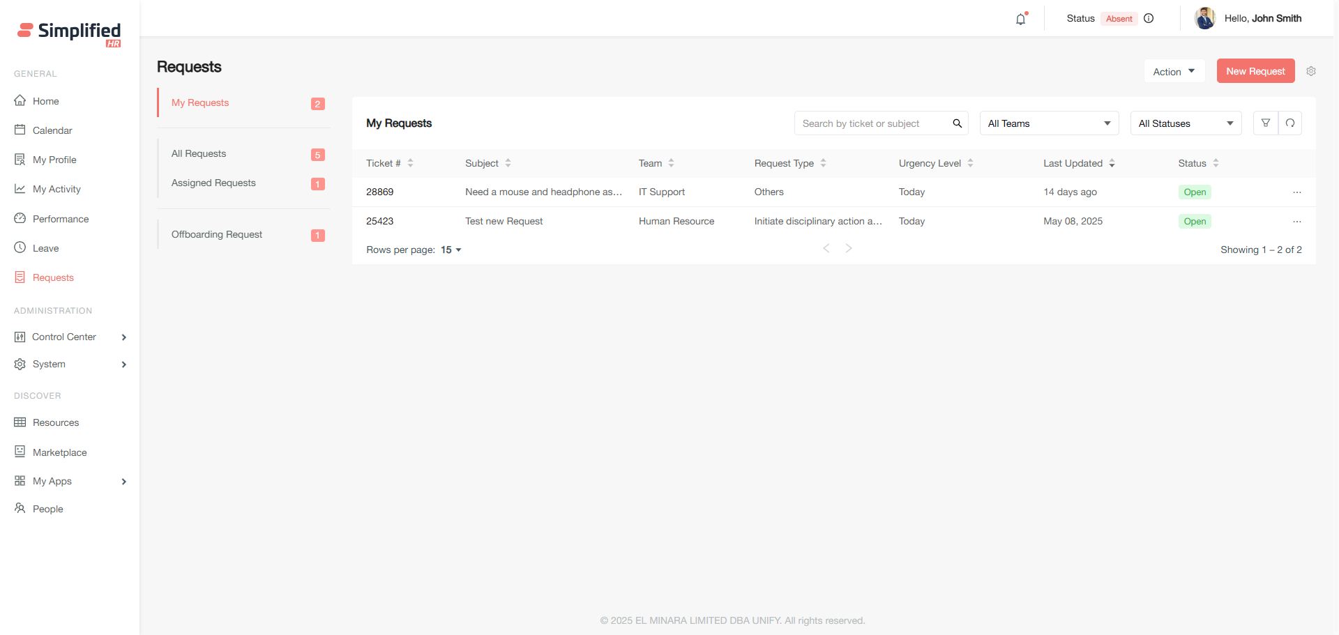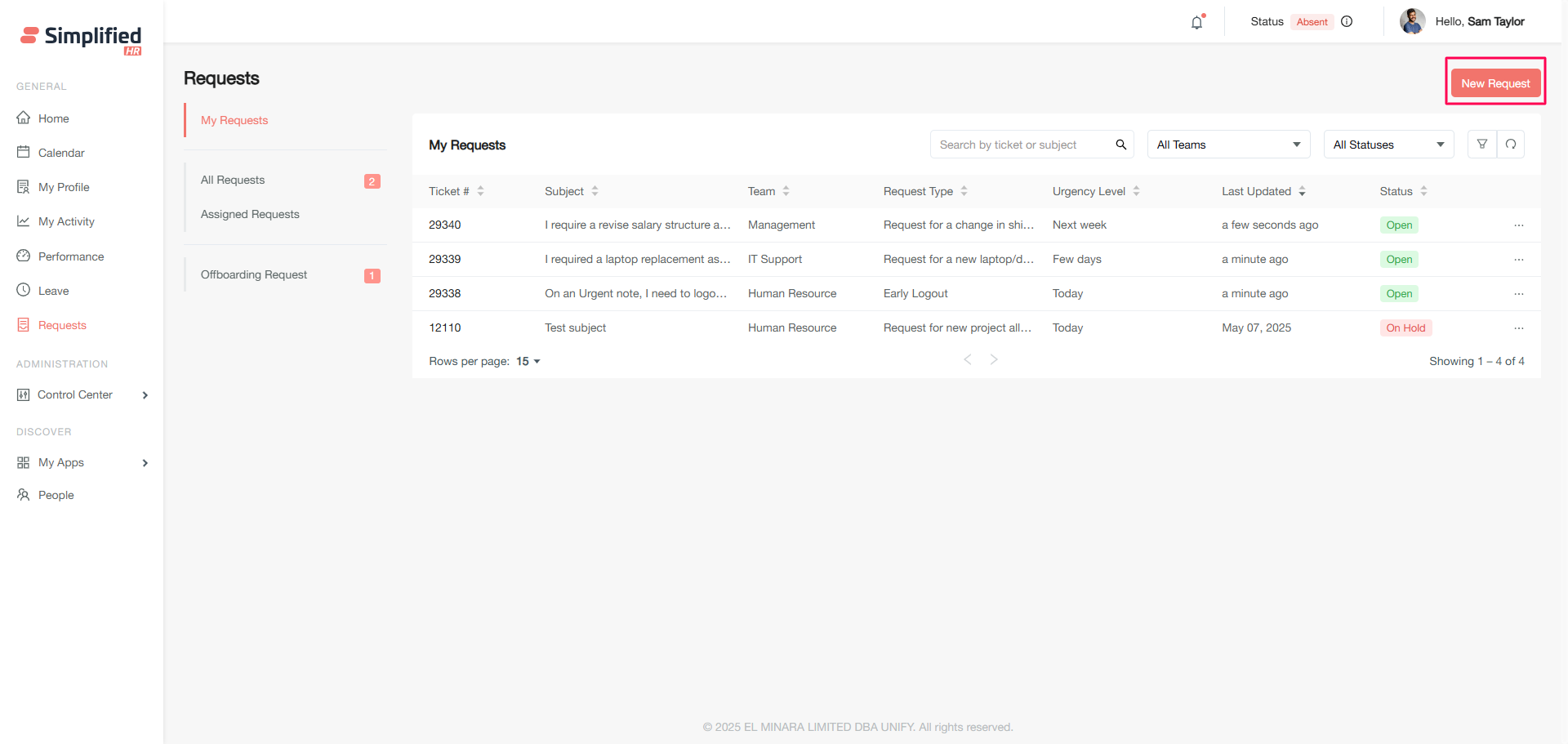 The request feature has 4 tabs where requests are organized and shown accordingly. Each request will show in tabular form with information ticket id, Subject, Team, Request Type, Urgency level, Last updated date and Request status.
