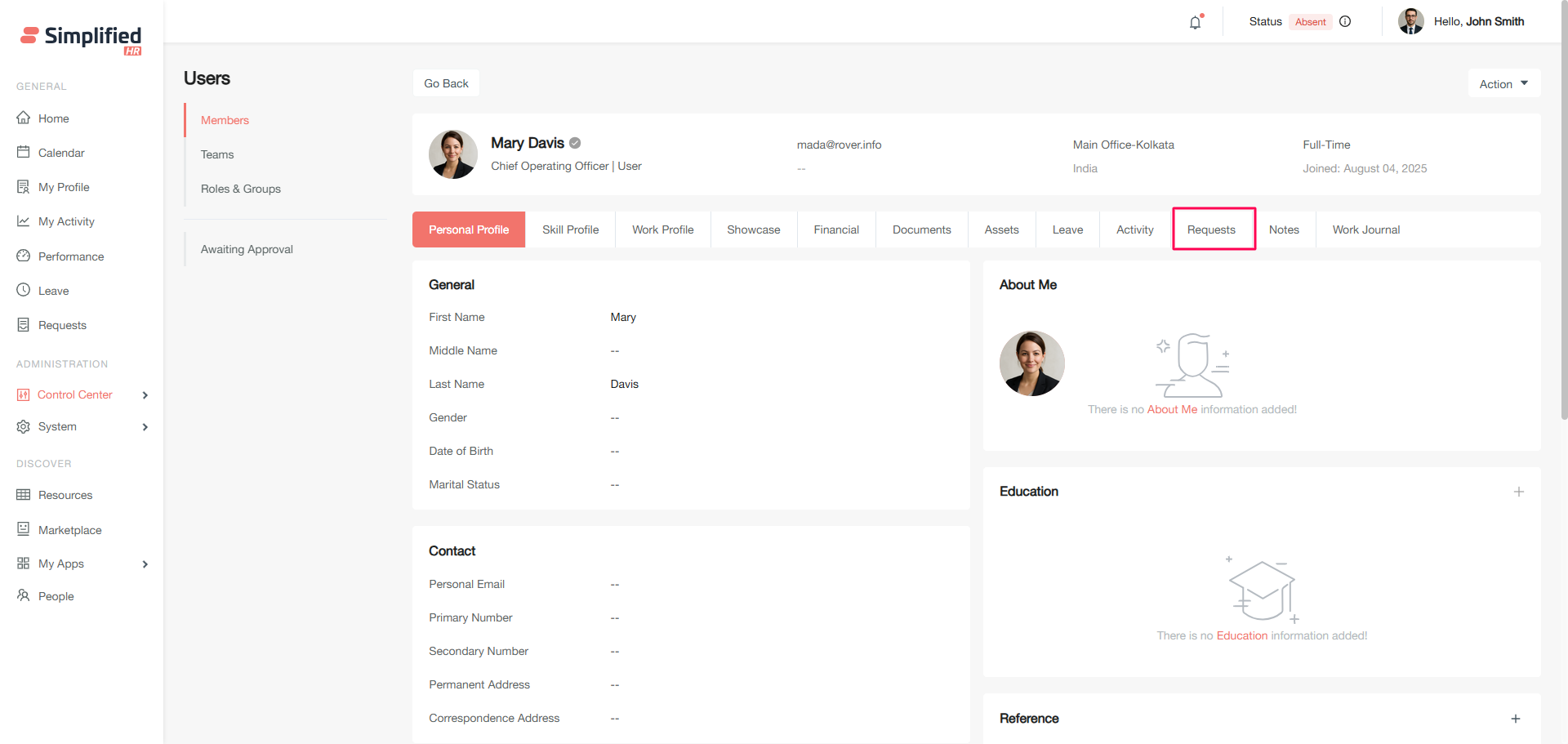 Requests can also be monitored and managed from user details by Owner, admin or similar role members in the organization using the flow Control Center > Users > View Profile > Request Tab