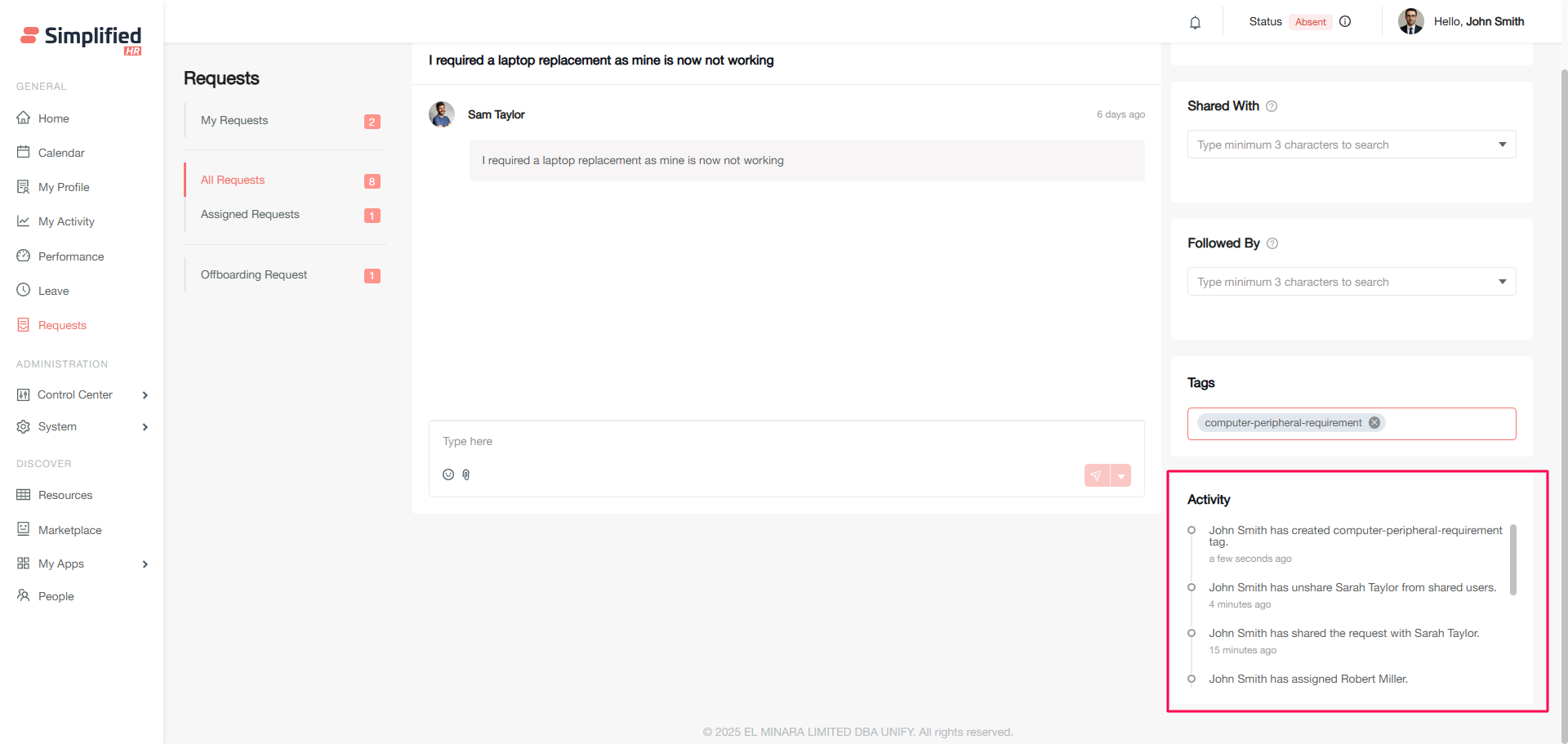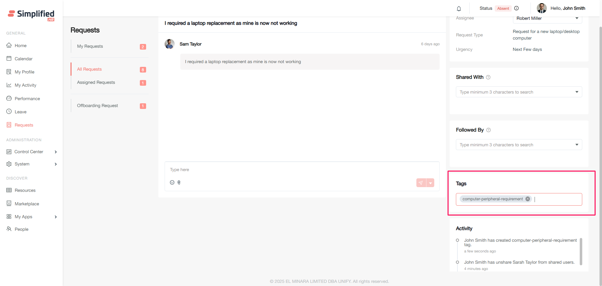 Tags: Tags are basically keywords which are optional to add in request. Tags can be added by any member who has access to a specific request.