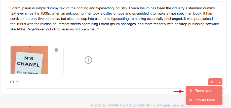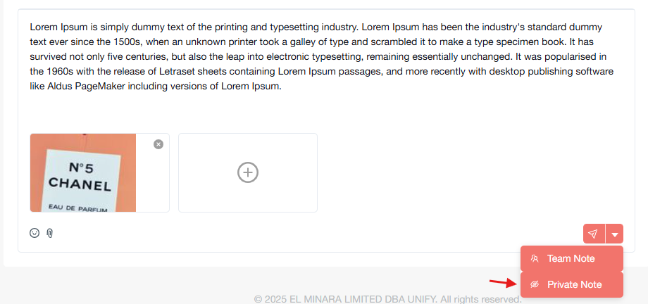 Private Note will be added to the request with attachments(if any selected. Max 5 attachments are allowed with a note)