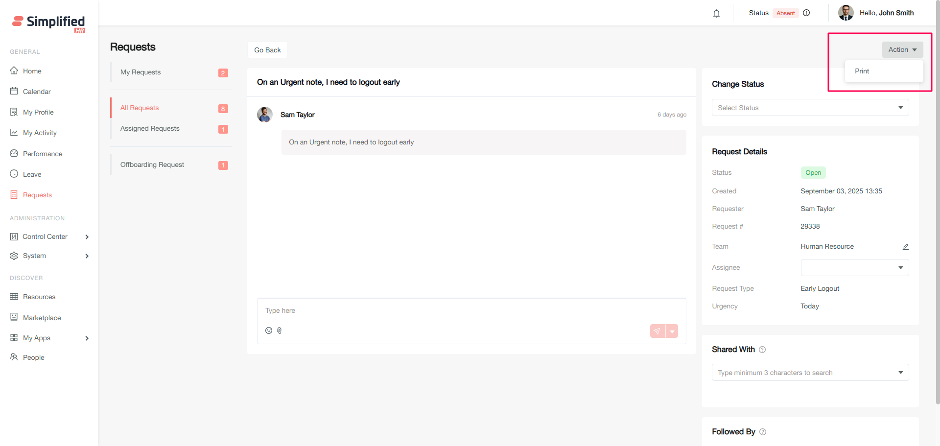 Note: Any relevant member who have access to the specific Request can take print by clicking on the Actions > Print