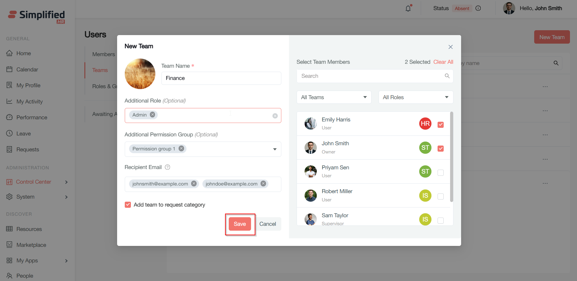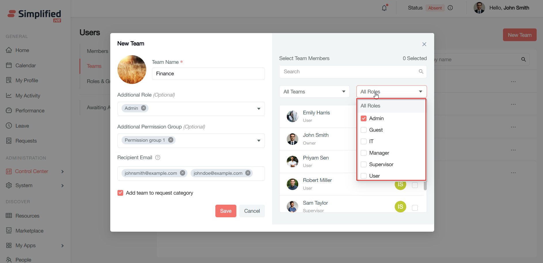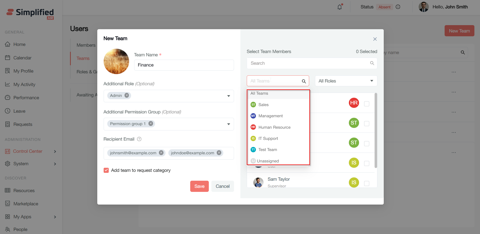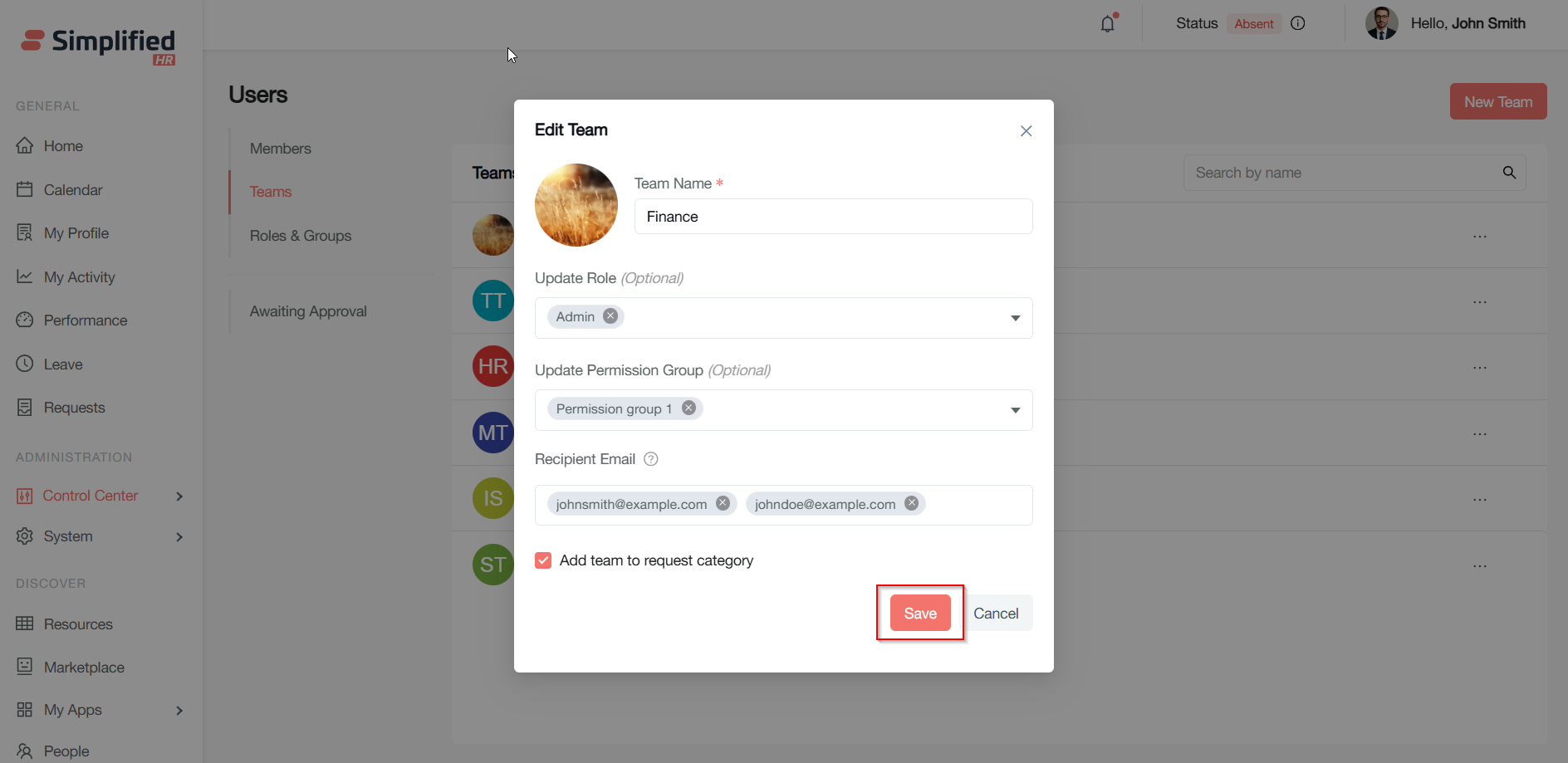 Enter one or more email addresses separated by commas to notify or invite users regarding the team. Recipients will be notified if the team is added to request categories or leave notifications.