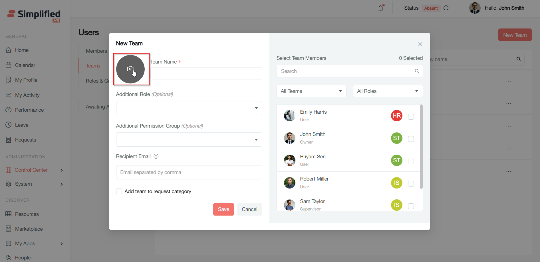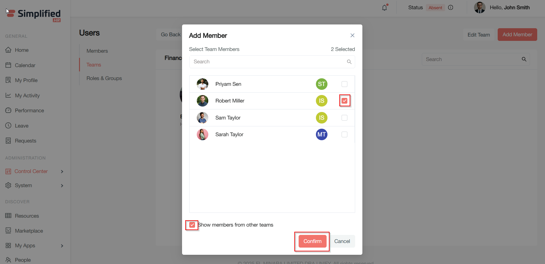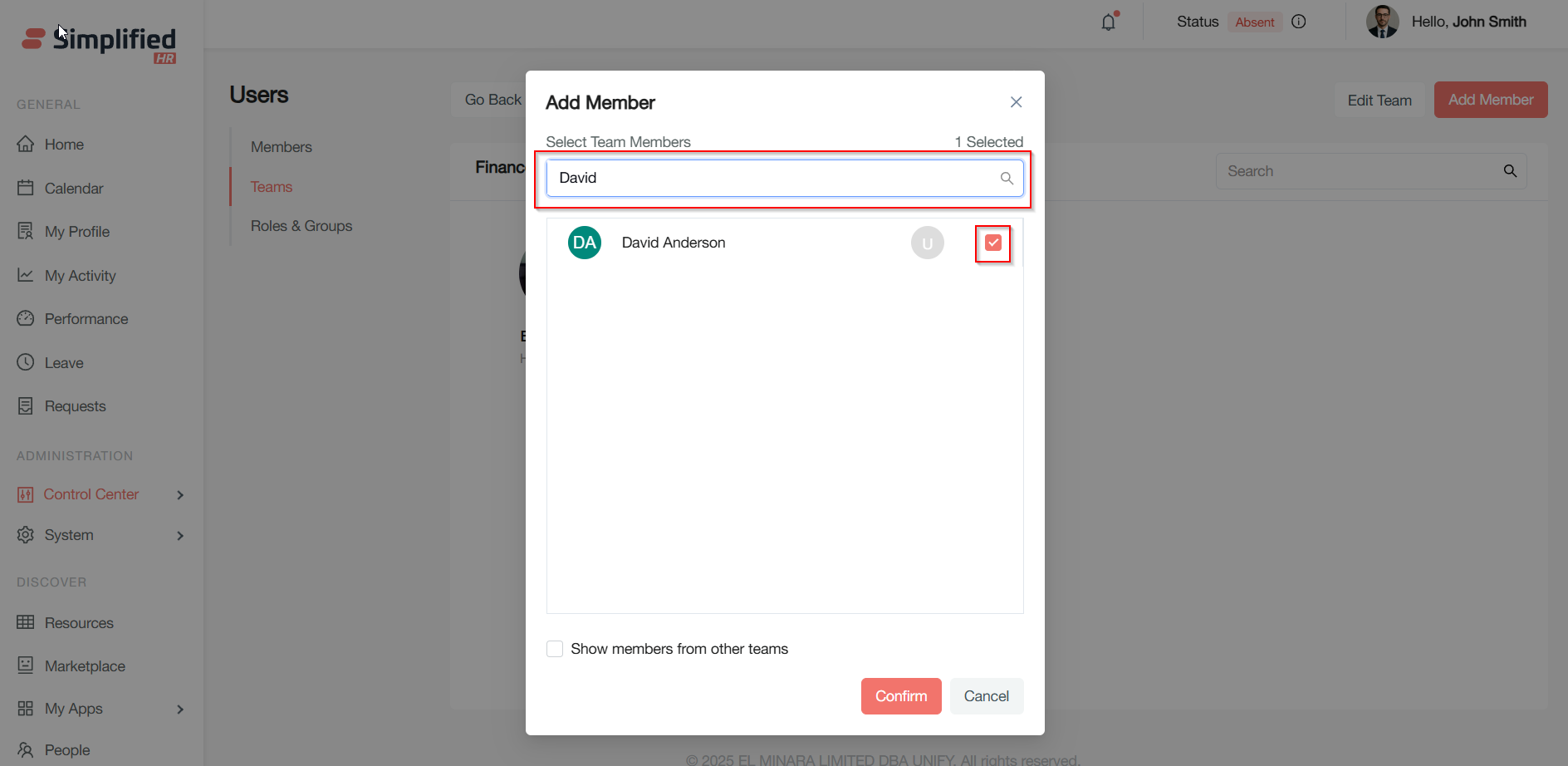 (Optional) Tick Show members from other teams to include users from other teams. If it is unchecked then only members who do not belong to any team will be shown
