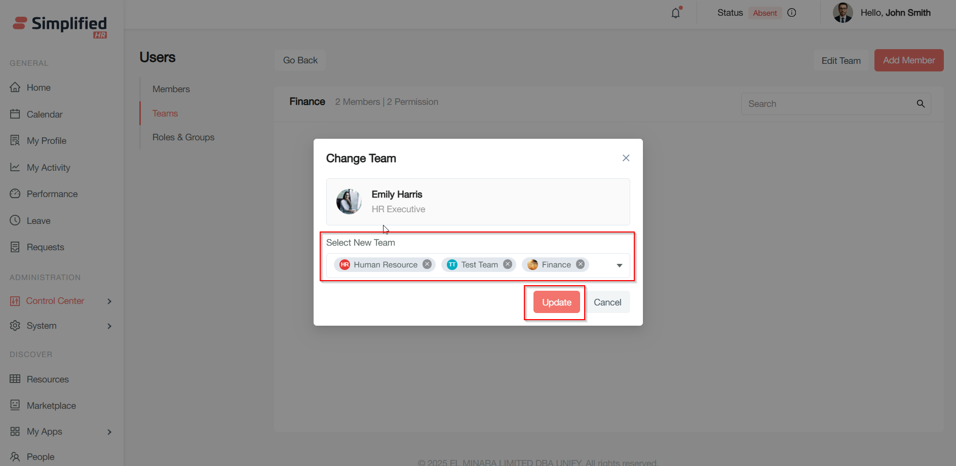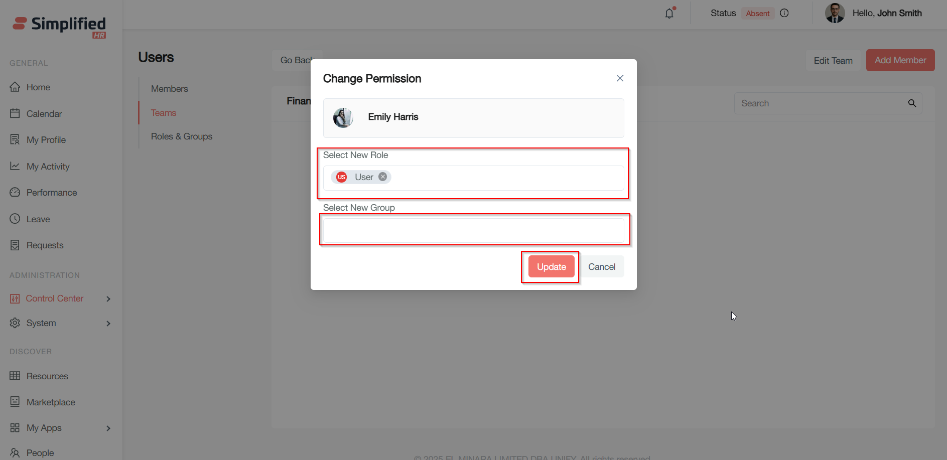 Update the role by selecting a new role from the dropdown. Similarly, update the permission group by selecting a new permission group from the dropdown. Click Update to save the changes.