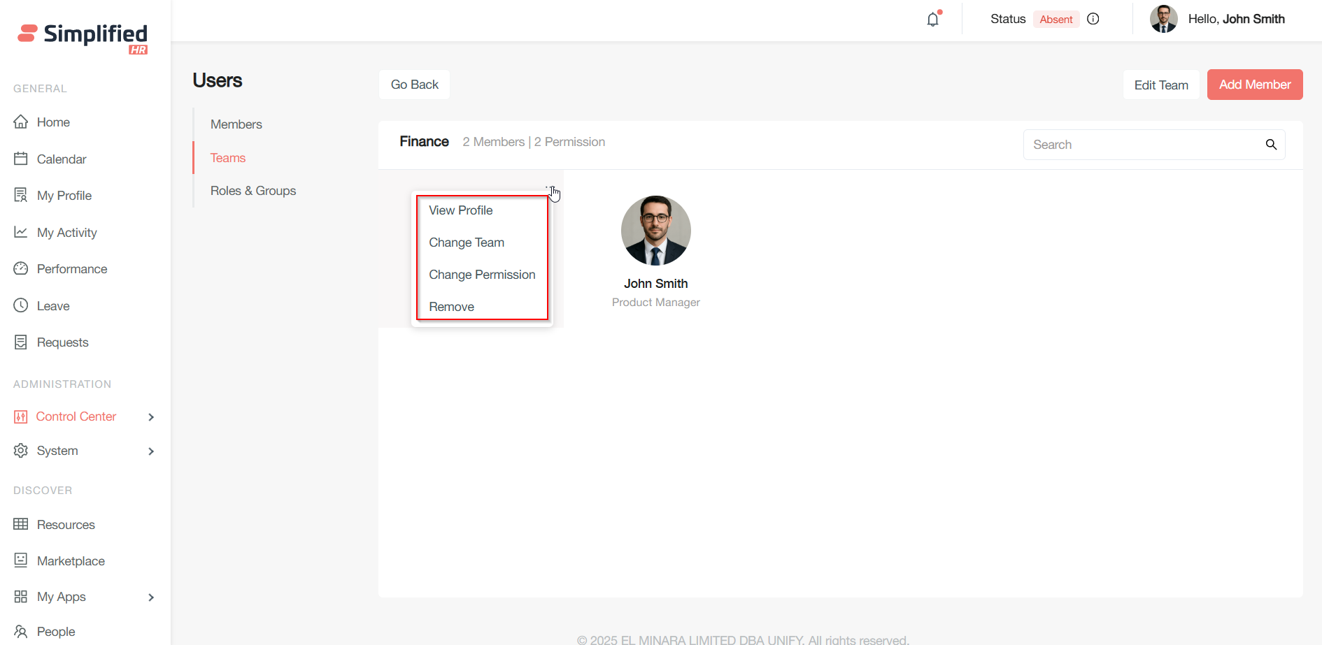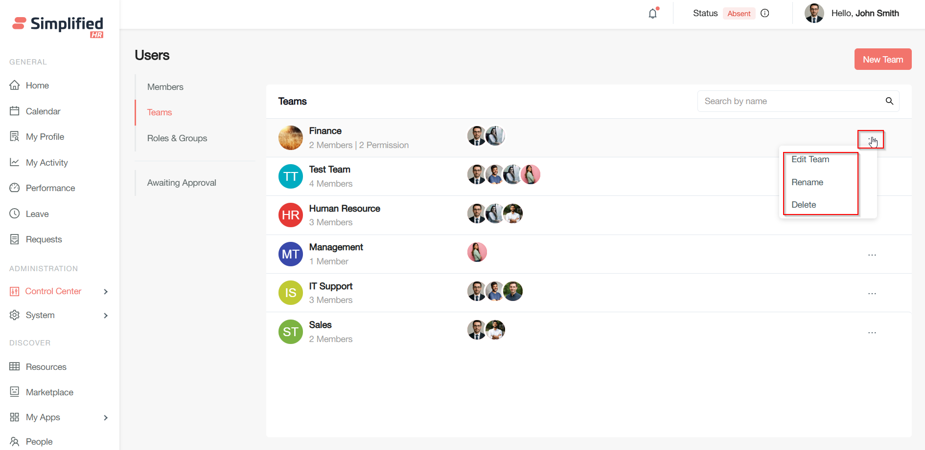 Edit team: Opens the team edit pop-up to modify fields as needed