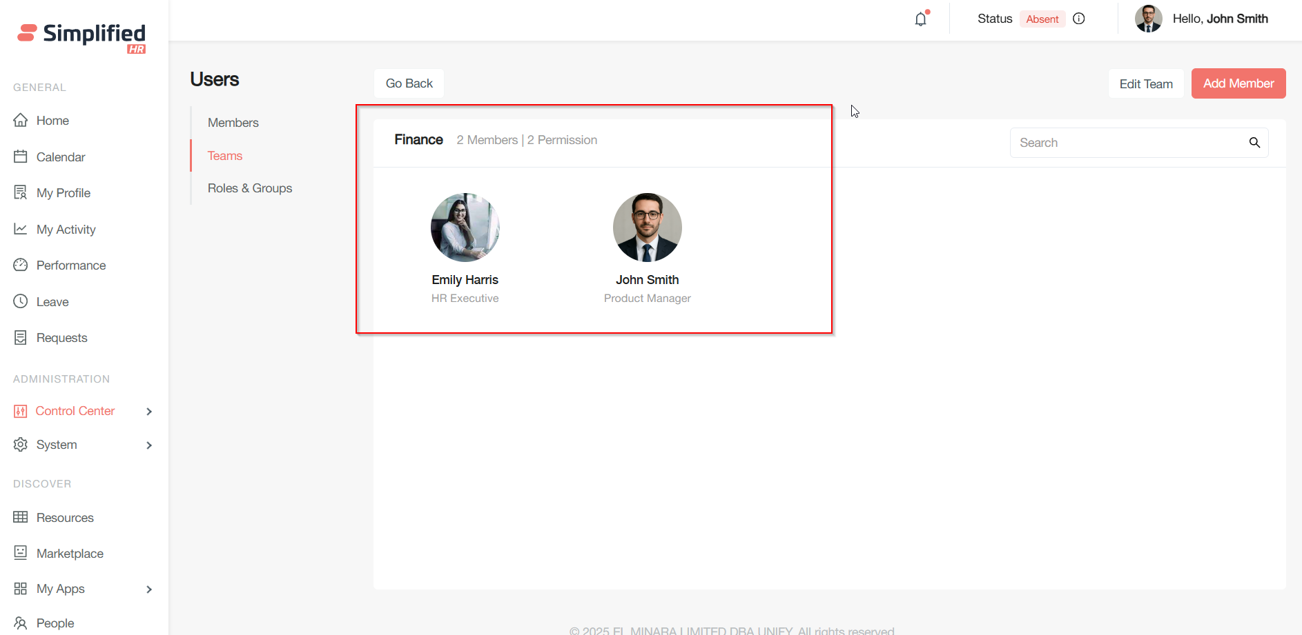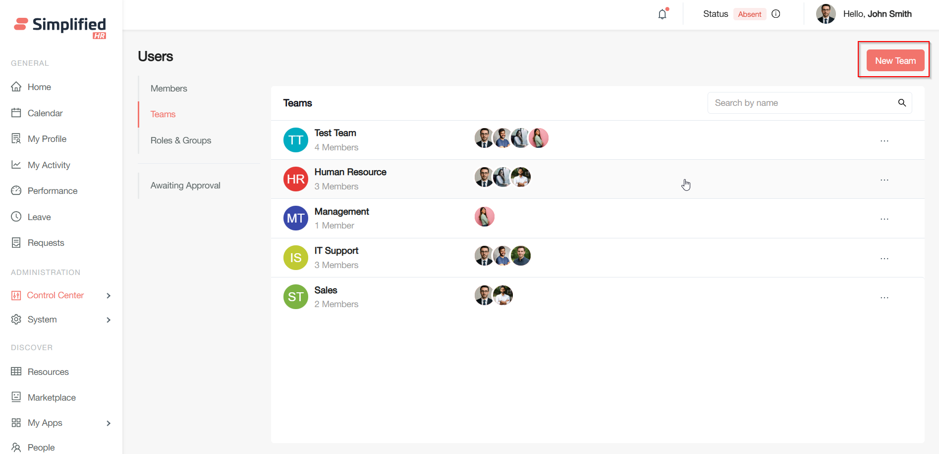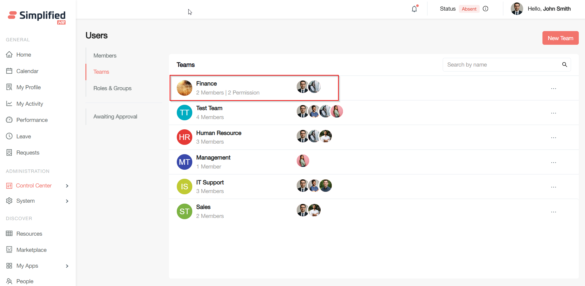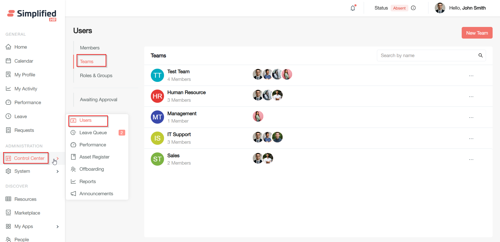 Navigate to Control Center > Users > Teams to access the Teams feature.
