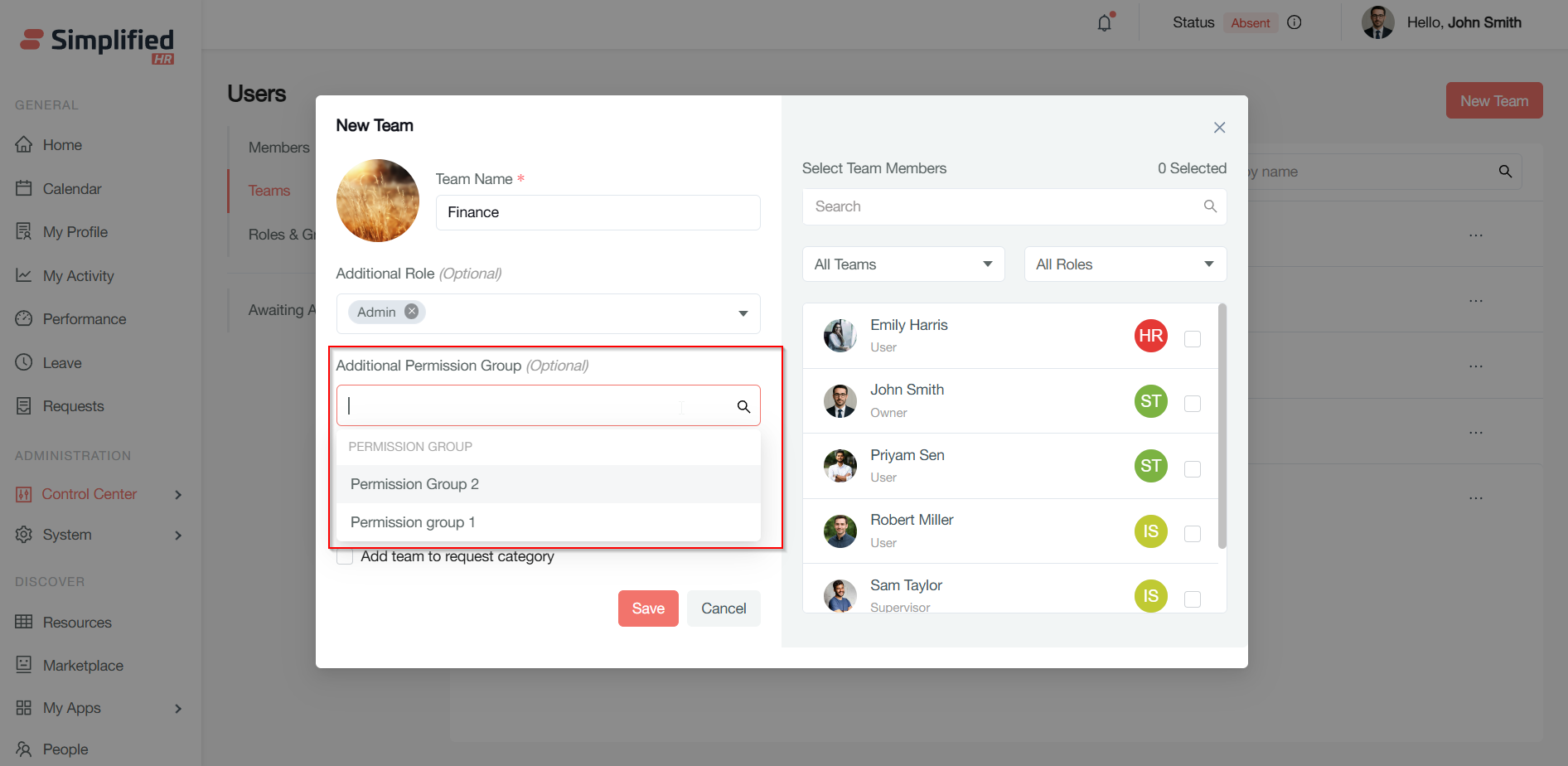 Choose a permission group to grant extra access to the team. Leave empty for default permissions. For example, grant access to "Reports" sections.