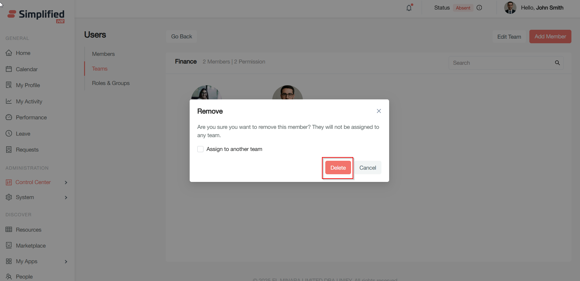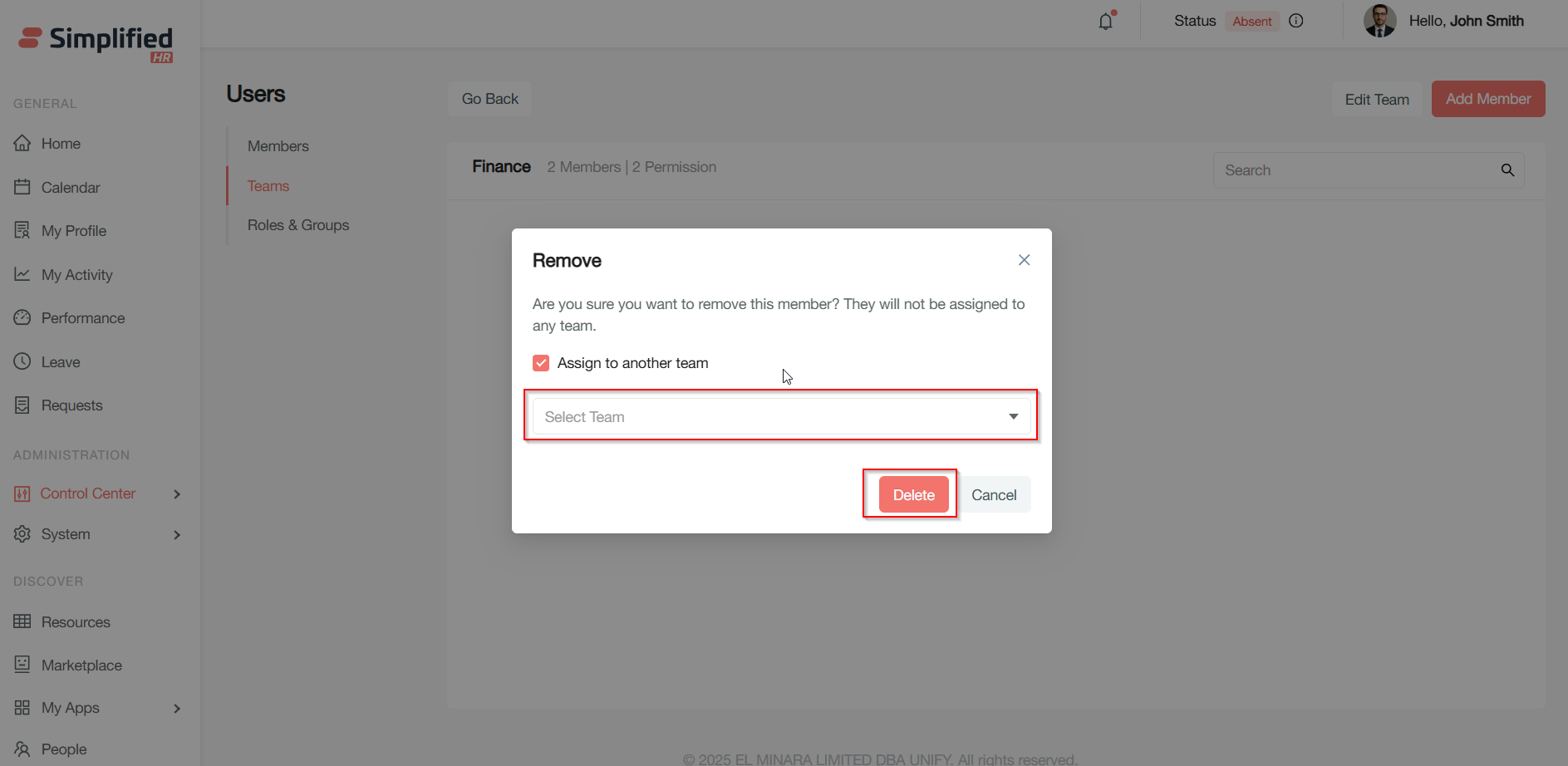 Optionally assign the member to a different team by checking Assign to another team and selecting the team