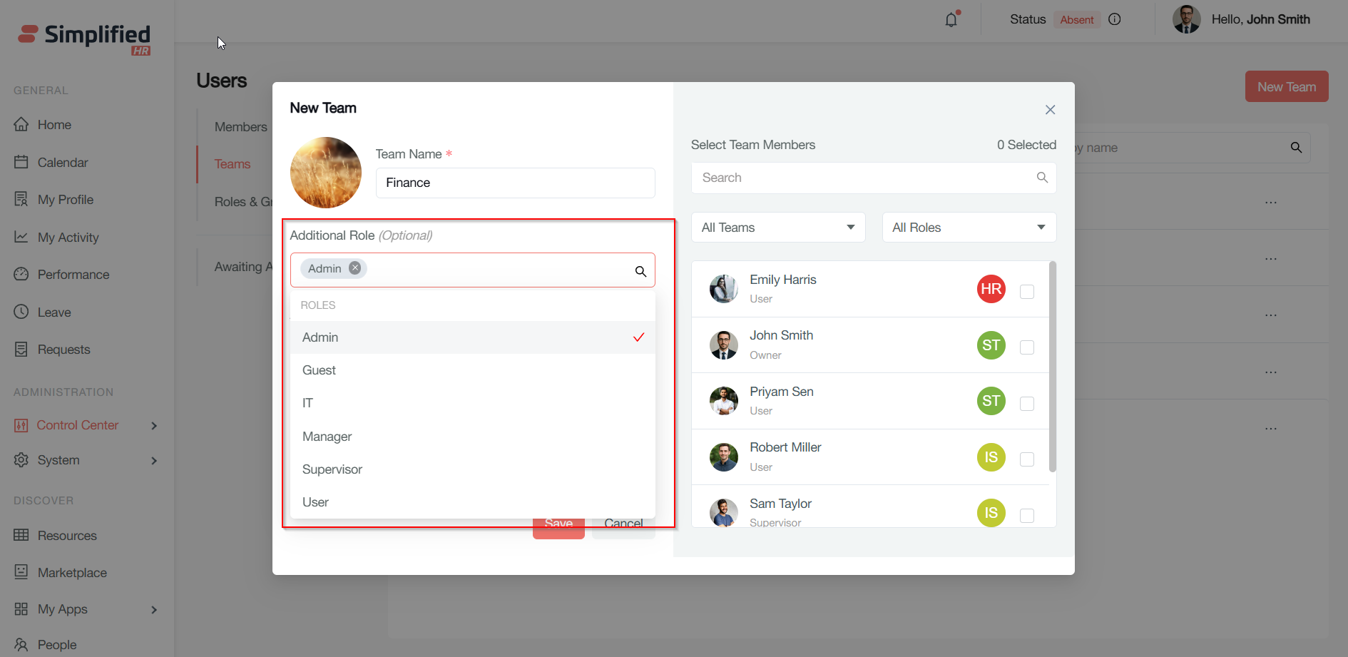 Assign an additional role to the team beyond the default roles. Select from the dropdown or leave empty if not needed. For example, assign "Admin" privileges to all team members.